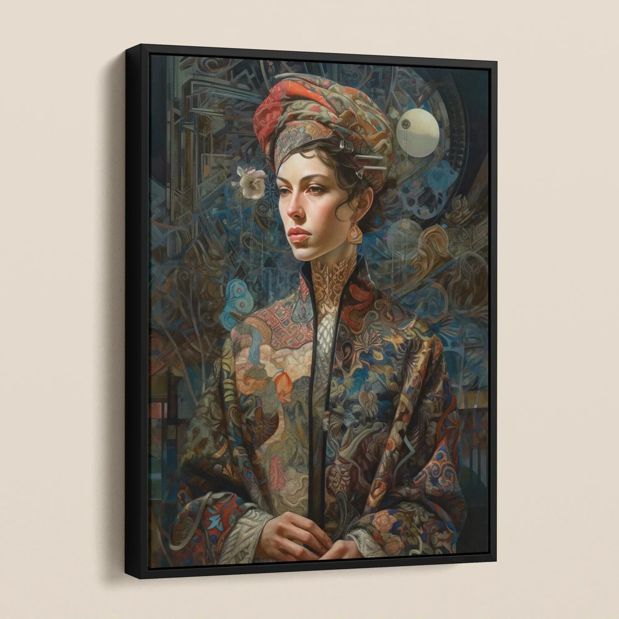 I suoi abiti—intessuti con filigrana dorata e bestie mitiche—non sono semplici tessuti ma una mappa della memoria ancestrale. I sigilli della mitologia norrena si attorcigliano attraverso fili ricamati, il loro significato è oscuro, in attesa. In sottofondo, ingranaggi fumanti, i resti di una civiltà perduta o i progetti di un'epoca ancora da venire. Qui, fantasia e folklore si scontrano, un capolavoro di arte murale steampunk eterea che non si limita ad adornare—ma cattura.