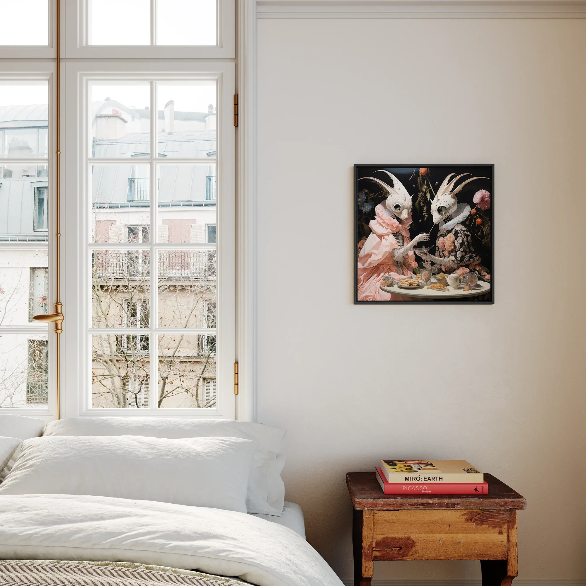 Un surreale tea party gotico, sospeso nel silenzio liminale tra decadenza e delirio. Due aristocratici insettoidi, avvolti in moda aliena barocca, si fissano negli occhi—neri, riflettenti, insondabili. Un'unica offerta: un delicato, inquietante boccone, sospeso tra i loro artigli guantati di pizzo. Lowbrow arte fantasy avvolta nelle sete di una corte dimenticata.