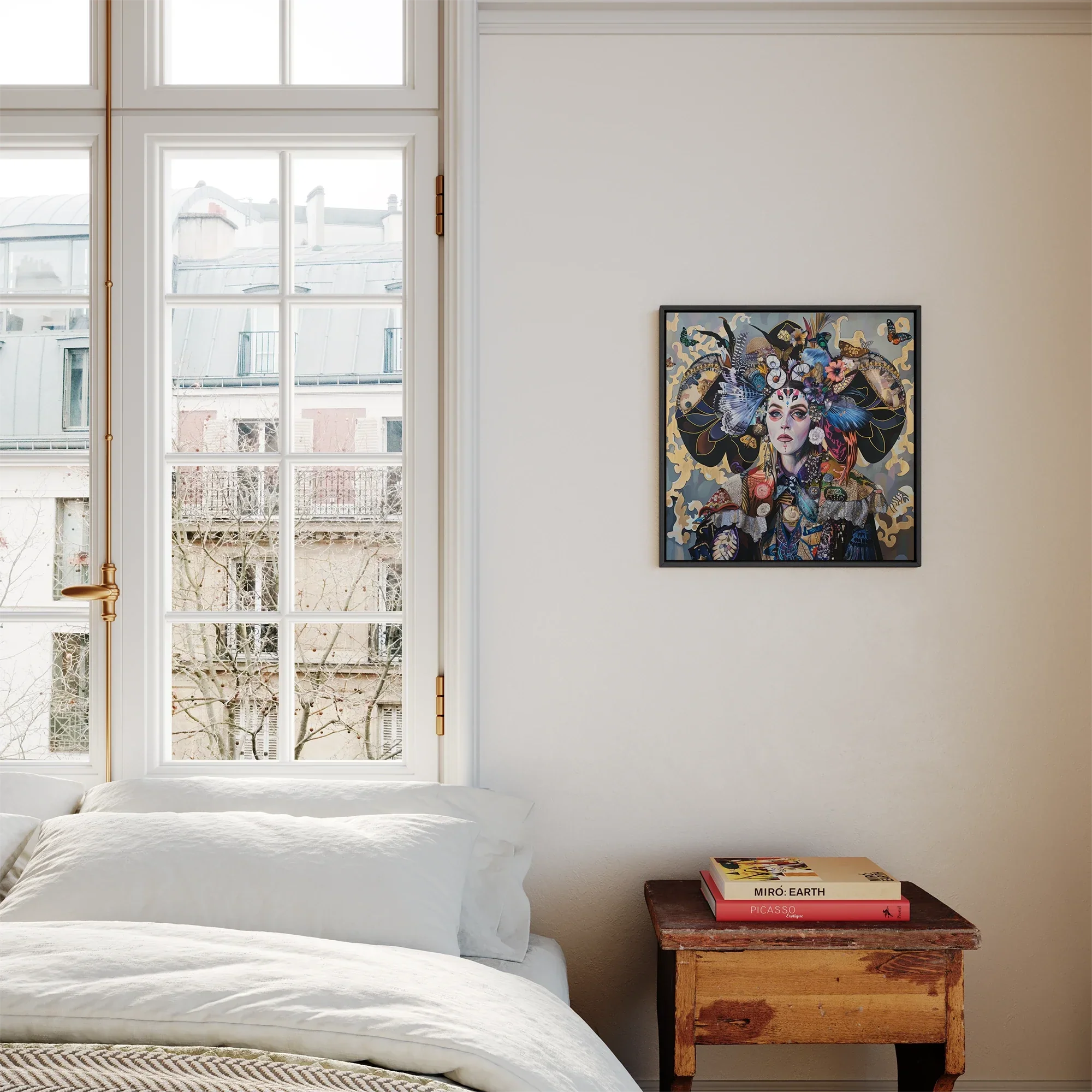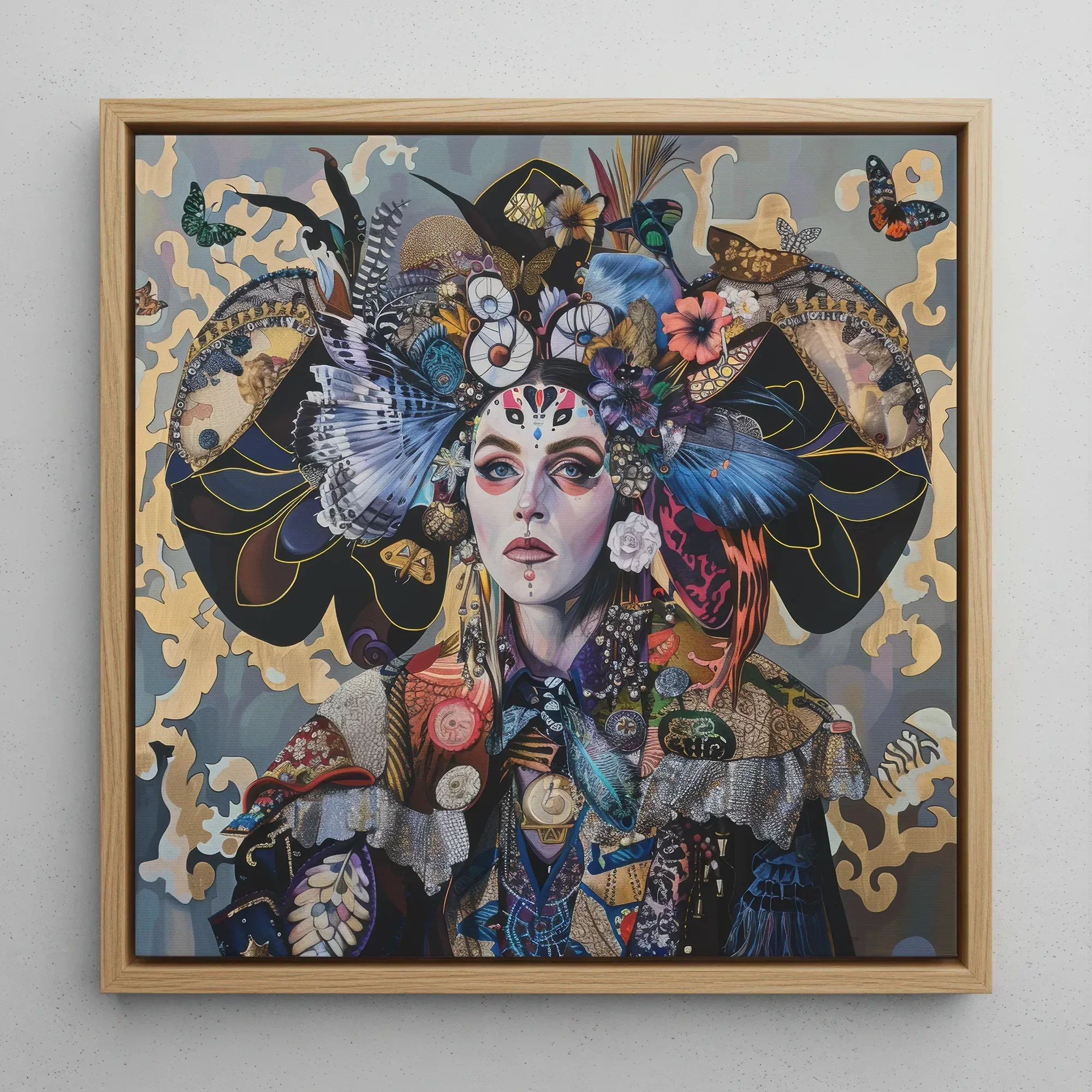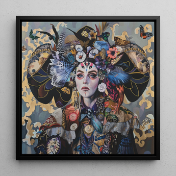 Strati di texture pulsano di energia—ricami ornati, ciondoli celesti, il morbido decadimento di fiori pressati tra i regni. Questa opera d'arte surrealista sfuma i confini del passato e del futuro, dell'illusione e della verità. È una reliquia del mondo dei sogni, un enigma avvolto in oro e ombra.