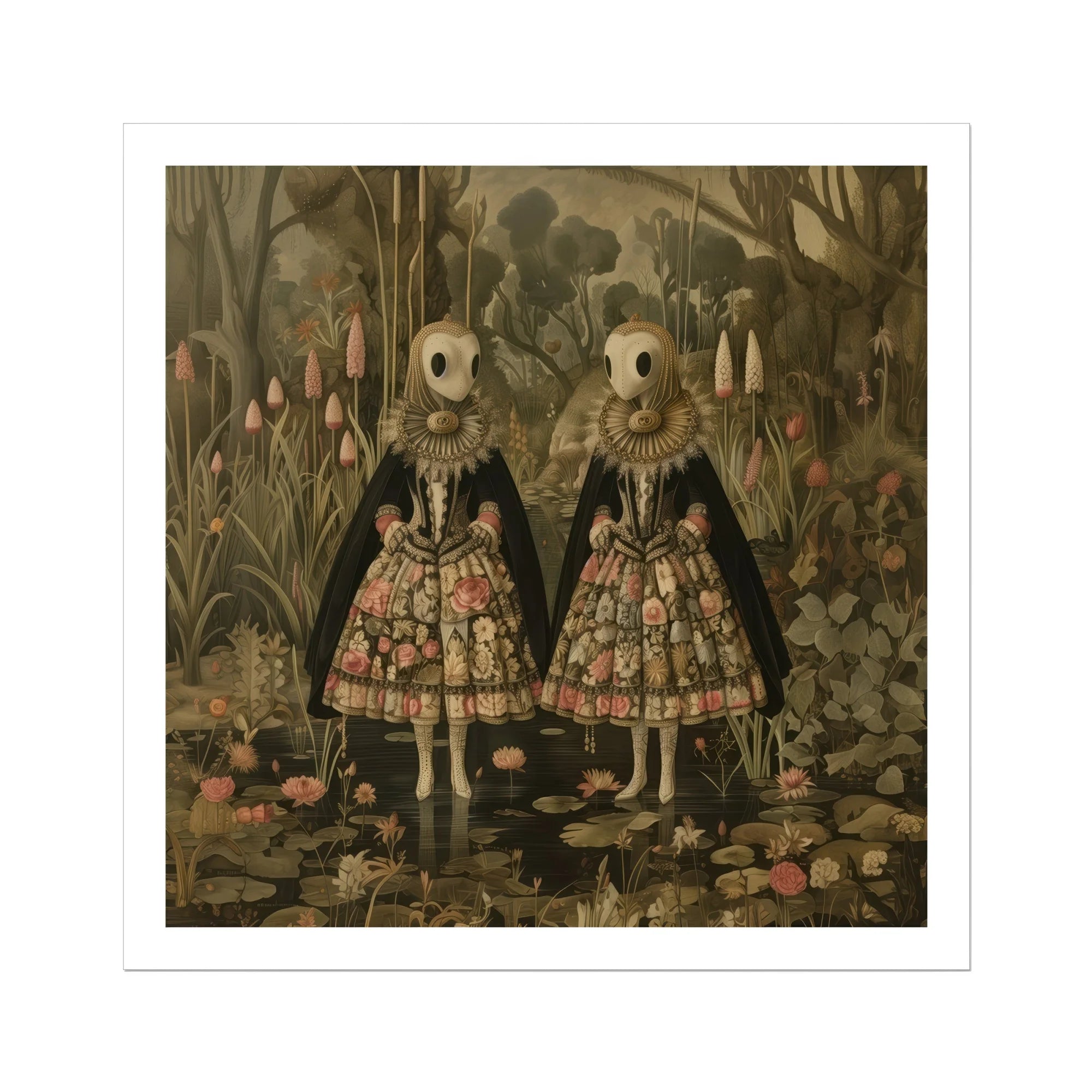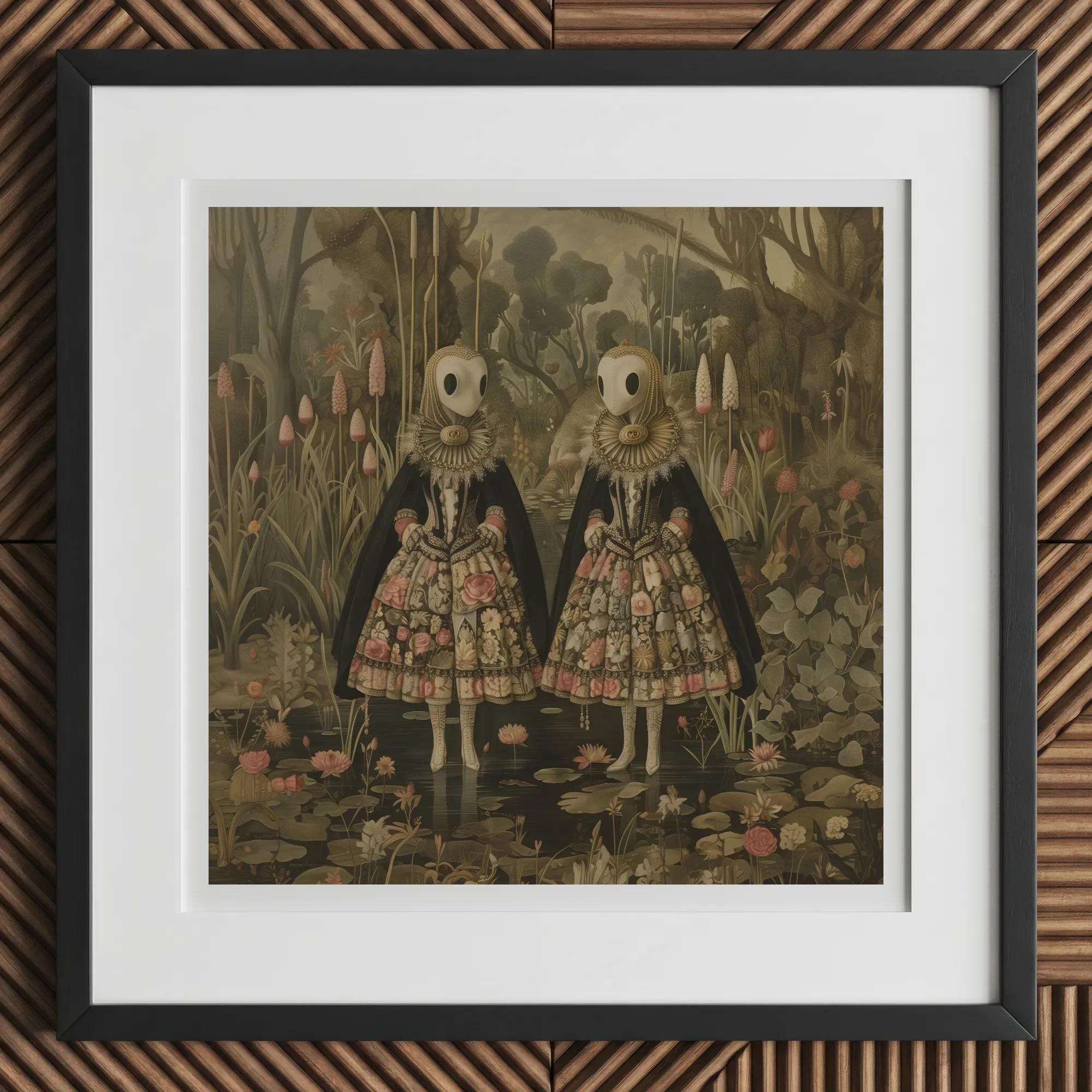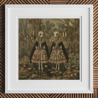 Sono tutori di una dimensione dimenticata. Stare in piedi in acque scure che riflettono più di una foresta di sogni rovesciati. Questo è un luogo in cui Whimsy incontra l'extraterrestre. E questo surreale La stampa d'arte aliena ti porta in quello spazio liminale, una miscela ossessionante di innocenza e stranezza.