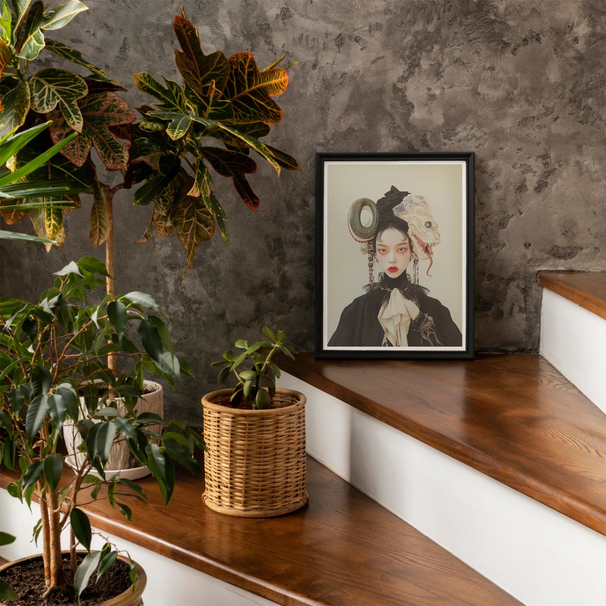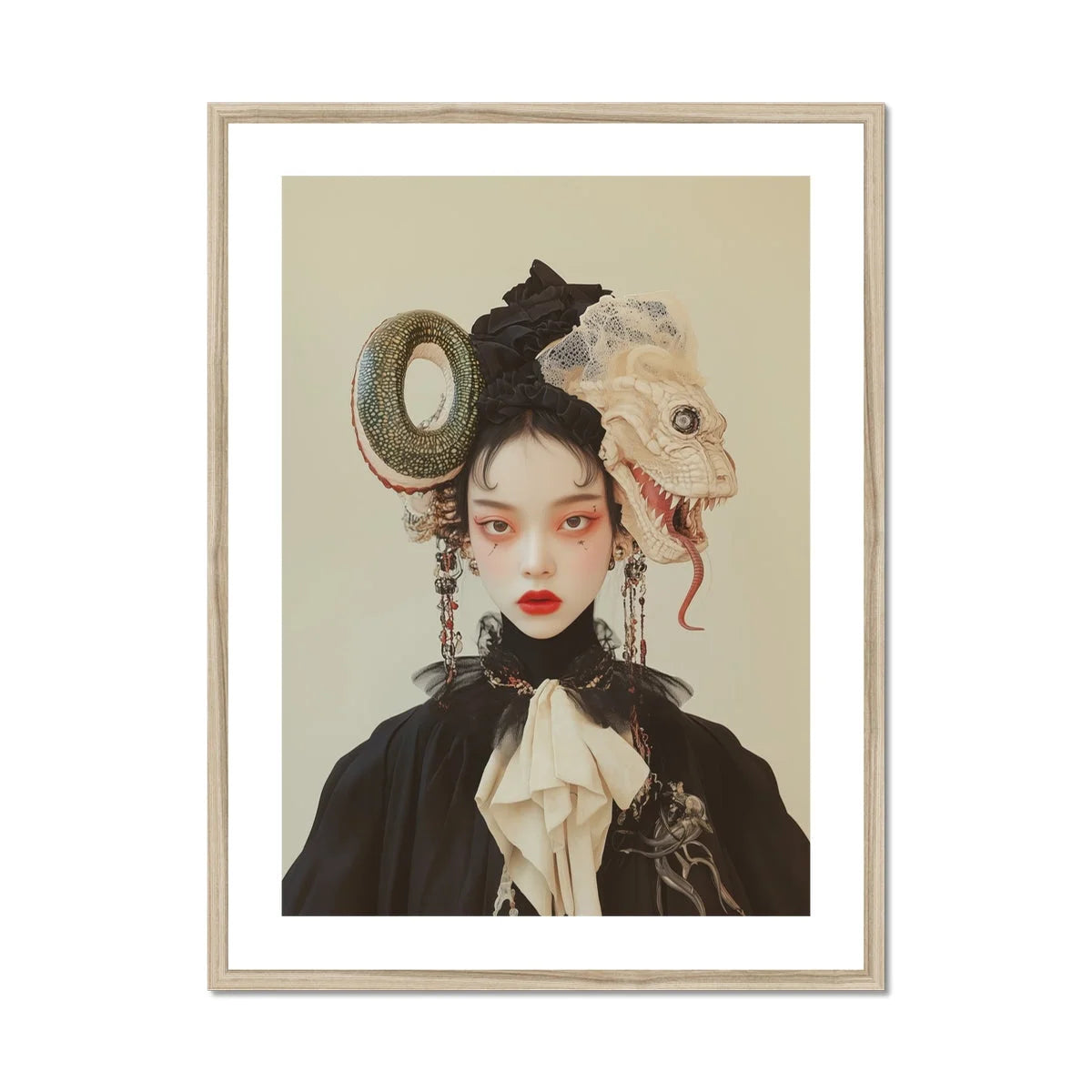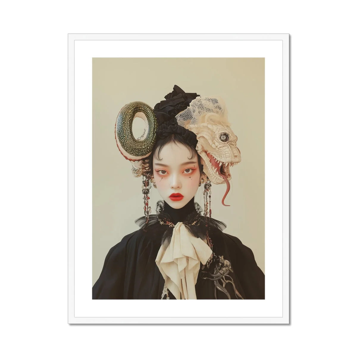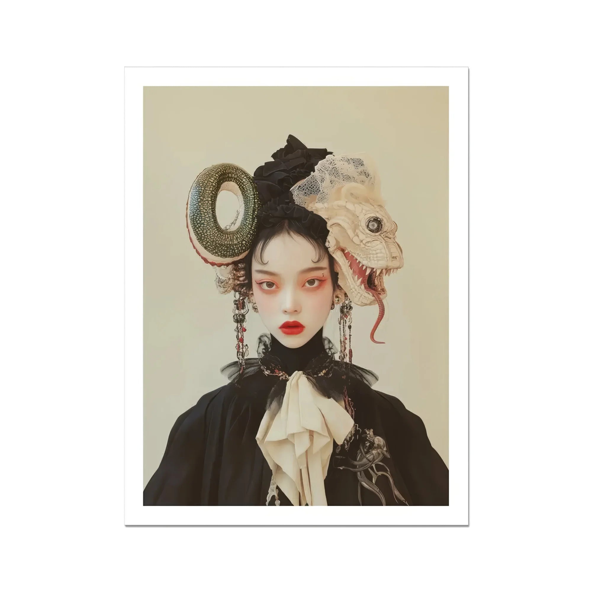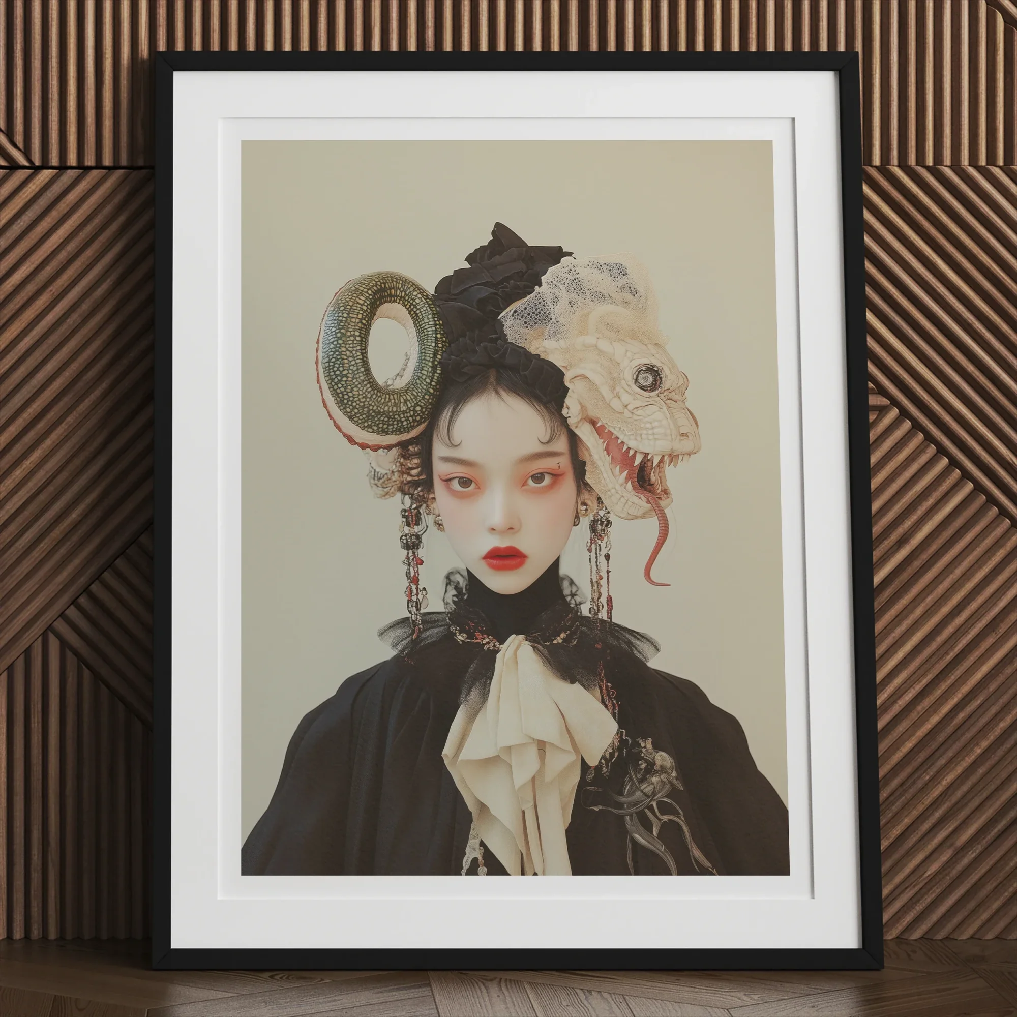 Ryoko è davanti a te, una forza eterea avvolta nella maestà di Ancient mito e queer ribellione. Il suo sguardo perfora nel tempo, invitandoti in un mondo in cui i confini tra bellezza e terrore crollano. Le bobine del copricapo a serpentina come vivere i draghi intorno ai suoi capelli, le loro scale luccicano con una consistenza così vivida da sentire la loro presenza. In cima alla sua testa è il cranio di una bestia sconfitta: nessun semplice ornamento, ma una corona di conquista, che la segnano come sovrano di un regno oltre la comprensione dei mortali.