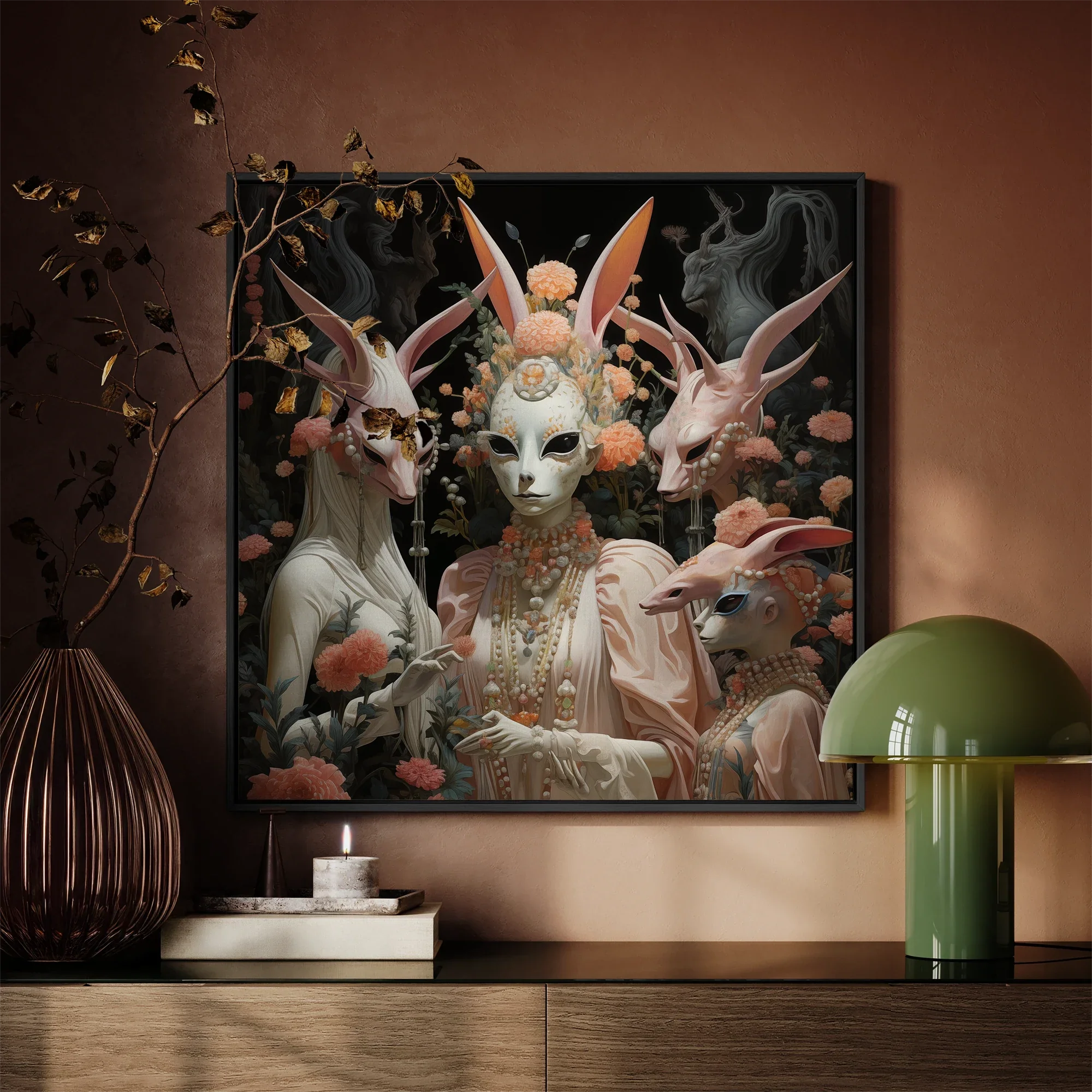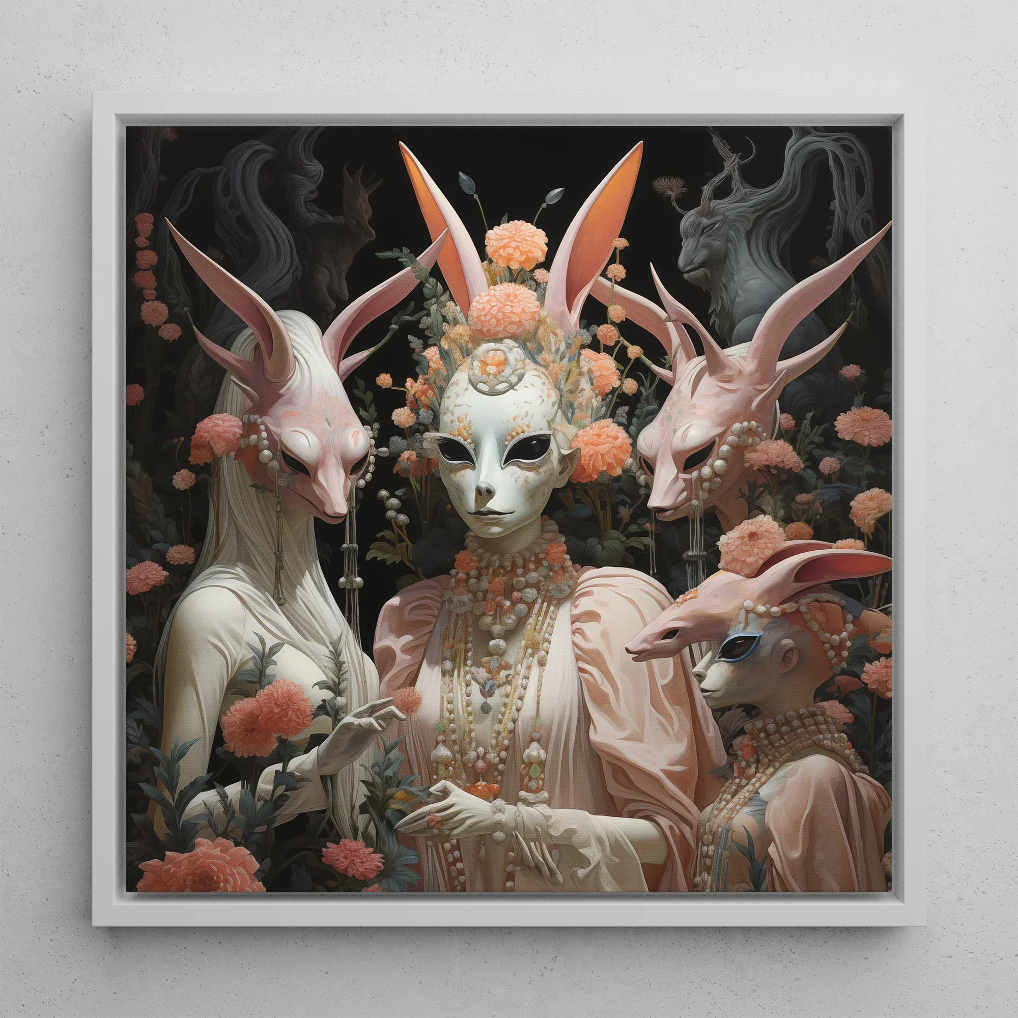 Nell'inquietante silenzio di un Rinascimento alieno, dove l'aria vibra di echi spettrali, quattro esseri celestiali si ergono avvolti in sete fluenti del colore di albe sbiadite. Le loro orecchie allungate, affusolate come guglie di cattedrali, proiettano una silhouette inquietante contro uno sfondo di flora crepuscolare. Occhi vacui ma onniveggenti, detengono una presenza sia antica che profetica, come se il loro sguardo potesse da solo svelare storie dimenticate.