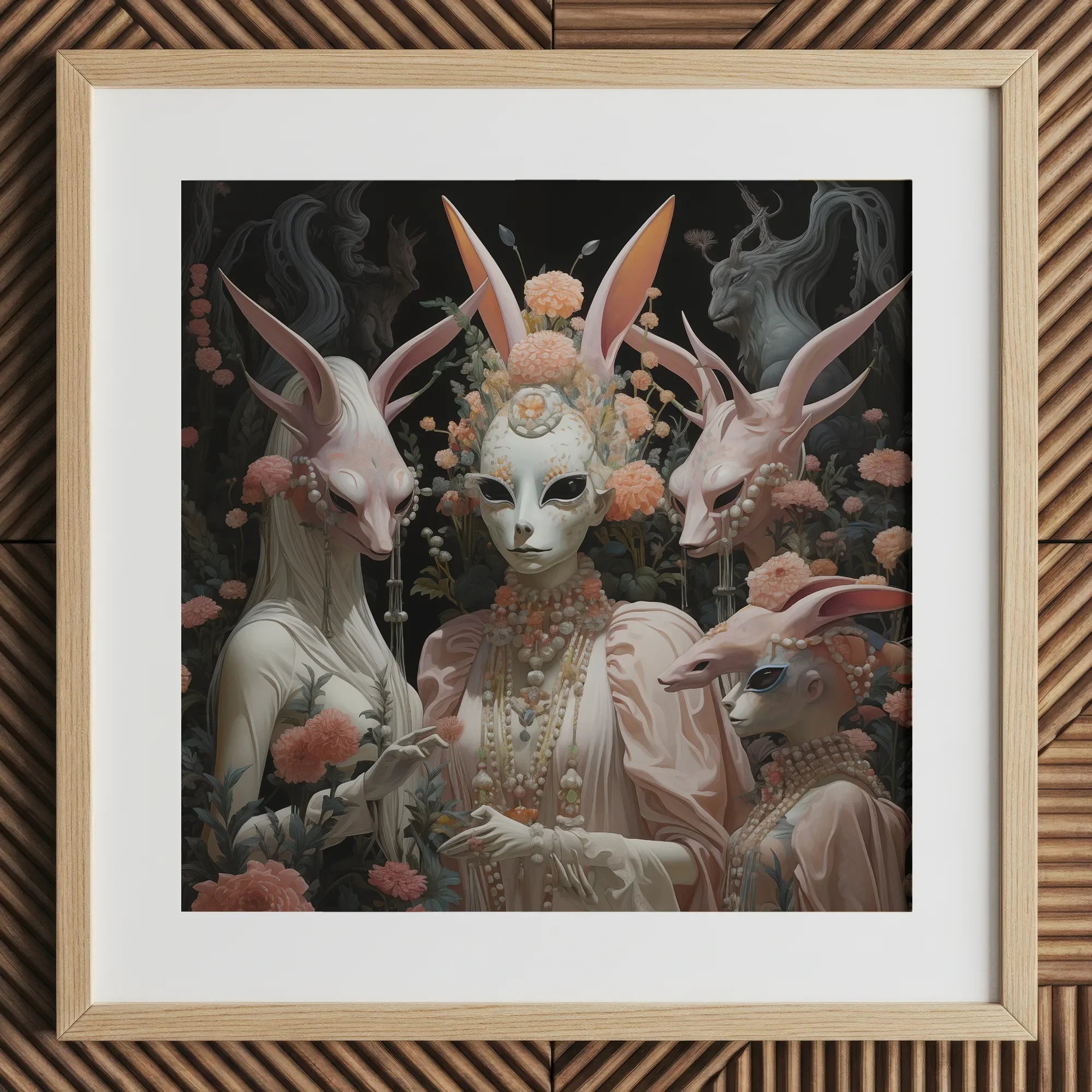 Nella misteriosa crepuscolo di un rinascimentale alieno, dove la flora fiorisce in surreale armonia con le quattro figure extraterrestre ultraterreli si trovano in figura in sete morbide e color pesca. Le loro orecchie allungate, severi sullo sfondo scuro, evocano un fascino inquietante ma stranamente regale. Ognuno adornato in strati di perle, intricate perle che drappeggiano le loro forme come segreti sussurrati da un'altra dimensione. I loro occhi scavanti e cavi fissano un'intensità che si sente sia antica che futuristica, portatori di saggezza senza tempo oltre la nostra comprensione.