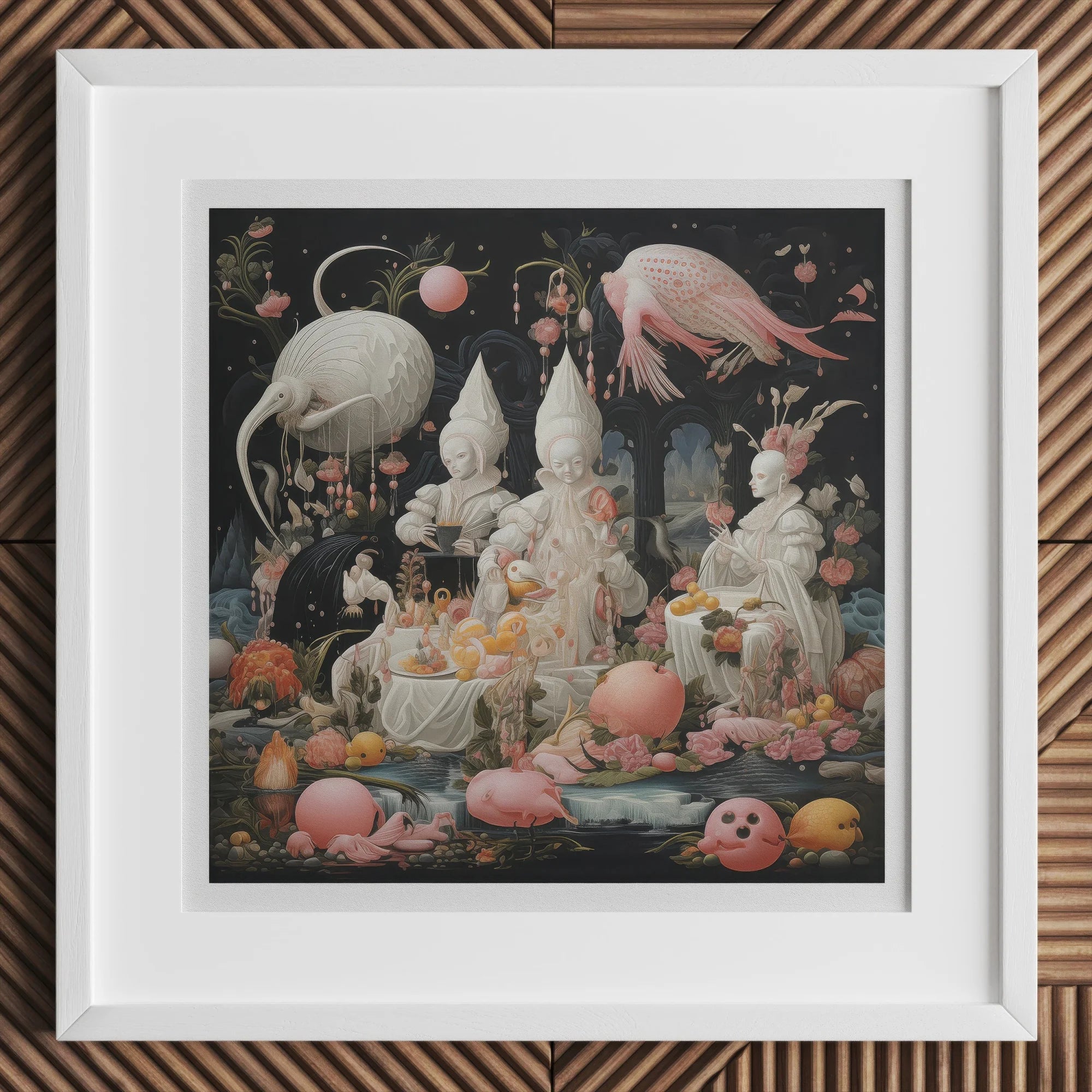 Ecco a surreale Fantasy di Lowbrow in cui il Rinascimento olandese incontra il bizzarro e disastroso. Immergendosi in un sogno di febbre super carino, in cui figure spettrali presiedono un banchetto sinistro in soffici creme grigie e rosa spettrali.