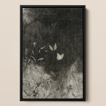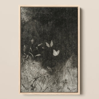 Un campo si dissolve nel crepuscolo. Le erbe si piegano sotto un peso invisibile e due farfalle fluttuano tra la terra e la notte. Le loro ali, pallide come il respiro sul vetro, catturano il più tenue residuo del giorno.