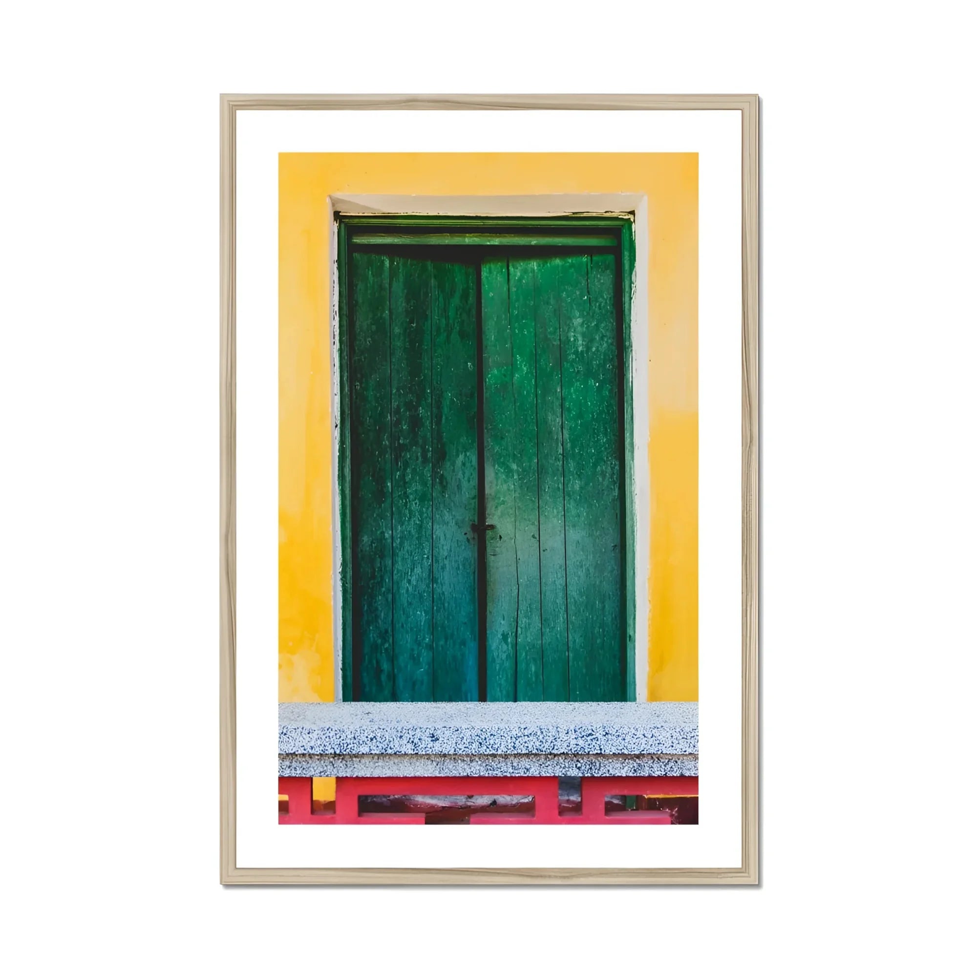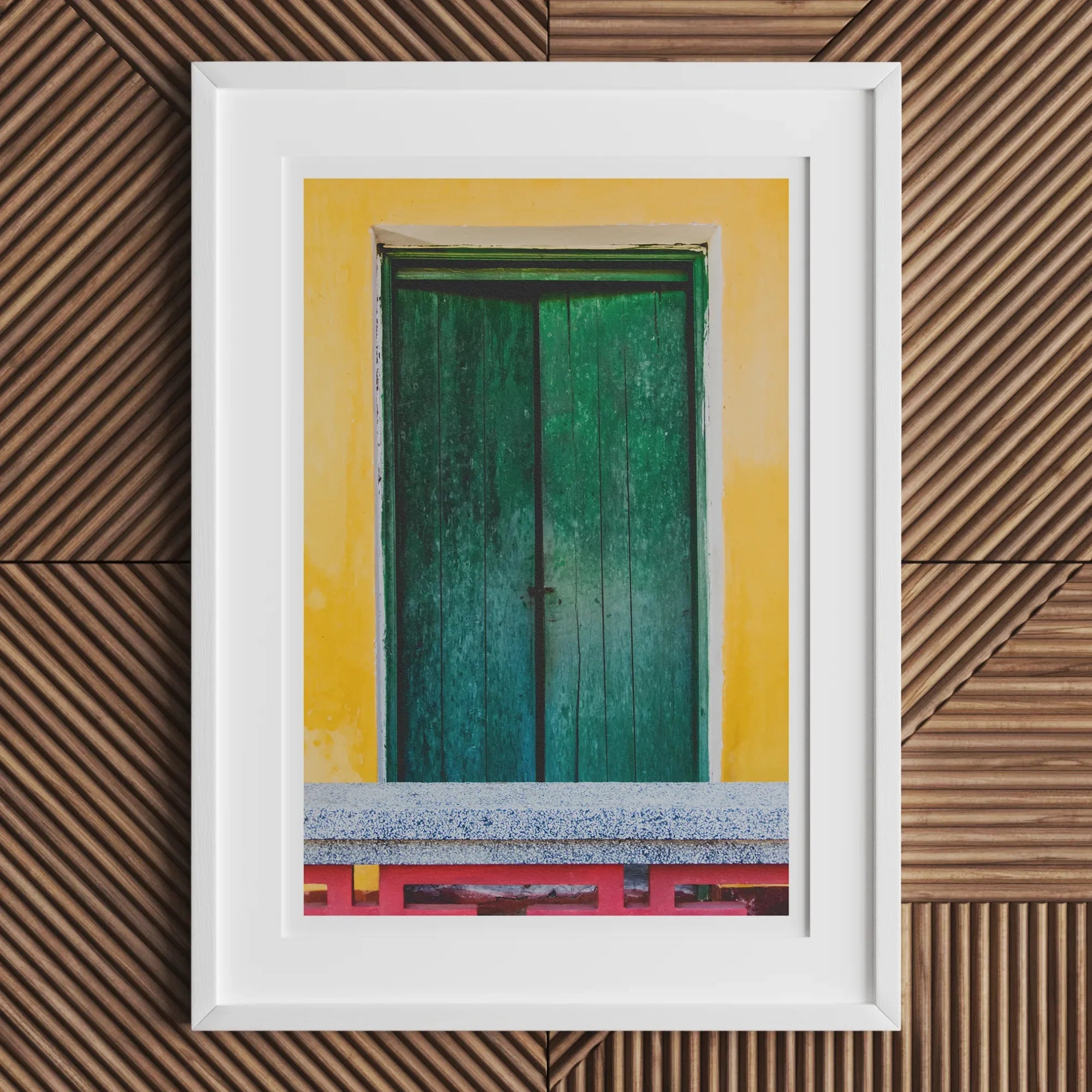 Immergiti nell'anima di Hoi e attraverso questa accattivante stampa di belle arti, dove una porta verde stagionata diventa un portale per la vivace vita di strada del Vietnam.