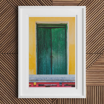 La composizione della fotografia contrappone le assi di smeraldo della porta contro un muro giallo di girasole, evocando gli aromatici pungenti del coriandolo e dello zenzero in una festa visiva. Una soglia di pietra, macchiata come grani di peperoncino di peperoncino schiacciato, fonda la scena in solidità senza tempo.