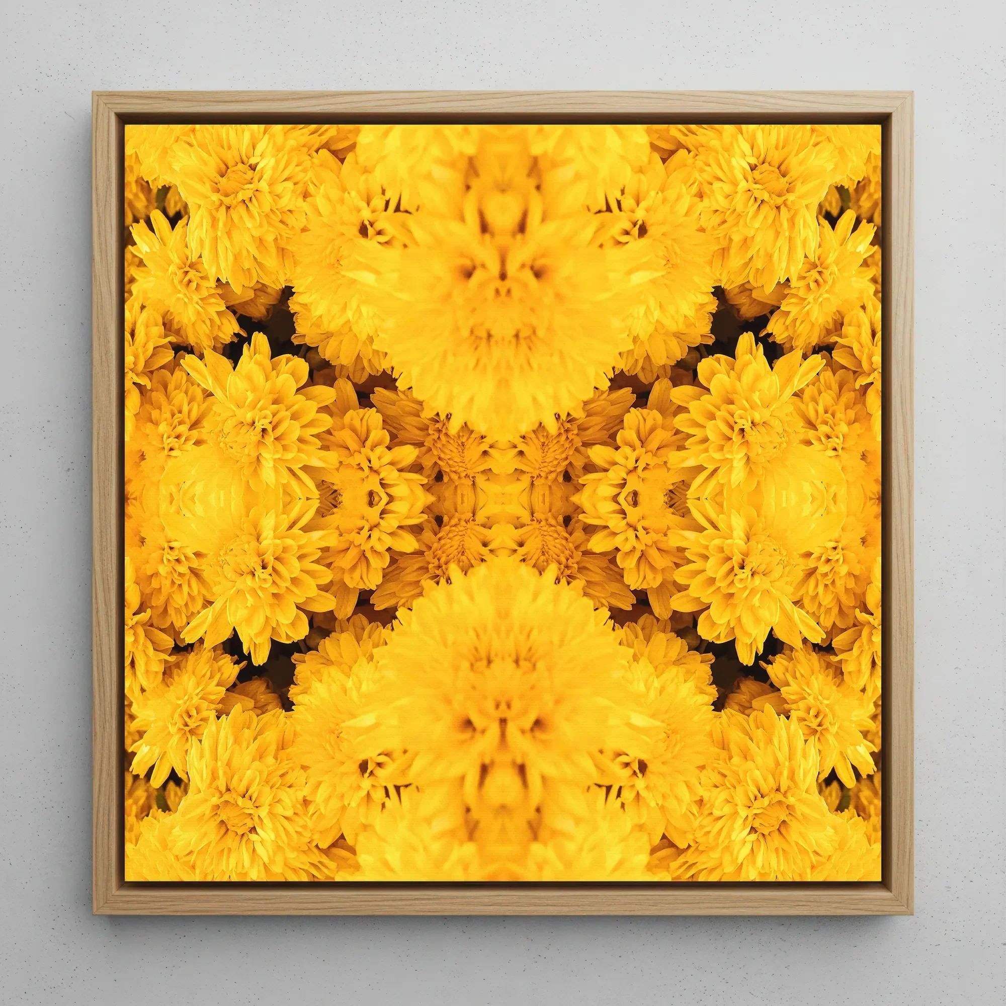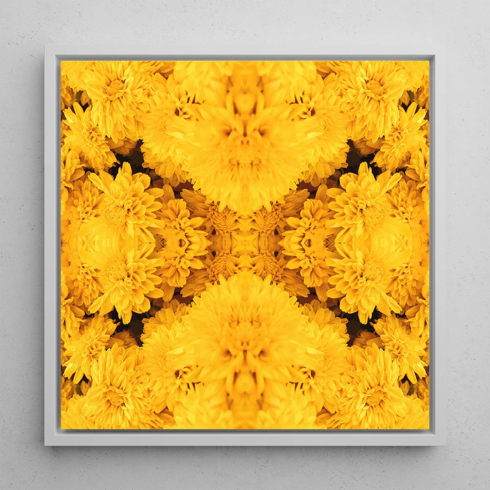 Immergiti nel fascino all'avanguardia di "Gold Rush", una stampa su tela incorniciata che trasforma il tuo spazio in una reverie indotta da crisantemi. Questo opus simmetrico evoca una fantasmagoria botanica, dove petali baciati dal sole proliferano in motivi ipnotizzanti. Mentre contempli questo tableau caleidoscopico, assisterai alla geometria della natura che si dispiega in una danza ipnotica di forme e colori.