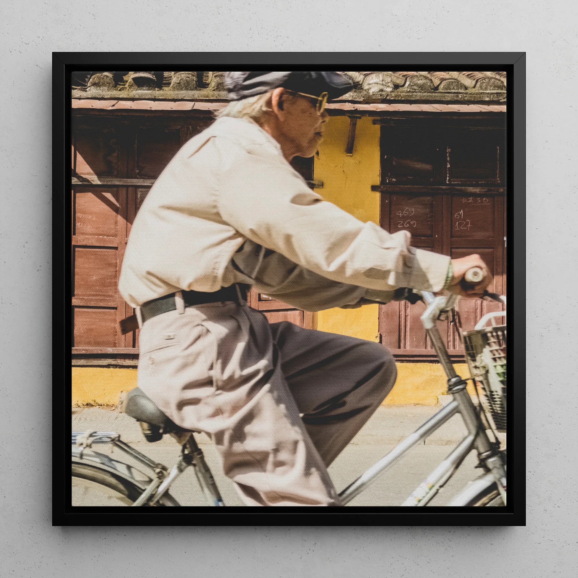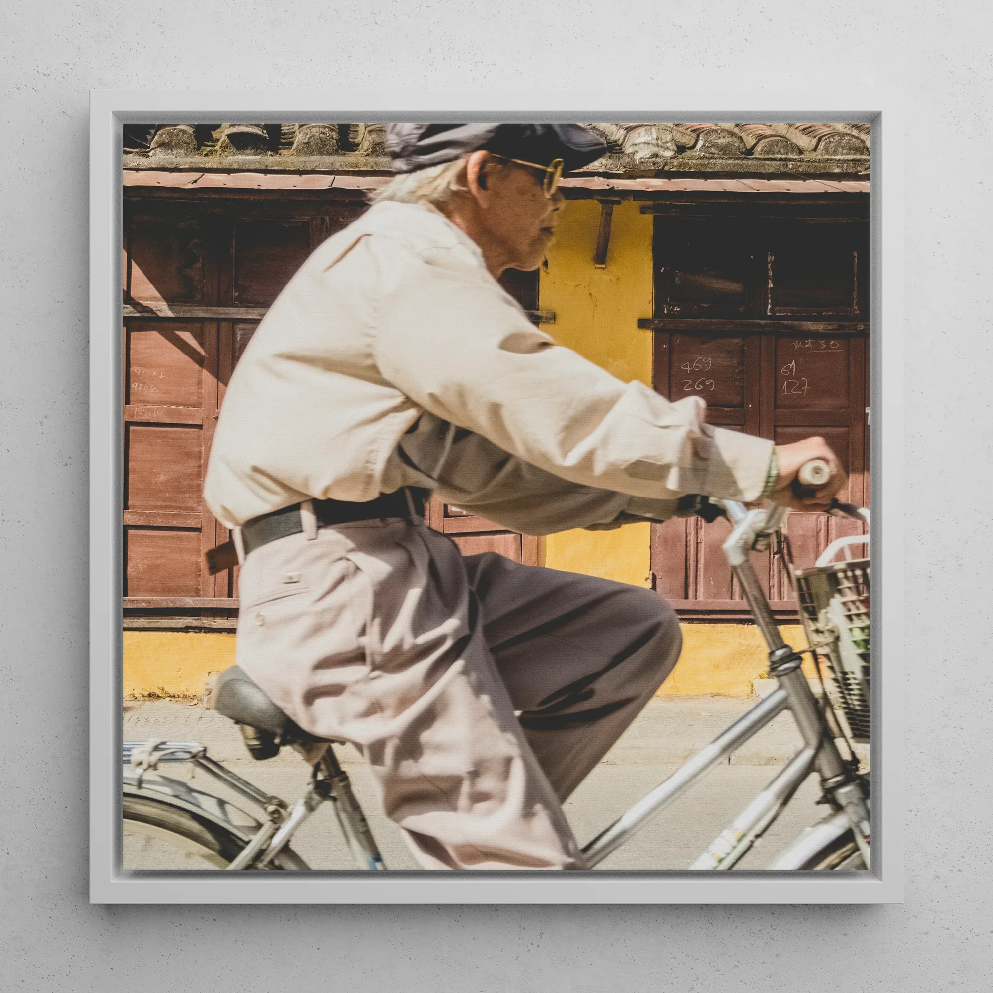 Un ciclista anziano, una sfocatura di movimento, si occupa attraverso la cornice di questa tela - una nuova fetta del vivace paesaggio stradale di Hoi An. I suoi occhiali cerchiati di filo che catturano la luce mentre si appoggia a quei luccicanti manubri. Taglia una figura nitida: una camicia fresca che si faceva fluttuare dai suoi pantaloni, un tappo piatto in pelle tirato basso e i suoi aviatori luccicanti.