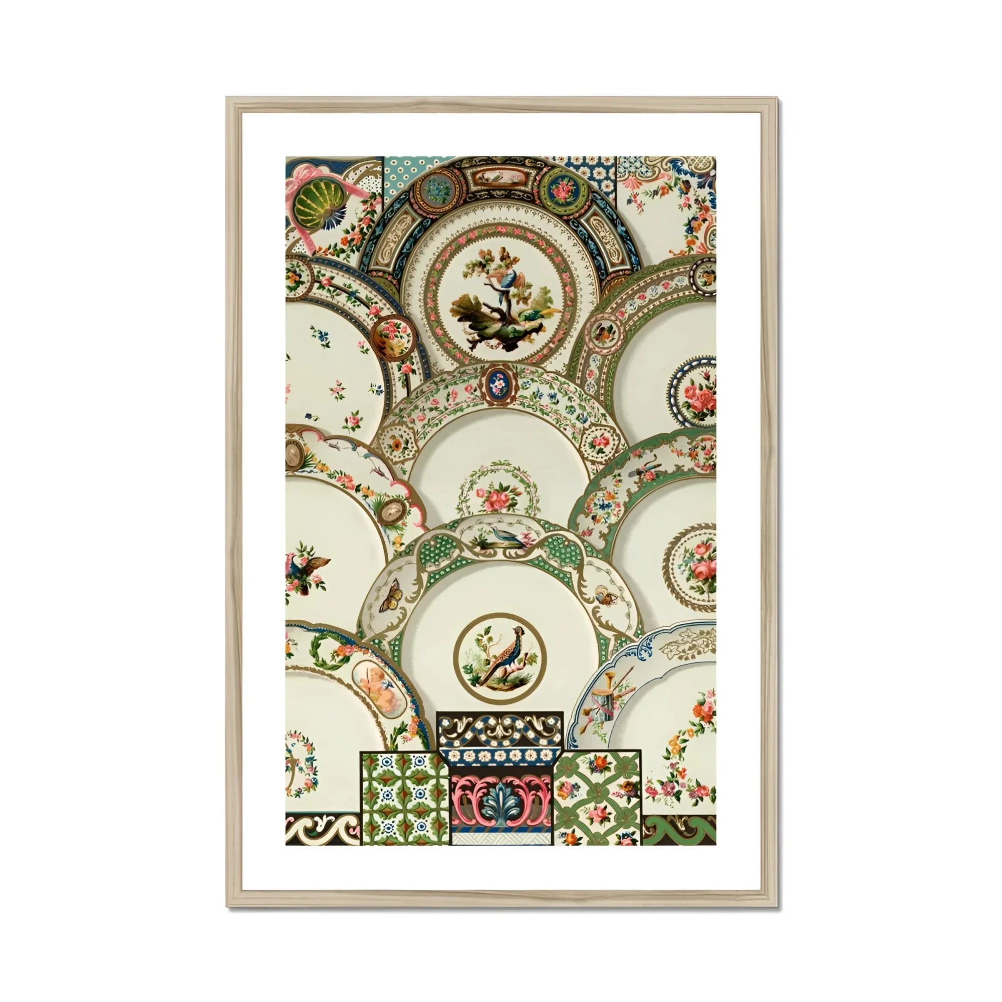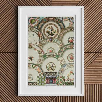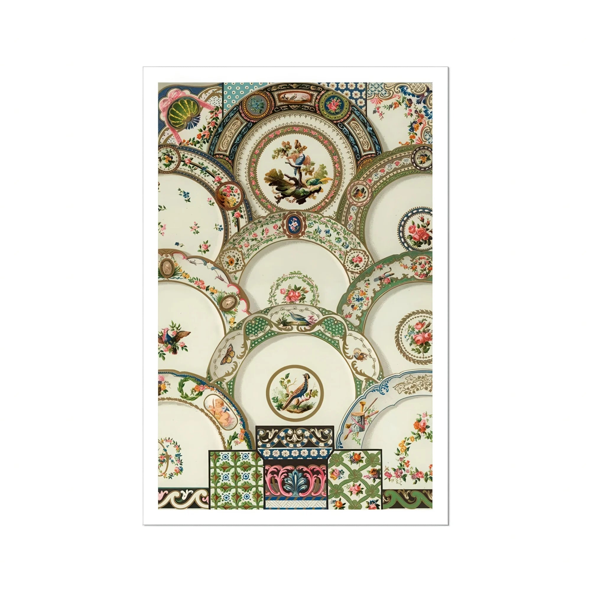 Mentre i tuoi occhi ballano attraverso la composizione, scoprirai tesori nascosti - pavoni appollaiati tra i bouquet in fiore, delicati farfalle svolazzando attraverso lo scorrimento ornato. La padronanza di Racinet brilla nei dettagli meticolosi, dai bordi smerlati della Cina ai petali sottili e sottili che adornano ogni piatto.