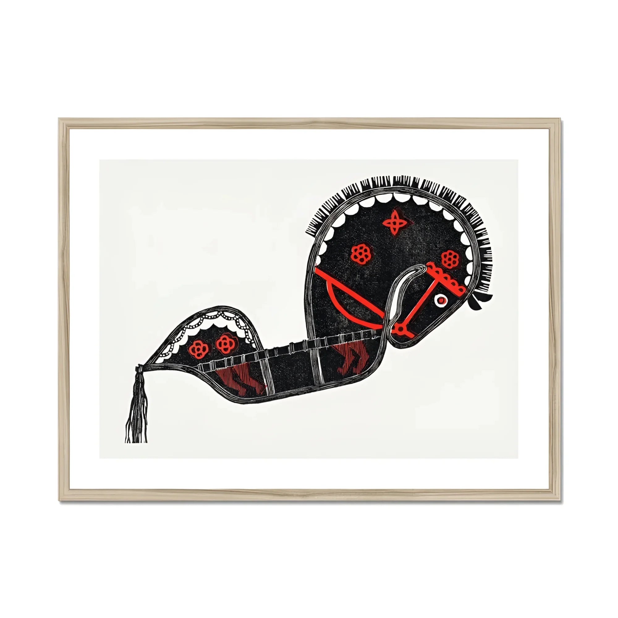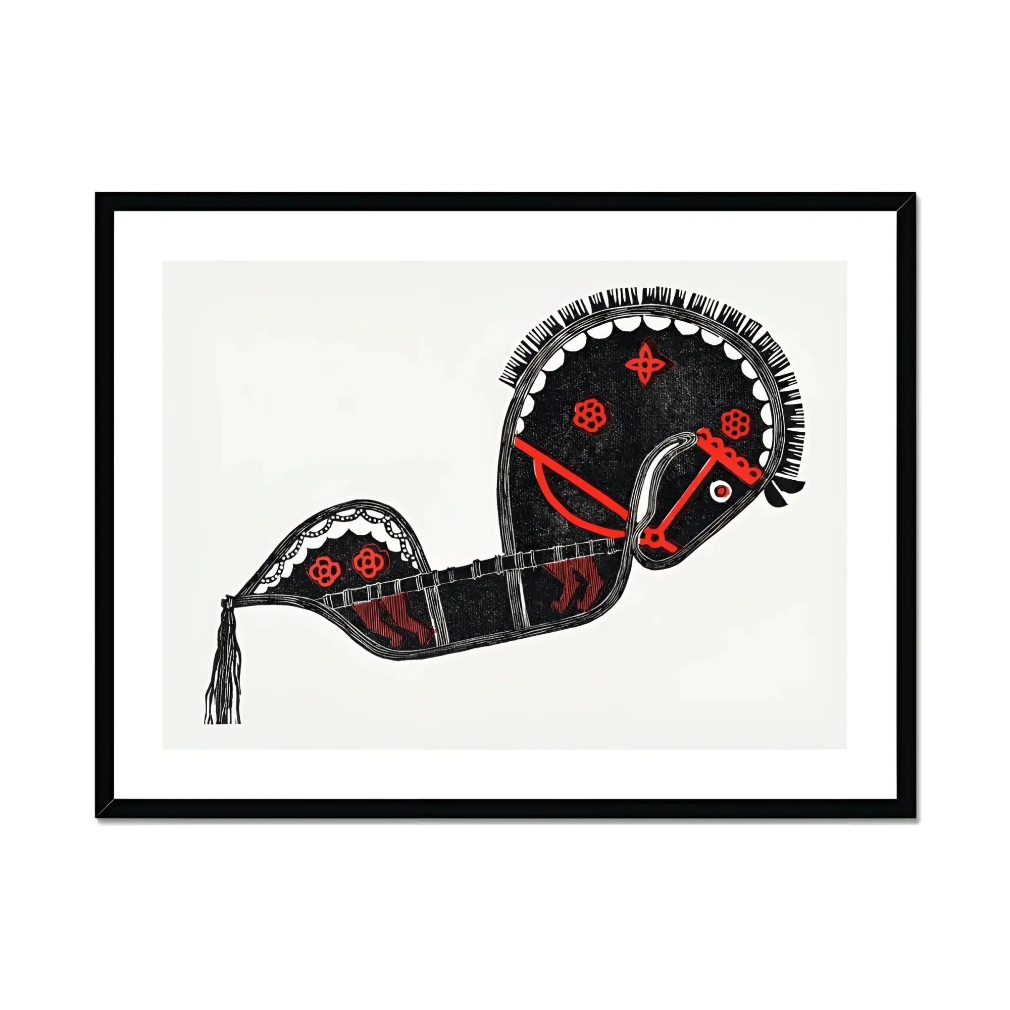 Questa sorprendente stampa di arte a cavallo cattura l'essenza dell'eleganza cerimoniale, la sua forma ad arco ornata da intricati motivi che sussurrano storie di patrimonio culturale. Le linee nere audaci e gli accenti rossi infuocati creano una sinfonia visiva, trasformando il cavallo in un emblema vivente della grazia ritualistica.