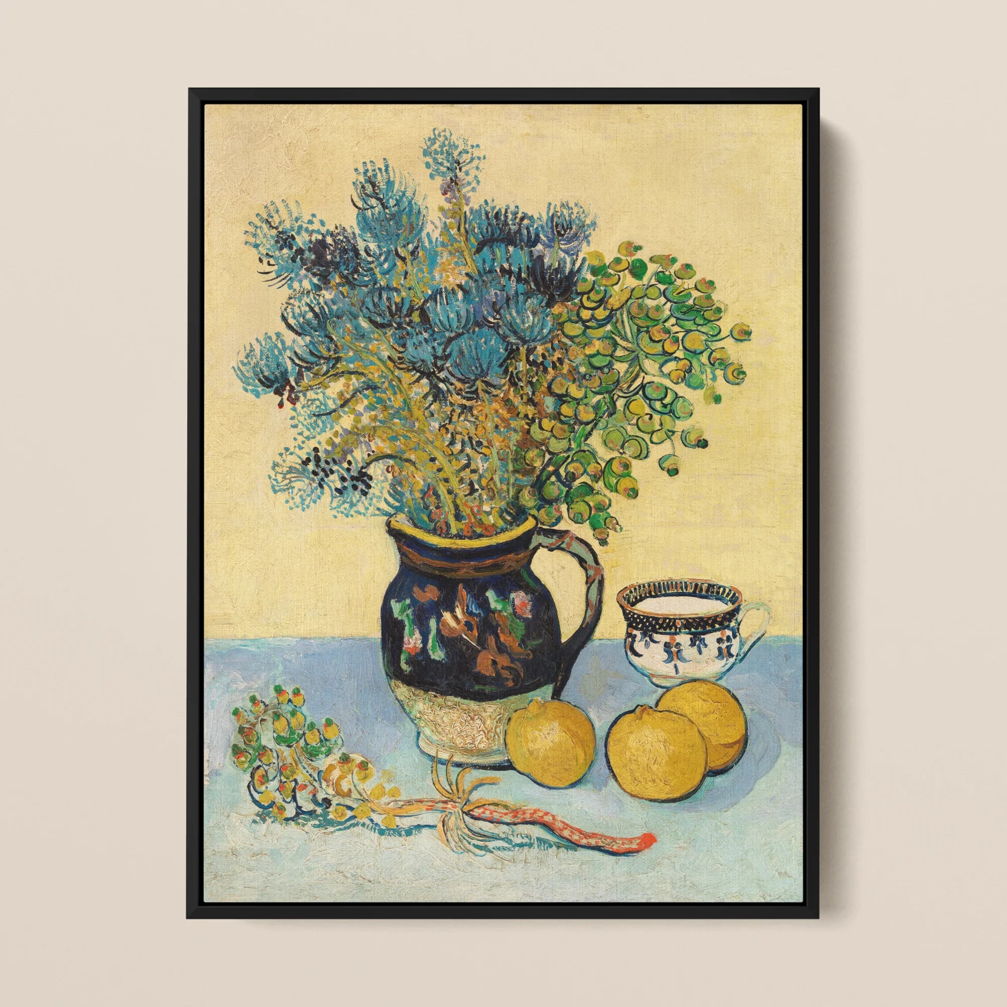 I tuoi occhi balleranno attraverso la tela, attratti dagli elementi accuratamente disposti - una delicata tazza da tè, limoni paffuti - ogni elemento che racconta una storia, invitandoti a svelare il gentile simbolismo all'interno della scena accuratamente composta di Van Gogh. Il formato di tela incorniciato conserva ogni sfumatura del dipinto originale, dalle sottili variazioni di colore all'interazione dinamica di luce e ombra.
