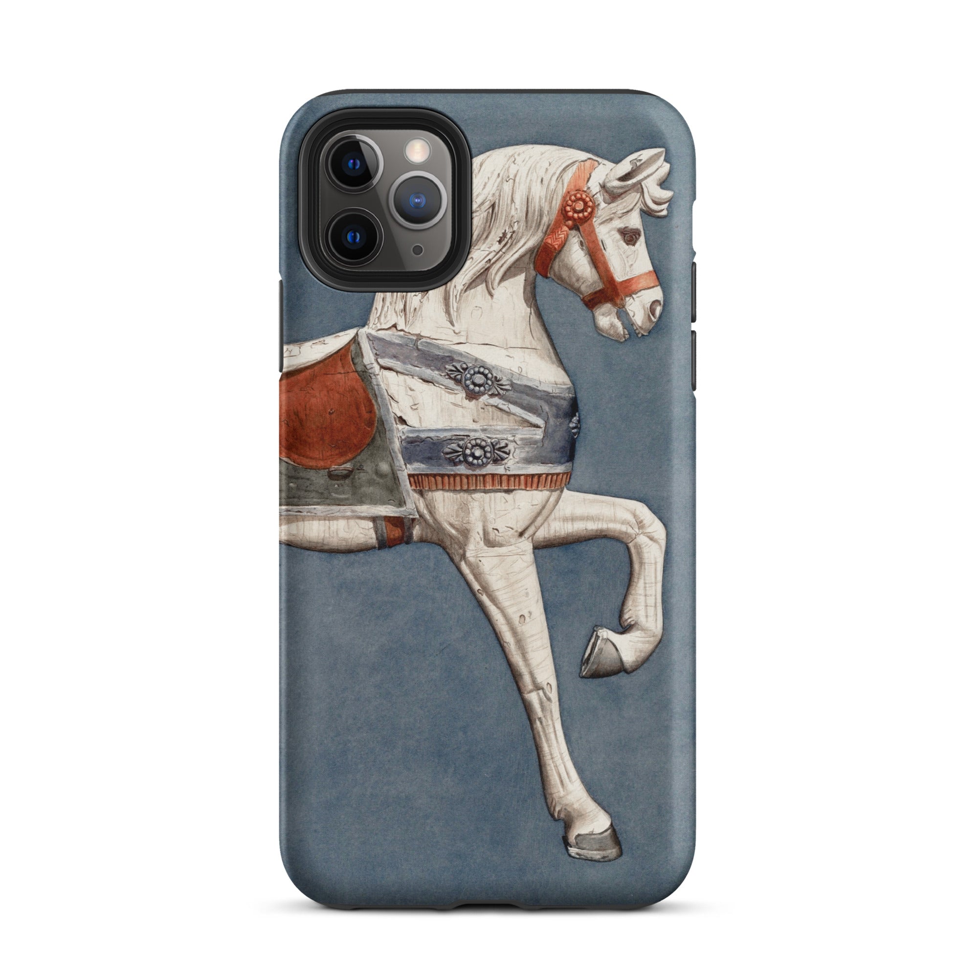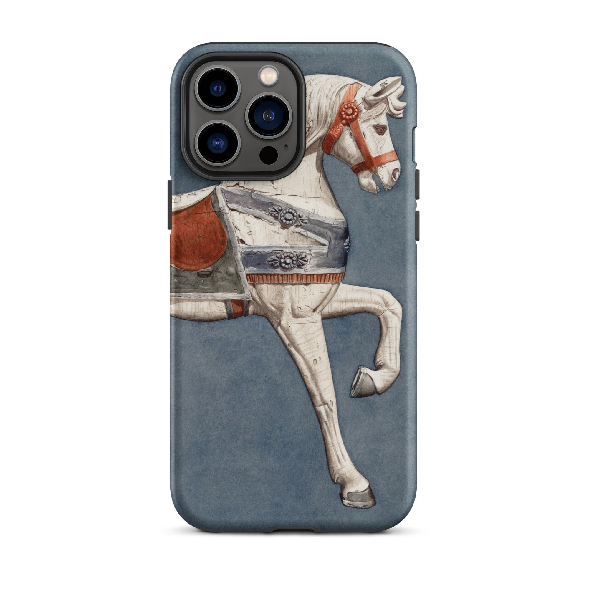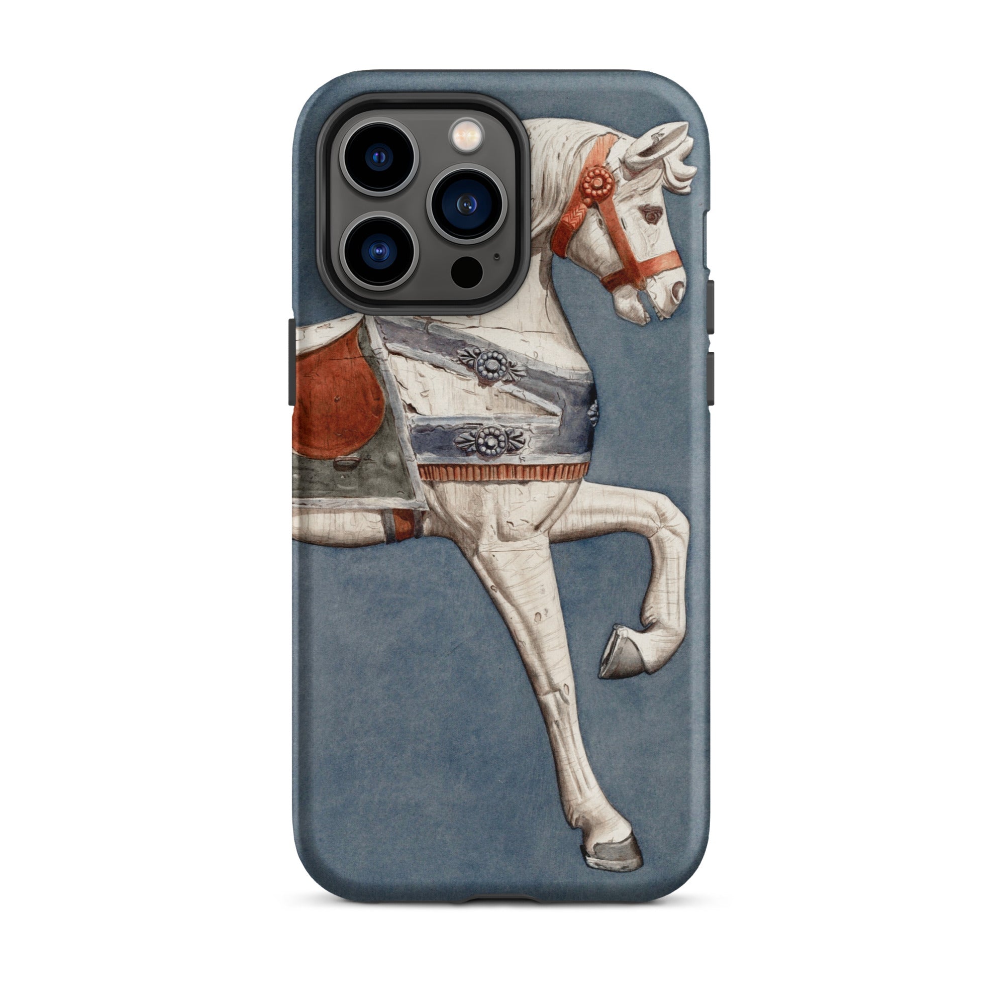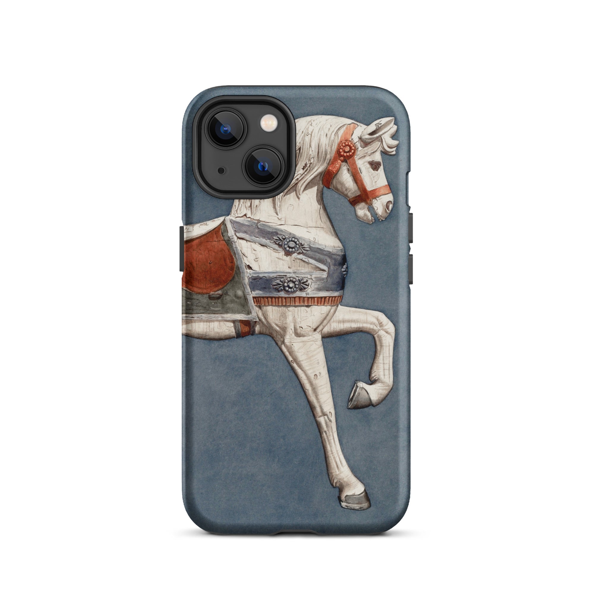 Questa custodia per iPhone trasforma il Cavallo della Giostra di Henry Murphy in un capolavoro tascabile—un sogno fugace ad acquerello di antichi parchi di divertimento preservati. Il cavallo al galoppo, adornato con ornamenti elaborati, sembra saltare dallo sfondo blu tenue, la sua forma elegante catturata in acquerello, grafite e inchiostro.