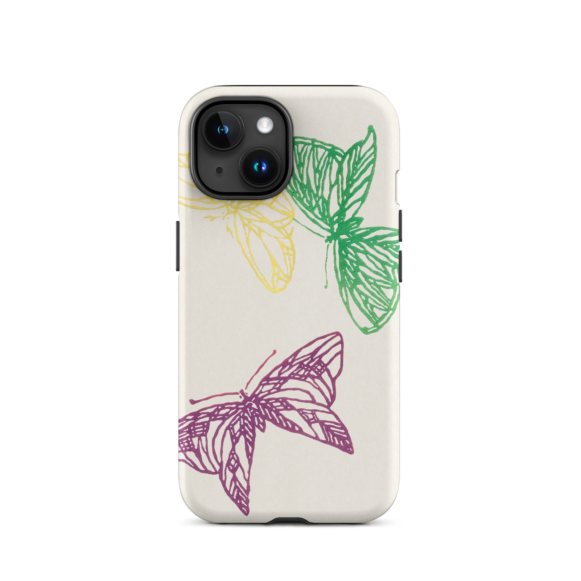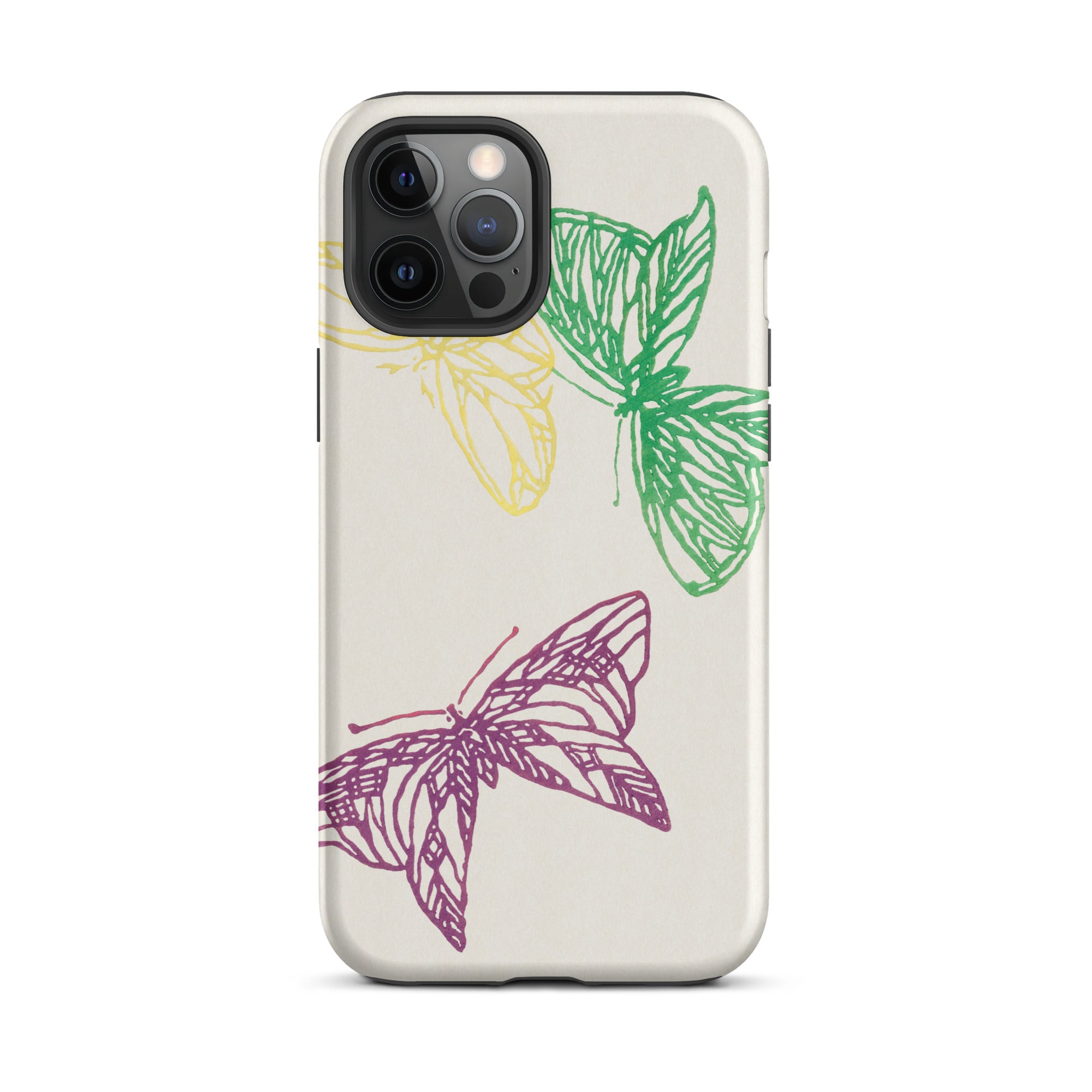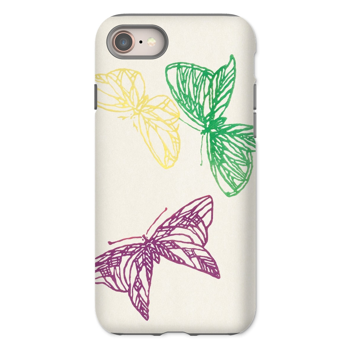 Delicatamente inciso in una semplicità fluente, Kamisaka Sekka "Butterflies" trasforma un motivo quotidiano in una serena meditazione sulla forma e il colore. Questa custodia per iPhone cattura tre farfalle, le loro silhouette rese in vivaci tonalità di viola, giallo e verde, con un intricato lavoro di linee che ricorda la raffinata calligrafia giapponese. Le loro ali, definite da ampi tratti quasi a pennello d'inchiostro, sembrano svolazzare a mezz'aria, sospese nella purezza minimalista dello sfondo bianco.