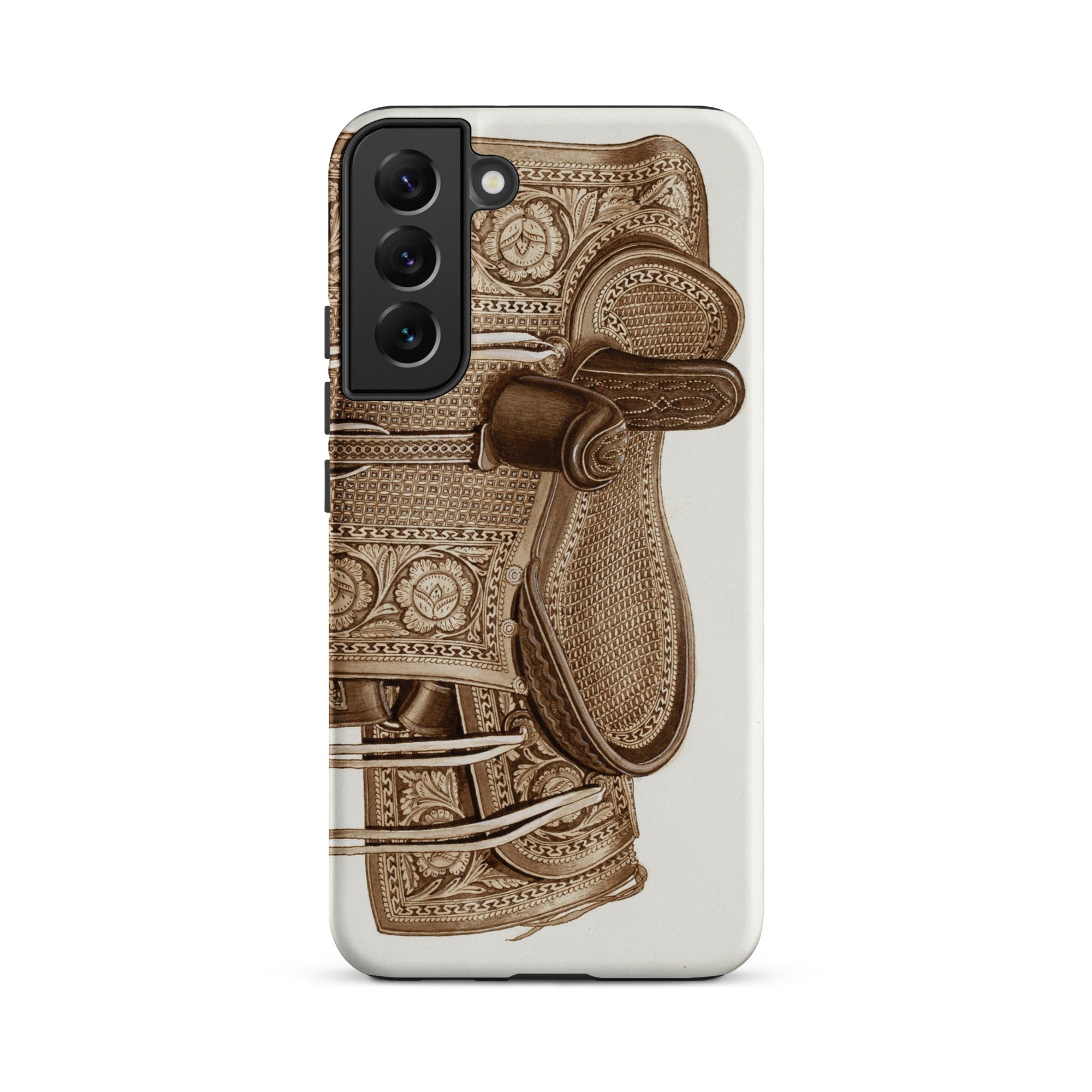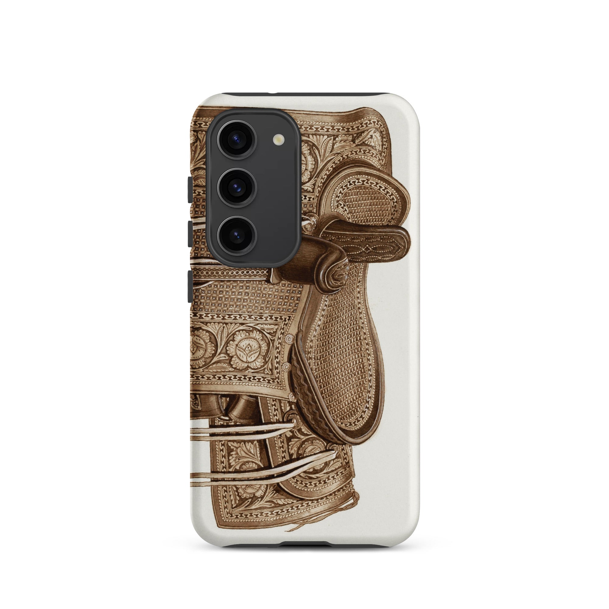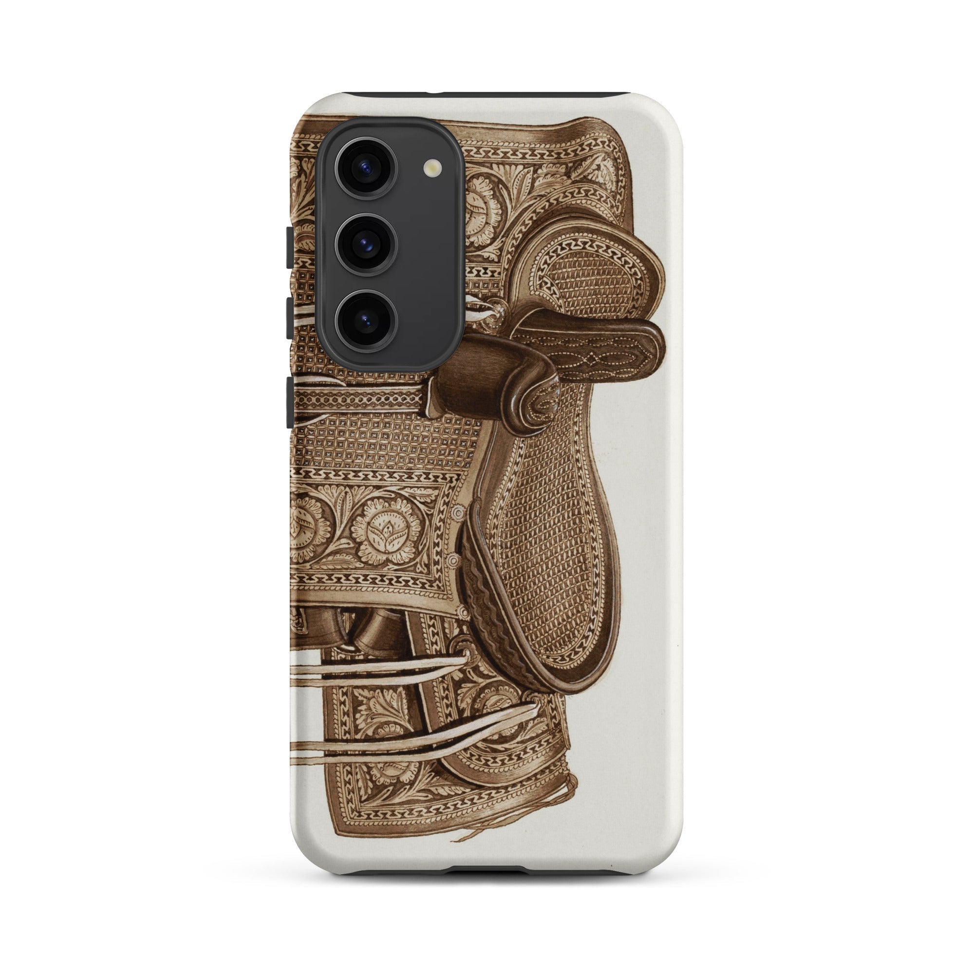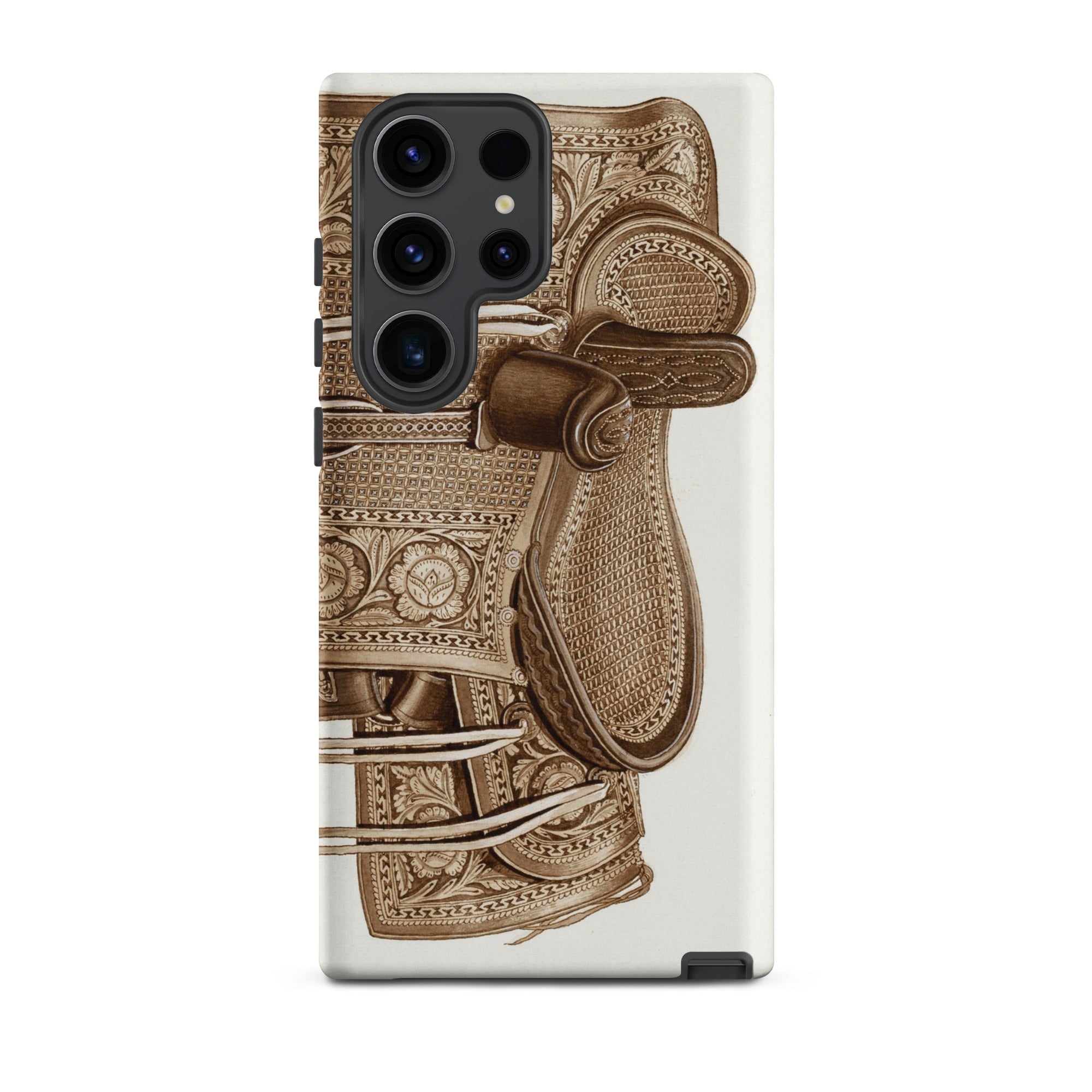 Questa custodia Samsung trasforma un'incisione d'archivio in un artefatto portatile della cultura dell'equitazione—fabbricazione di selle occidentali, lavoro di briglie, design di attrezzature vittoriane. Linee sottili portano la grana del cuoio consumato, l'intreccio delle redini, la simmetria misurata dell'arte del sellaio.