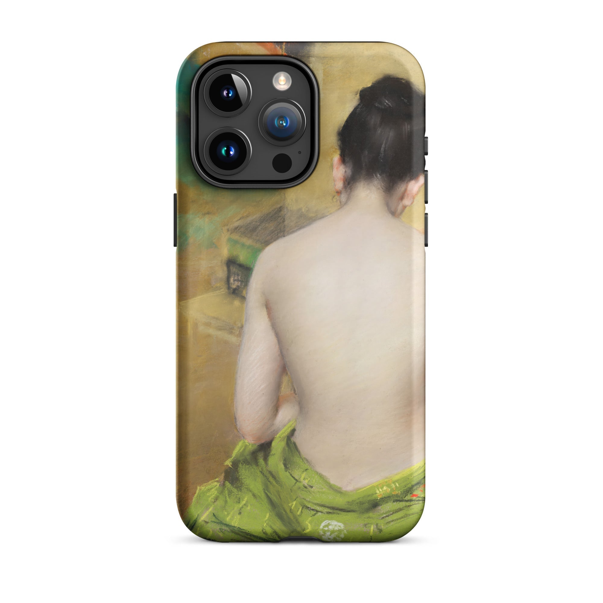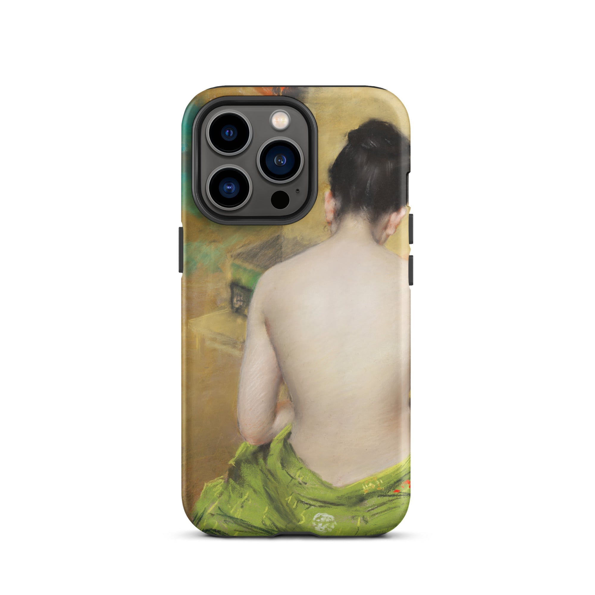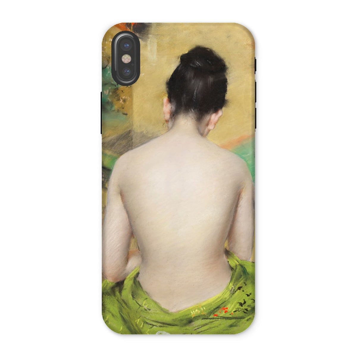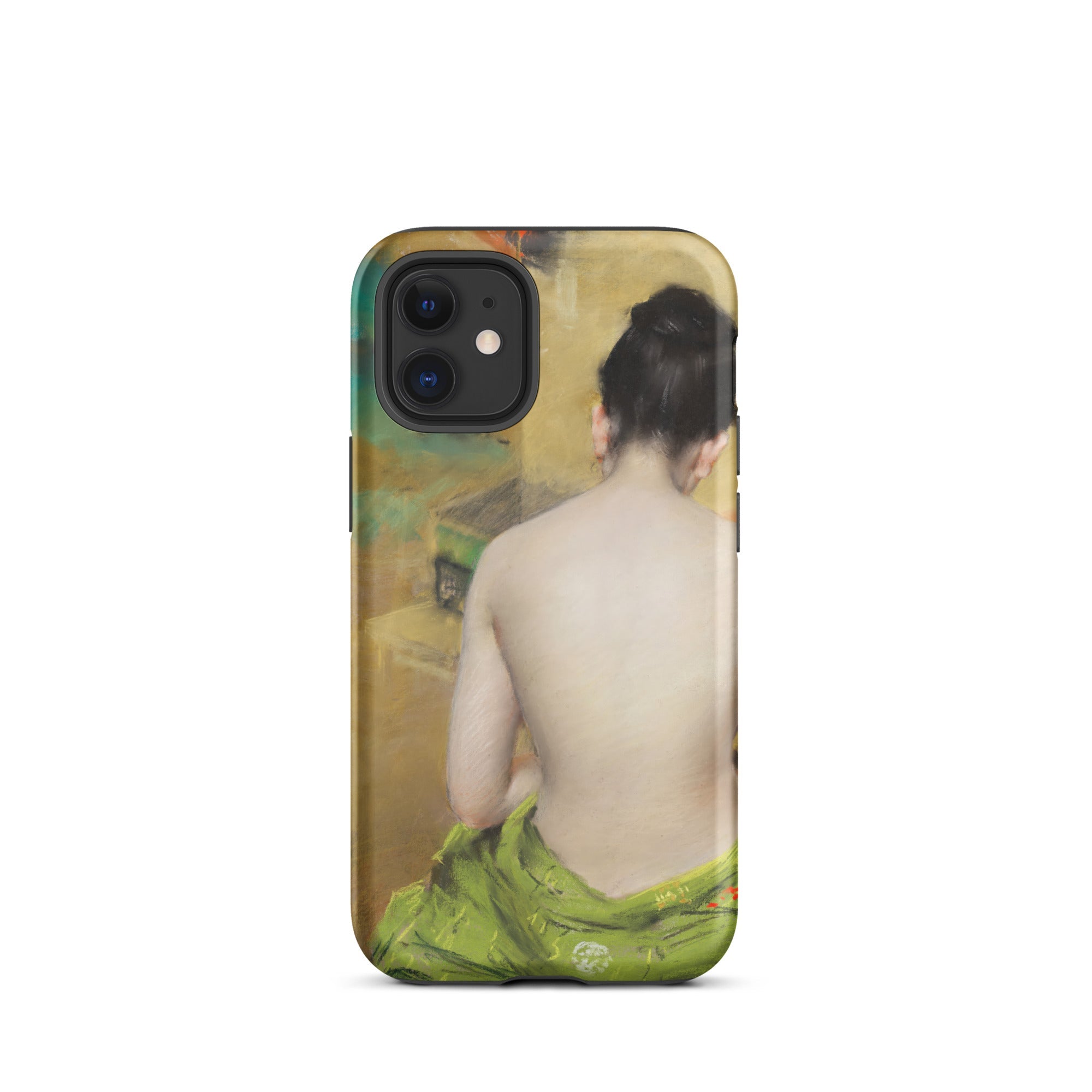 Avvolgiti nel fascino sensuale della maestria audace dei pastelli di Chase con questa custodia per iPhone. Delizia i tuoi occhi con la pelle luminosa del modello, una sinfonia di toni carnosi che brillano su uno sfondo dorato. La composizione audace di Chase ti spinge in intima prossimità con la schiena nuda del soggetto, un provocante cenno alle stampe ukiyo-e di Utamaro.