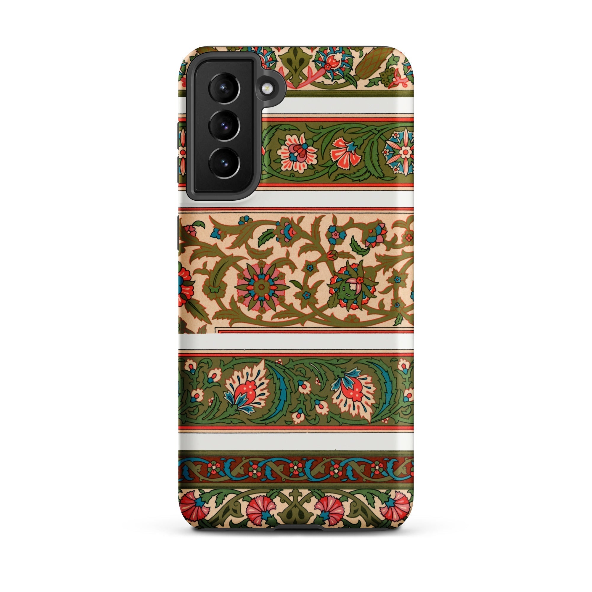Tenendo questa custodia, porti con te un micro-museo di arabeschi botanici, ogni bordo un condotto verso cortili ad arcate, trafori scolpiti e il lessico cromatico dell'ornamentazione islamica. I gesti quotidiani diventano atti di curatela, il tuo dispositivo rivestito nella grammatica vivente della documentazione orientalista del XIX secolo.