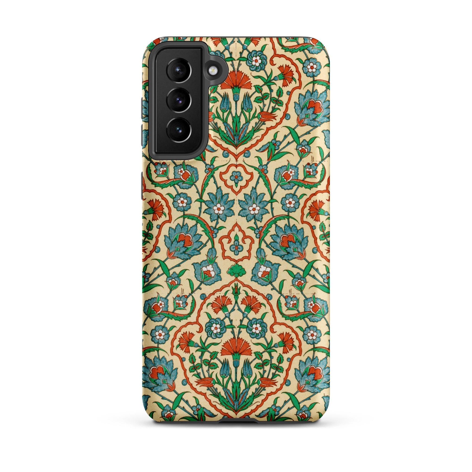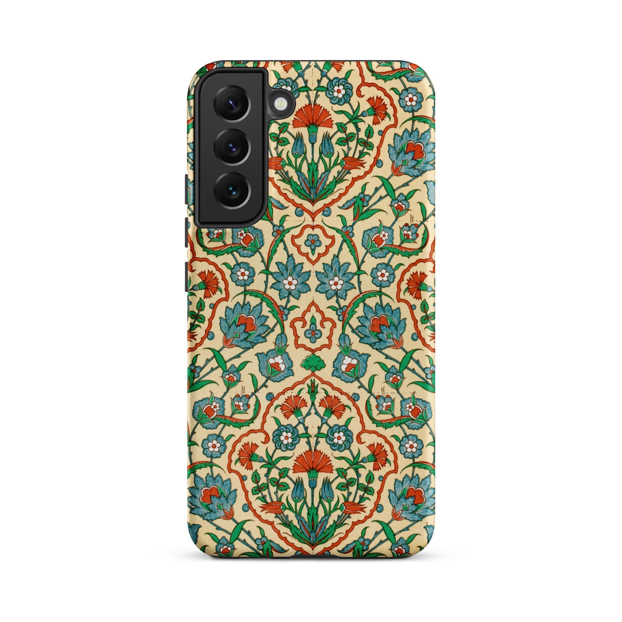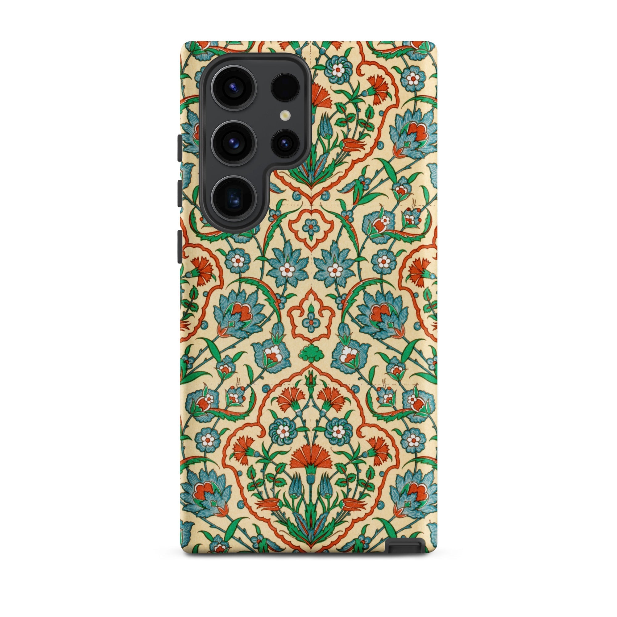 Un frammento portatile di splendore ottomano, questa custodia Samsung porta La Decoration Arabe 33 di Émile Prisse d’Avennes. Il fondo lavato crema ospita loti turchesi e garofani scarlatti disposti in medaglioni che ricordano le piastrelle di Iznik commerciate attraverso le corti palaziali di Istanbul.