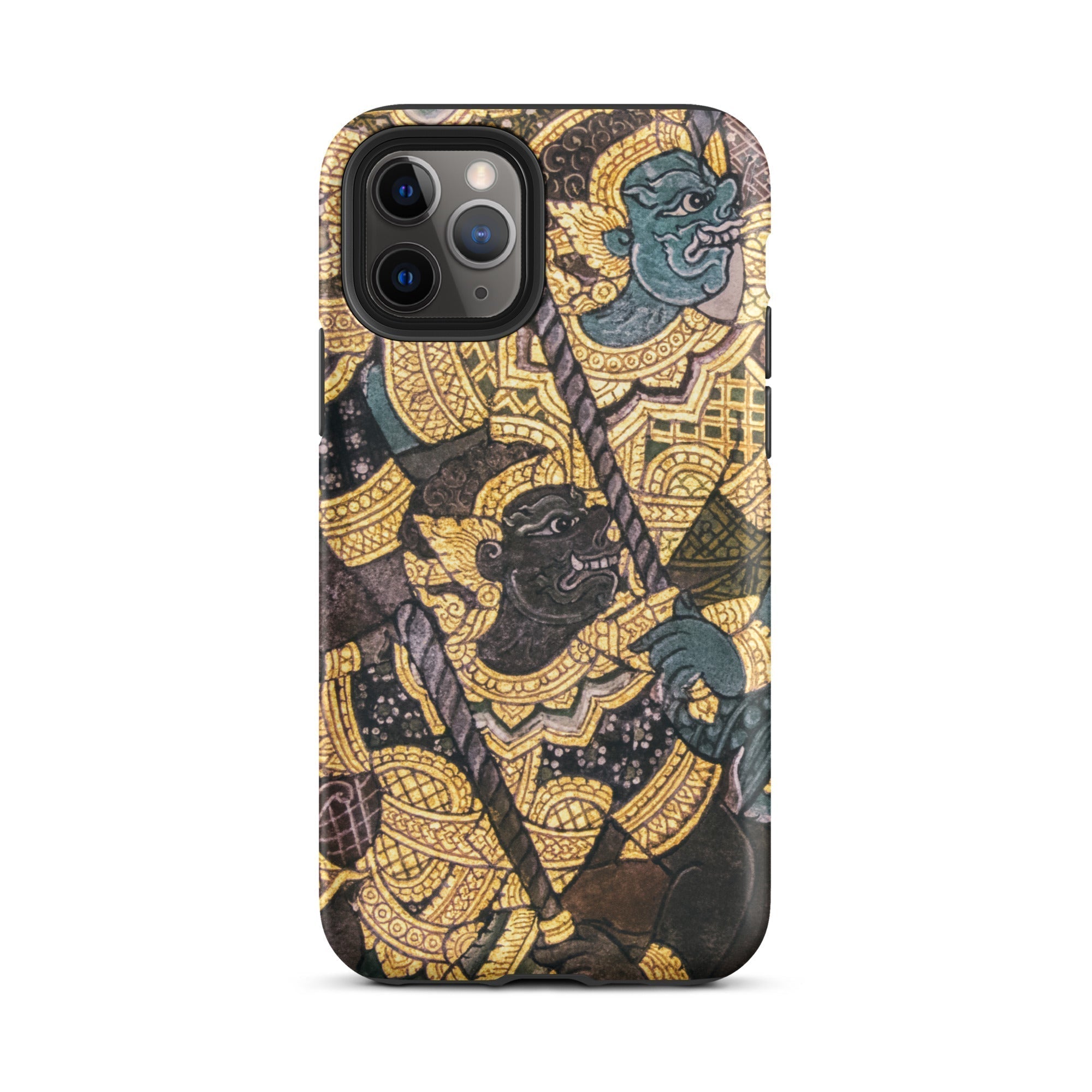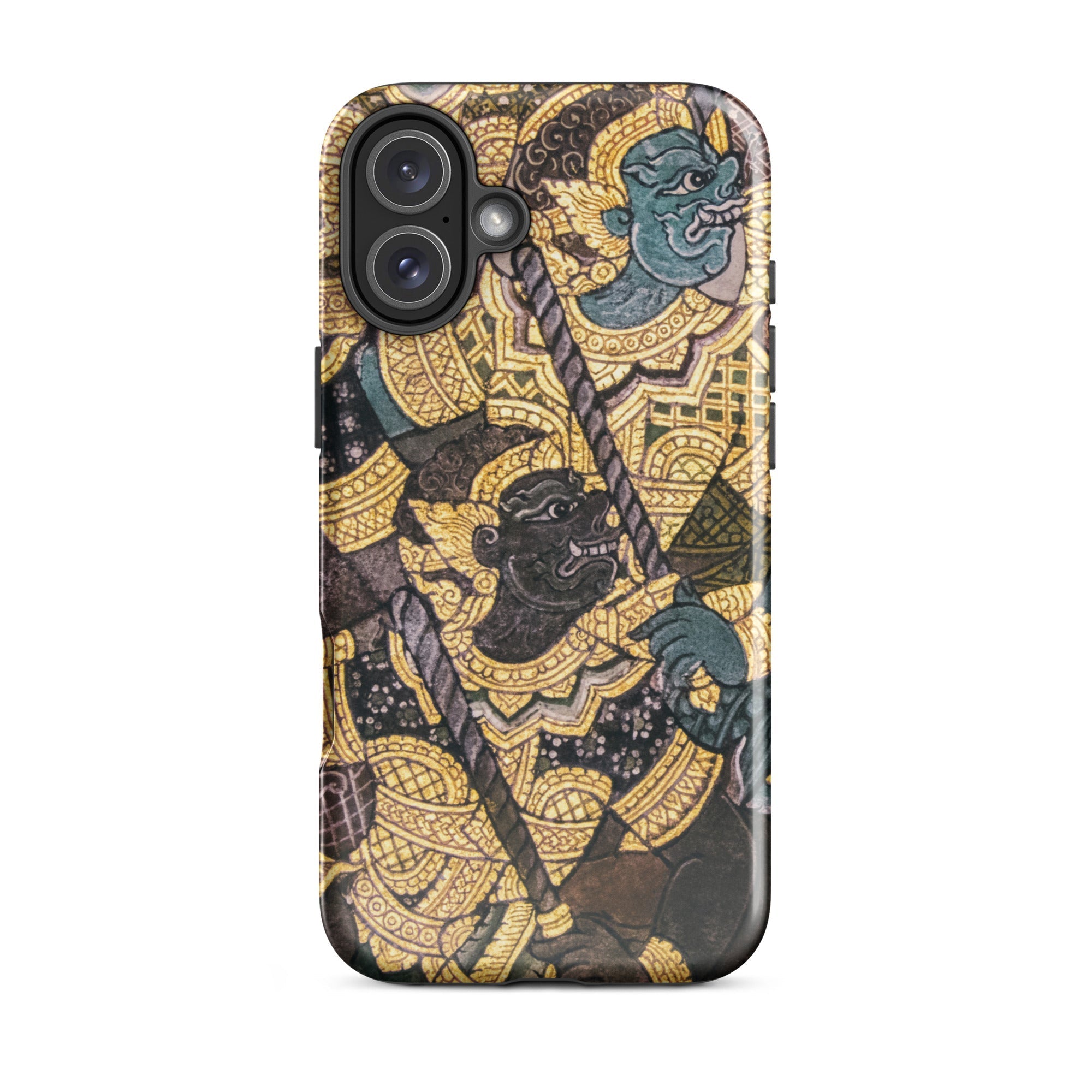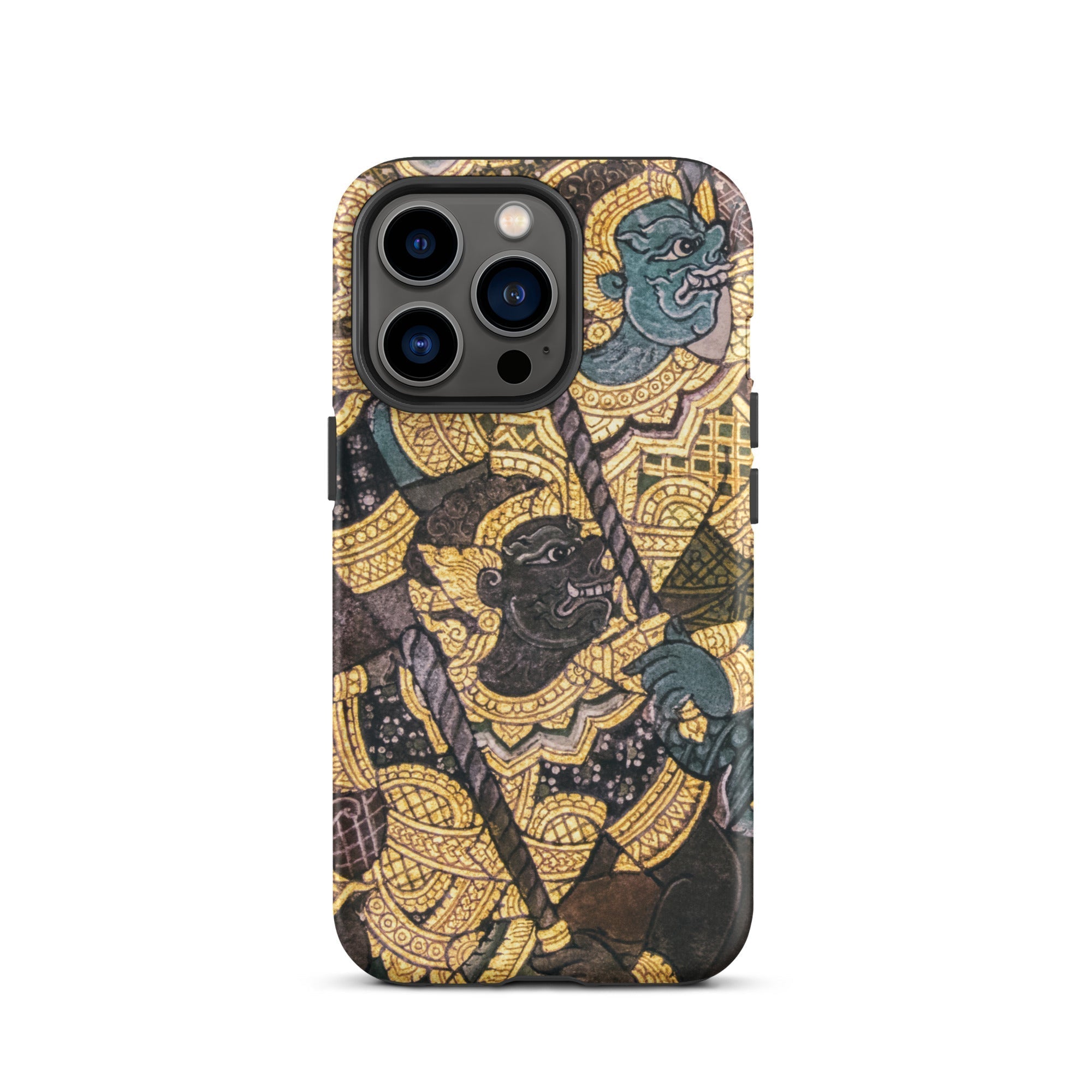 Avvolgi il tuo iPhone Nella mistica dell'antica arte tailandese con questo caso con una scena di battaglia di Ramayana affascinante. L'affresco, un tour de forza della pittura del tempio dell'era Ayutthaya, esplode con il dramma mitologico. Guerrieri dalla pelle di Ochre, gli arti ornati in una foglia d'oro luccicante, lance di scontri sotto corone ornate.