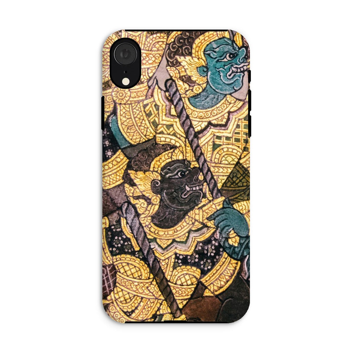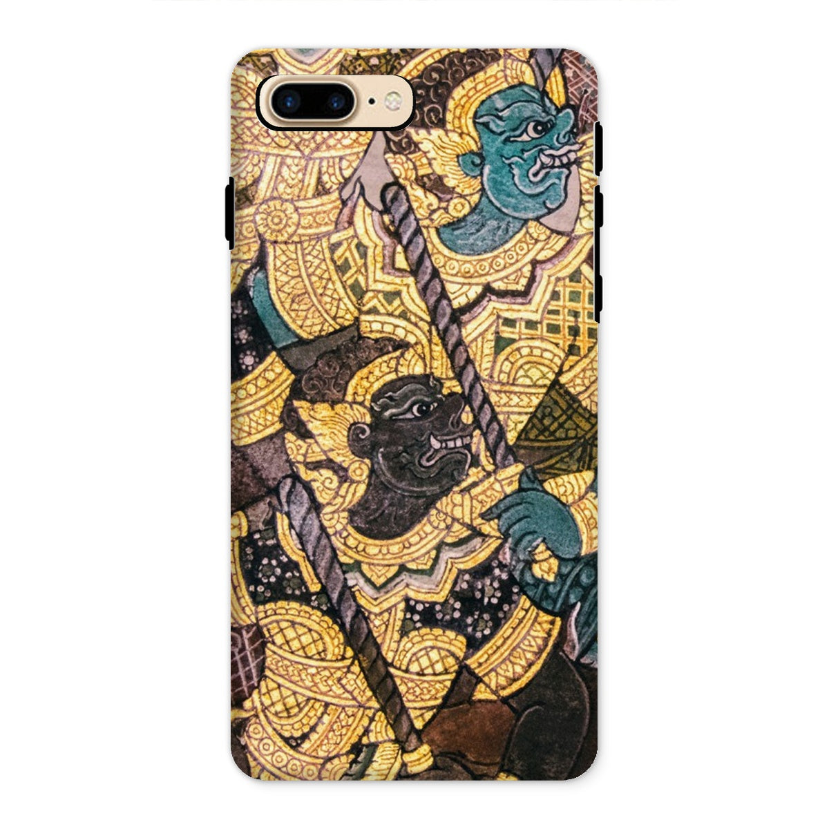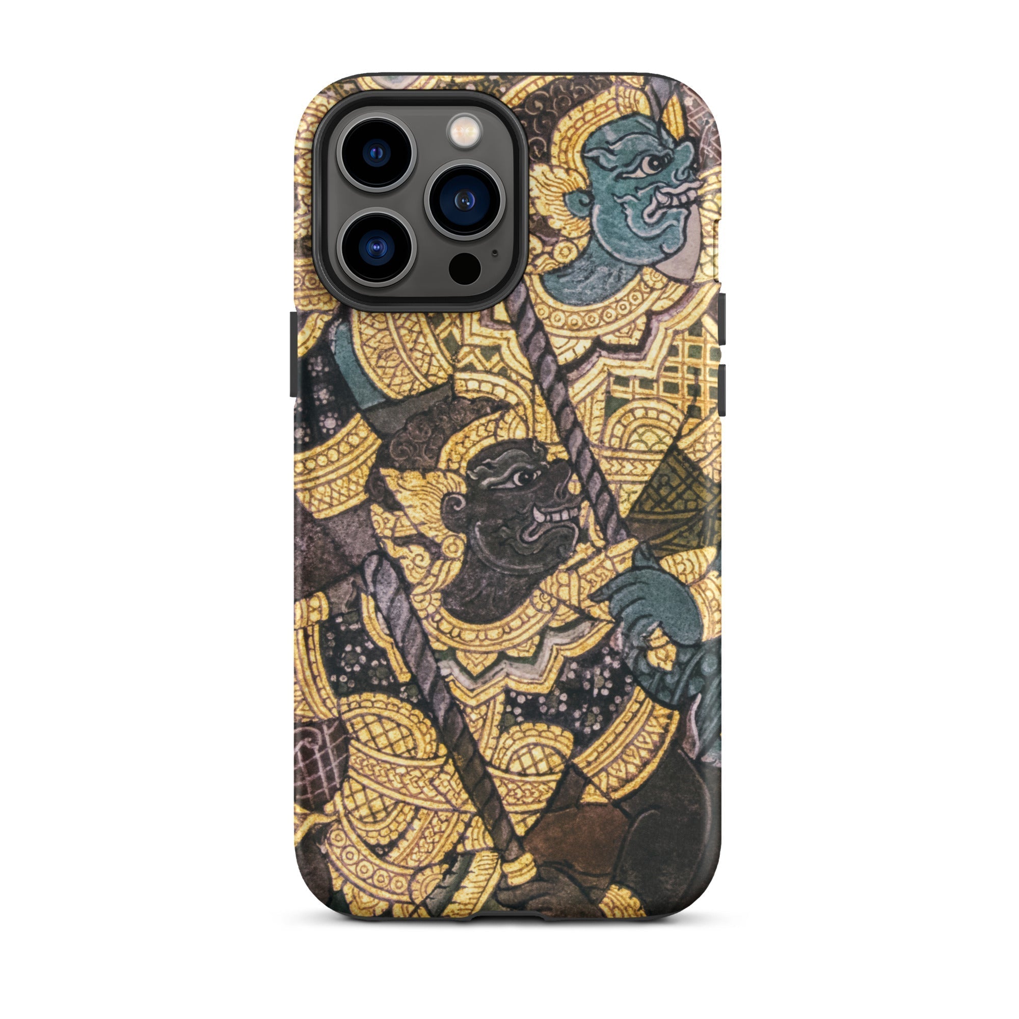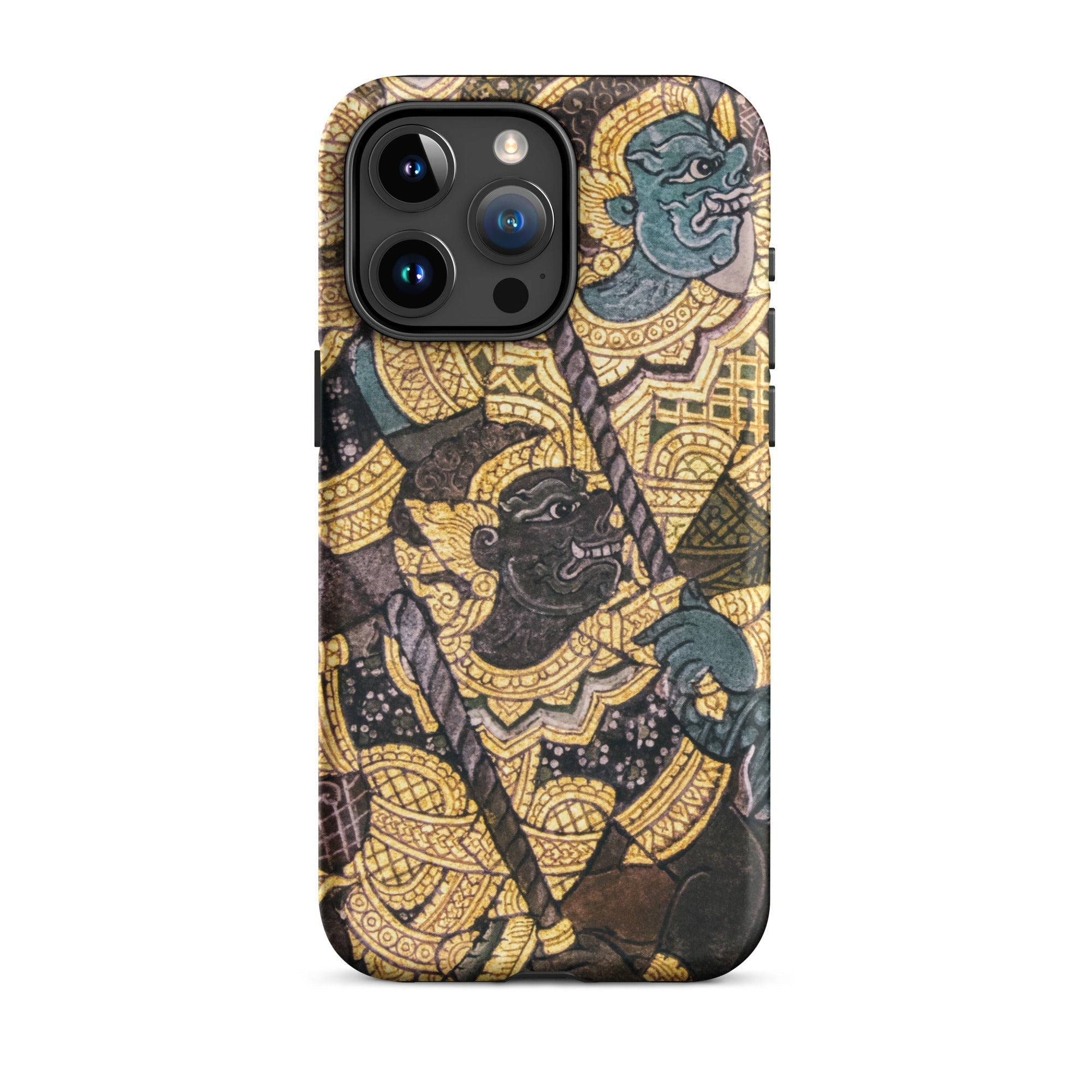 Avvolgi il tuo iPhone Nella mistica dell'antica arte tailandese con questo caso con una scena di battaglia di Ramayana affascinante. L'affresco, un tour de forza della pittura del tempio dell'era Ayutthaya, esplode con il dramma mitologico. Guerrieri dalla pelle di Ochre, gli arti ornati in una foglia d'oro luccicante, lance di scontri sotto corone ornate.