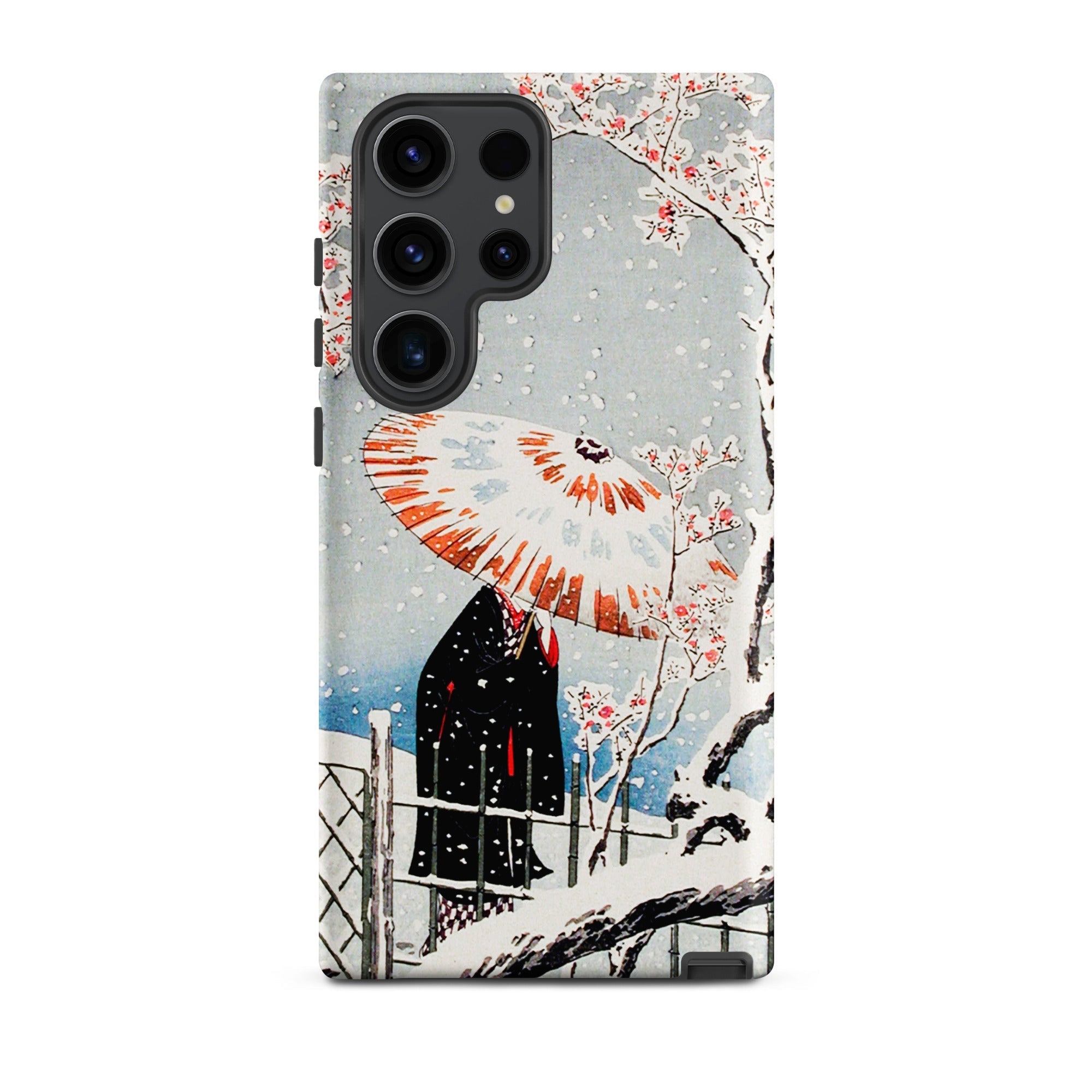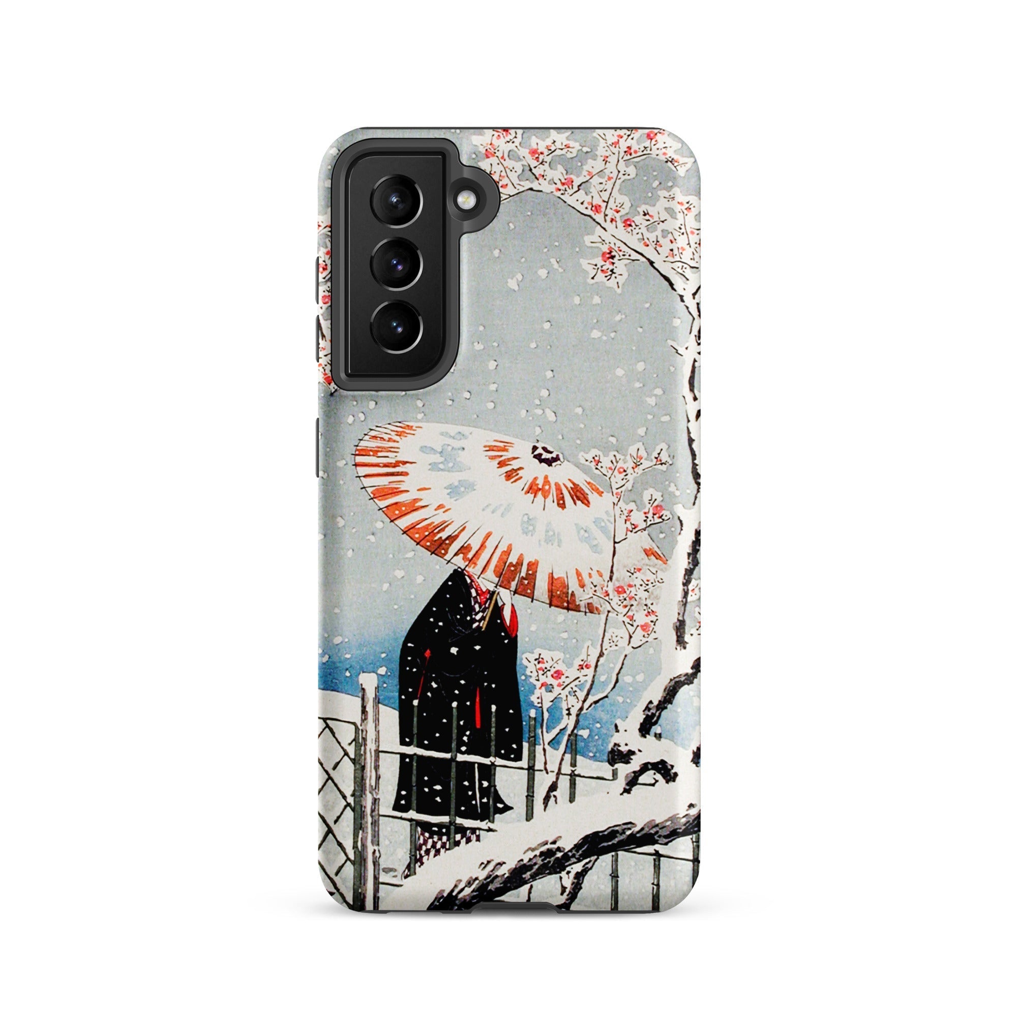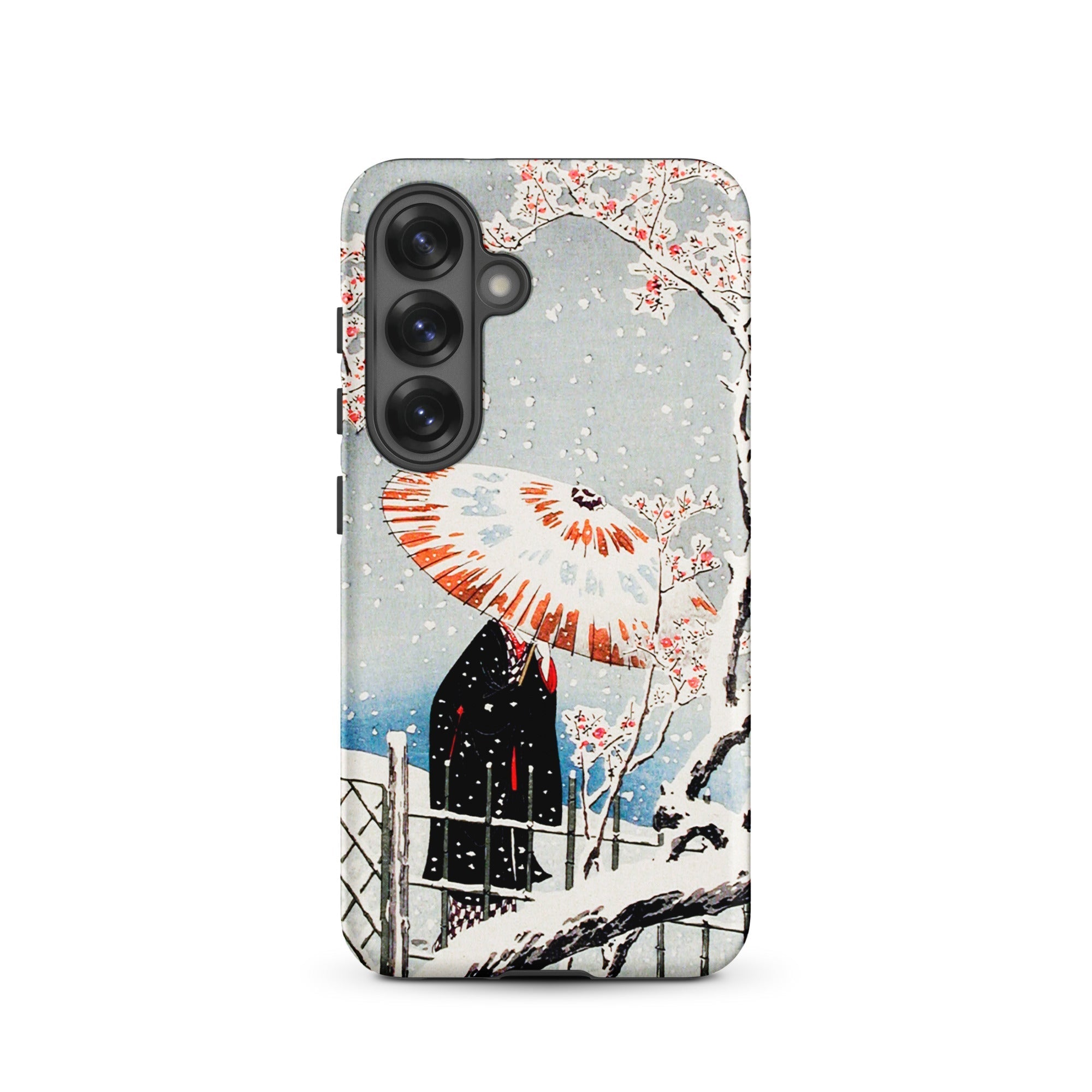 Su questa custodia Samsung, la serenità atmosferica diventa protezione tattile, una stampa portatile intrisa di sensibilità dell'era Taishō. Tienila, e tieni un momento in cui la nevicata e il fiore condividono lo stesso respiro del tempo.