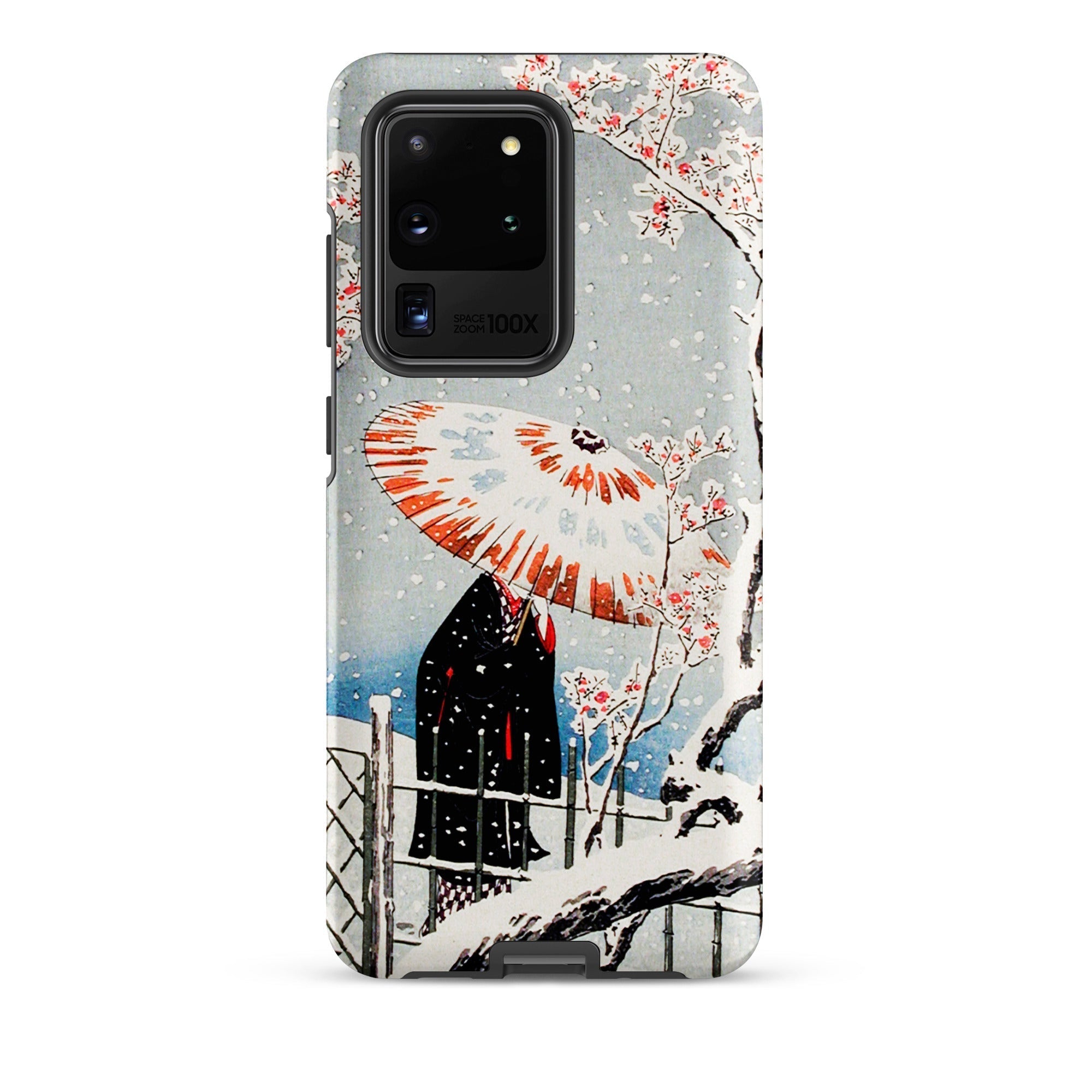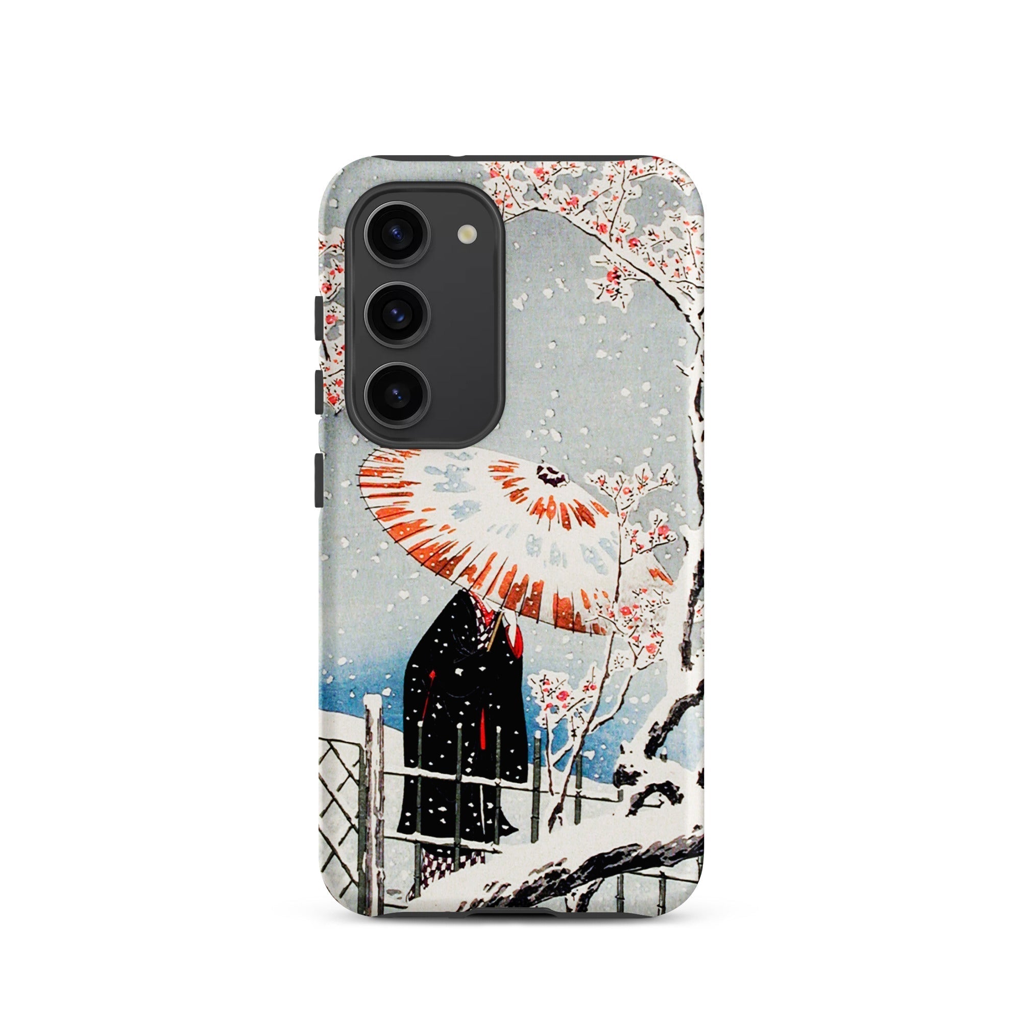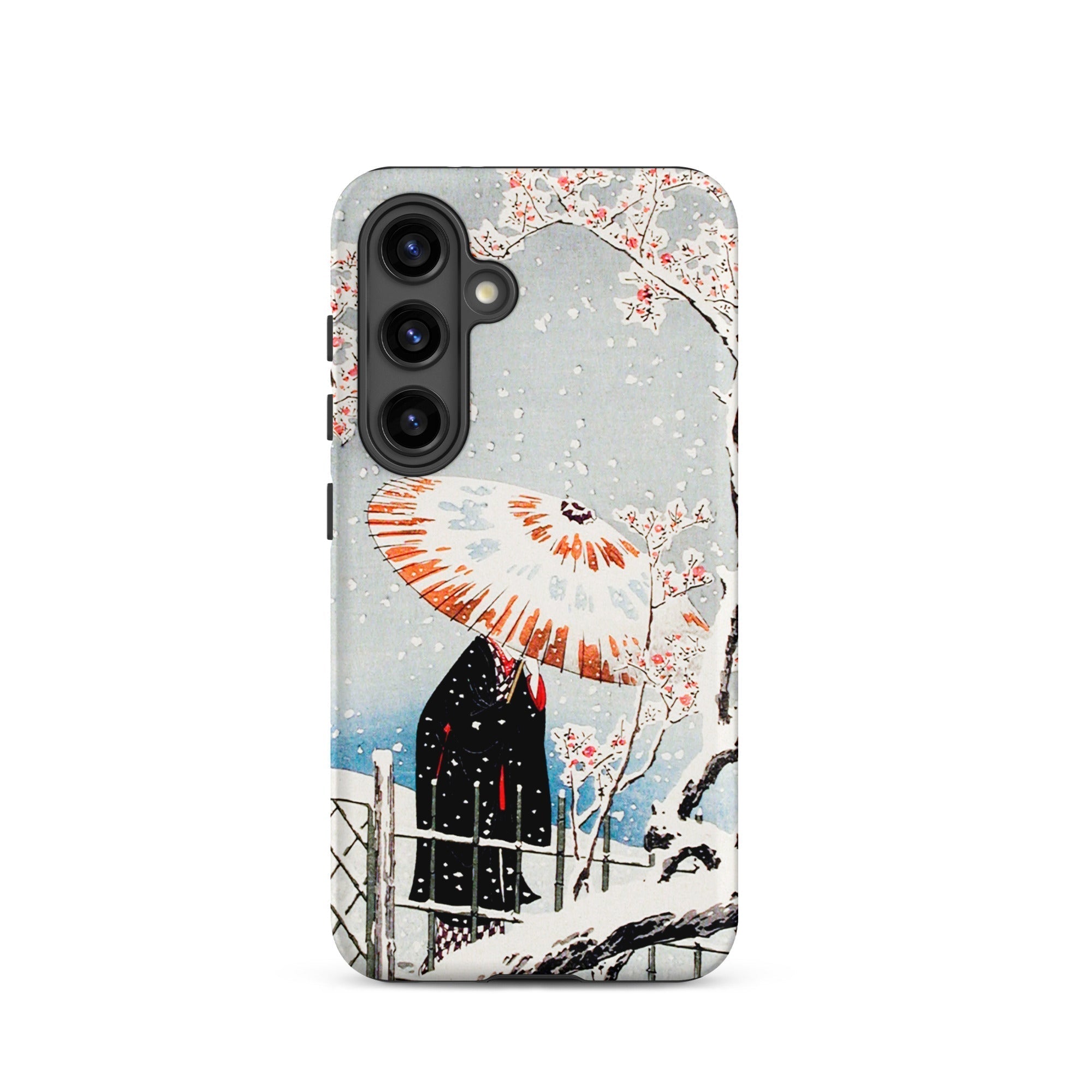 Su questa custodia Samsung, la serenità atmosferica diventa protezione tattile, una stampa portatile intrisa di sensibilità dell'era Taishō. Tienila, e tieni un momento in cui la nevicata e il fiore condividono lo stesso respiro del tempo.