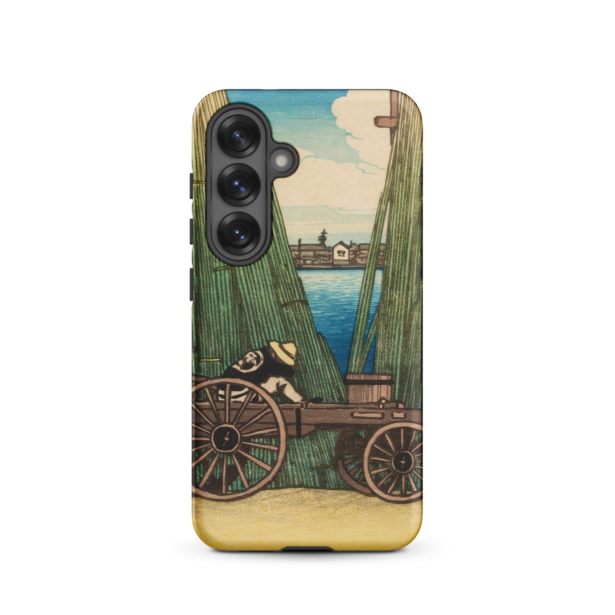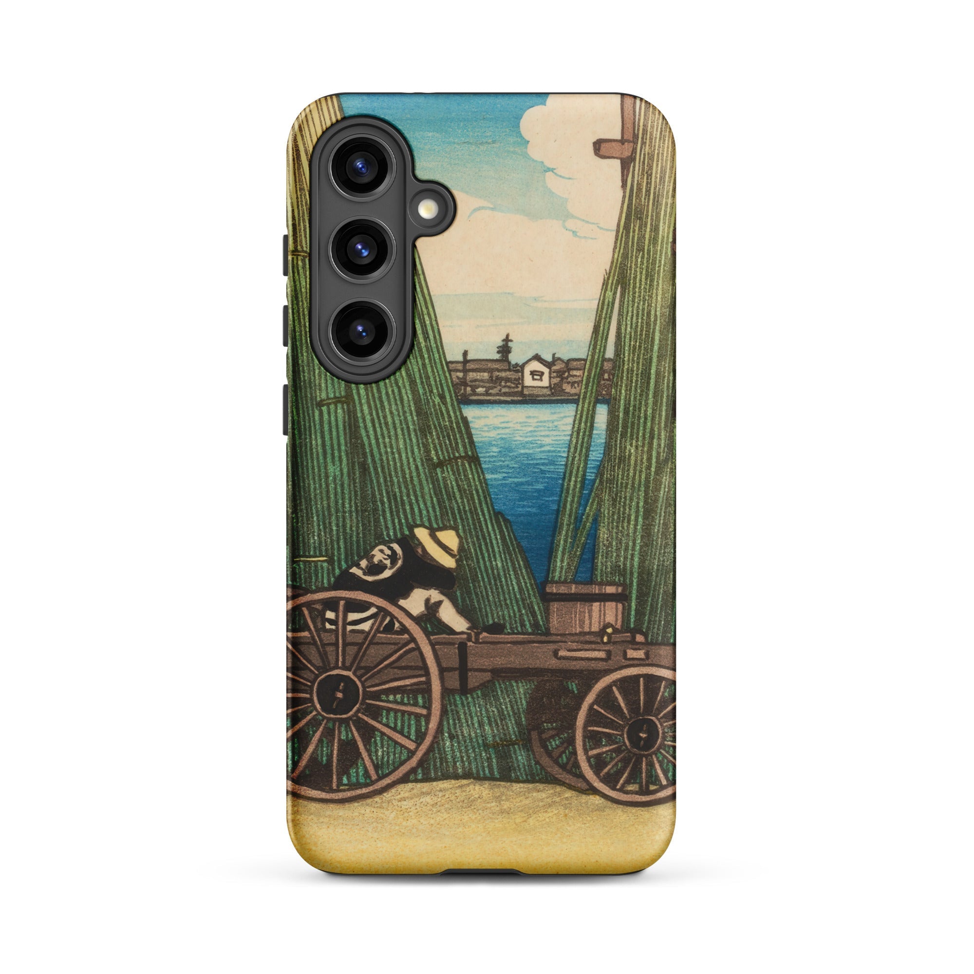 I tetti di Tokyo fluttuano oltre la corrente, bilanciando la tradizione con il ronzio del cambiamento dell'era Taisho. Questa custodia Samsung porta la visione lirica di Kawase del lavoro quotidiano e della quiete lungo il fiume, dove il cappello di paglia e la geometria della ruota parlano sia di continuità rustica che di soglia urbana.