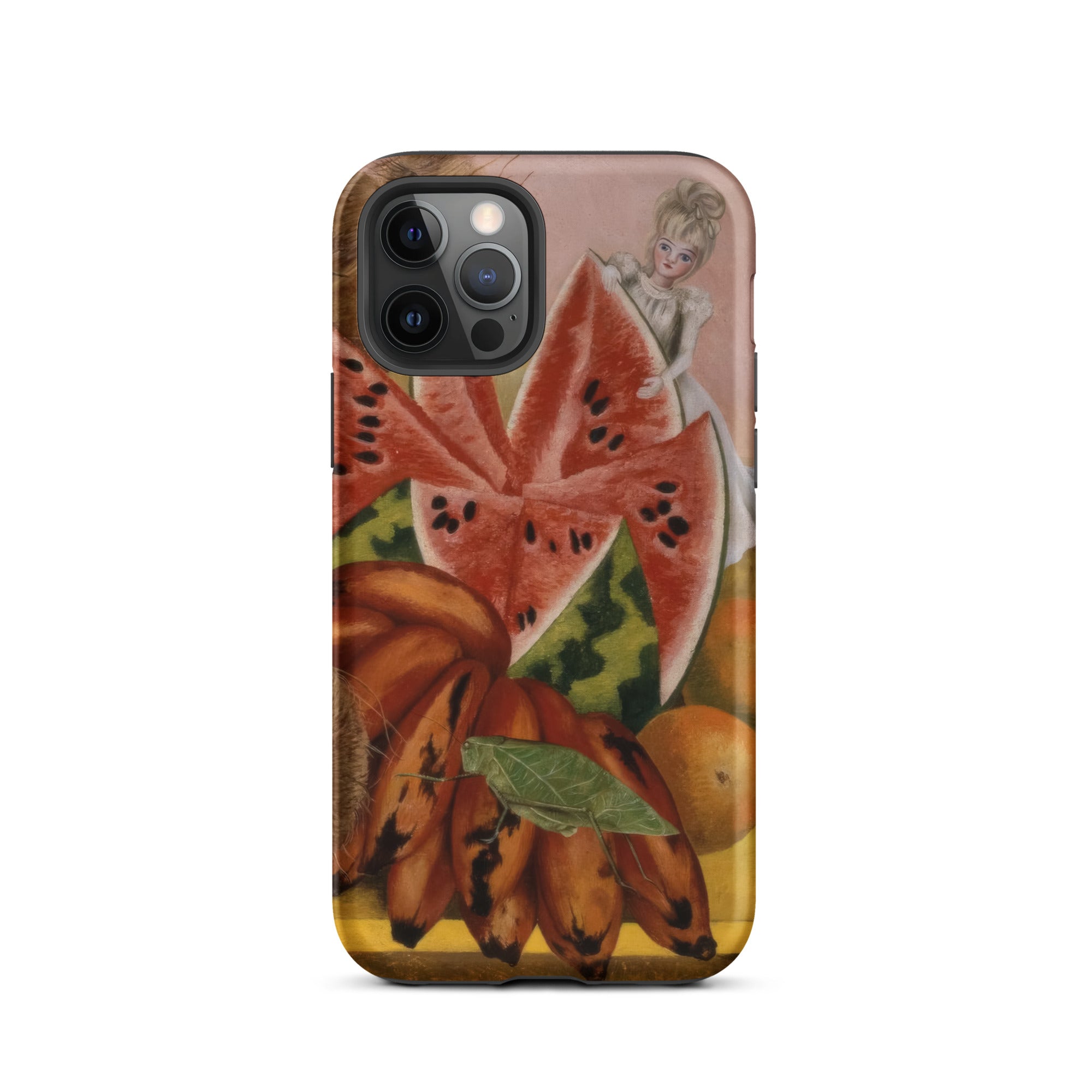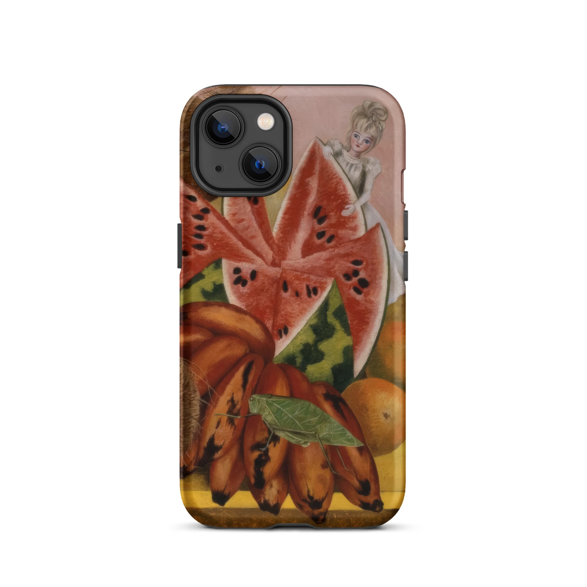 Kahlo forza l'innocenza a collidere con lo spettacolo crudo della fertilità, facendo collassare la tradizione della natura morta in un palcoscenico surreale di desiderio, paura e rivelazione. Stampato da bordo a bordo su questa custodia per iPhone, ogni dettaglio della sua composizione carica—polpa di frutta, ala di insetto, figura di porcellana—rimane vivido e inquietante. Un museo portatile del modernismo messicano carico di sottotoni psicoanalitici.
