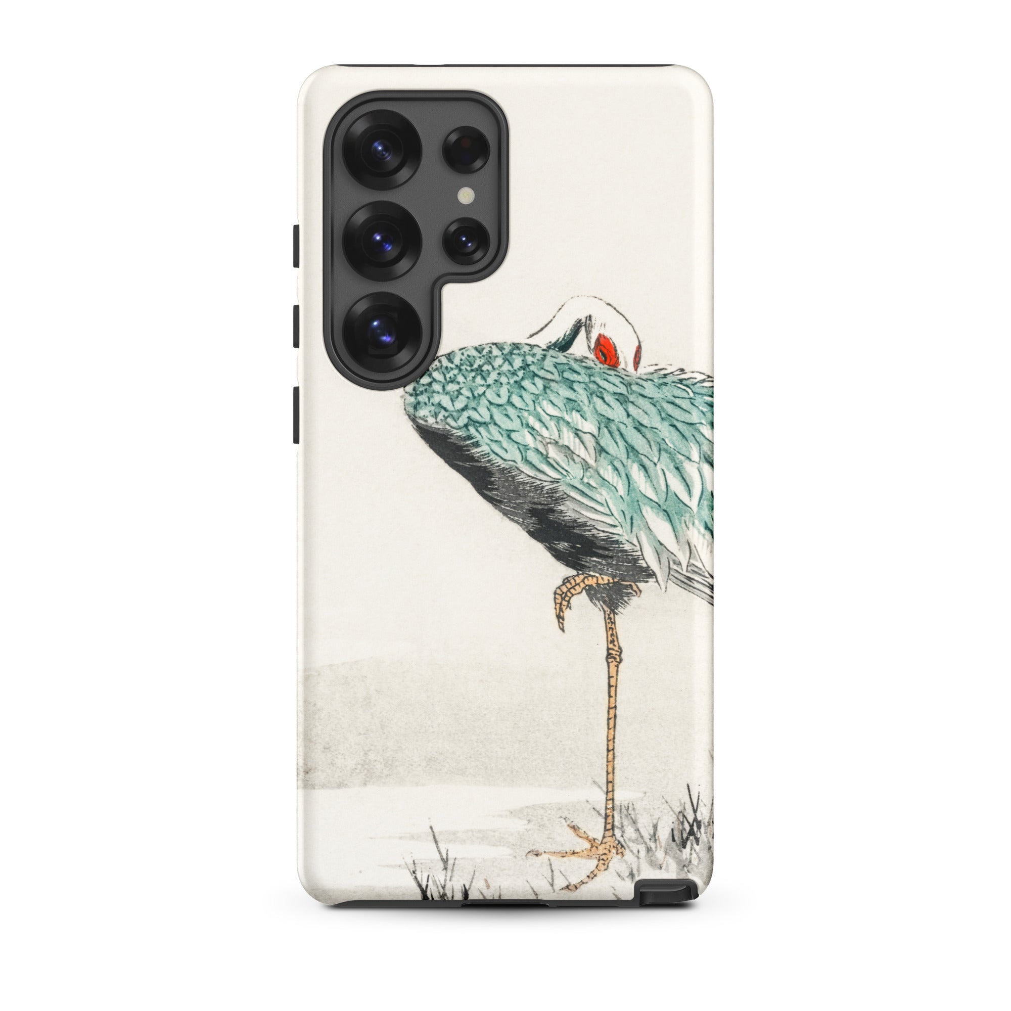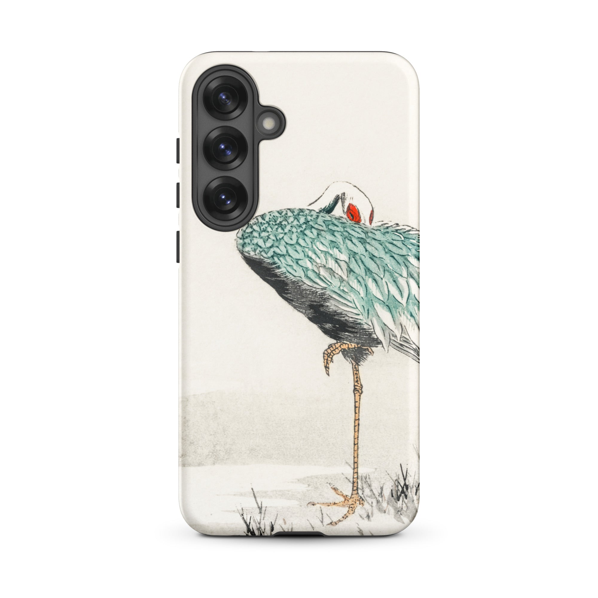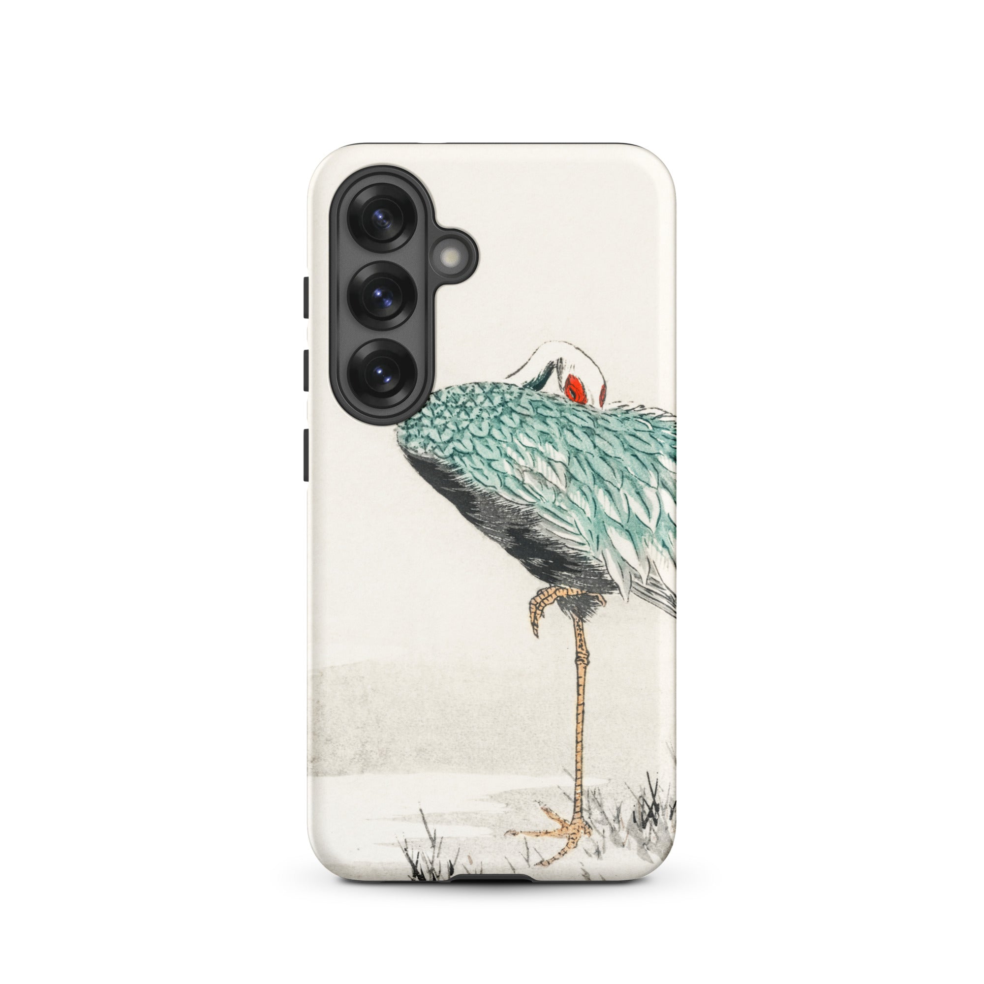 Una solitaria gru dal collo bianco si piega su se stessa, piumaggio smeraldo stratificato come squame laccate su ombre di carbone. La mezzaluna scarlatta al suo occhio brilla contro il pallido silenzio dell'inverno. Tratto dall'album di immagini di vari uccelli di Numata Kashu dell'era Meiji, questo design porta la precisione della stampa kachō-e sulla superficie curva della tua custodia Samsung.