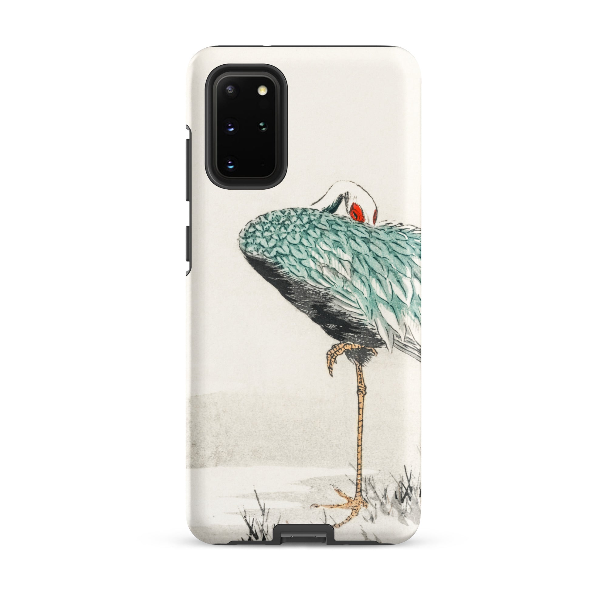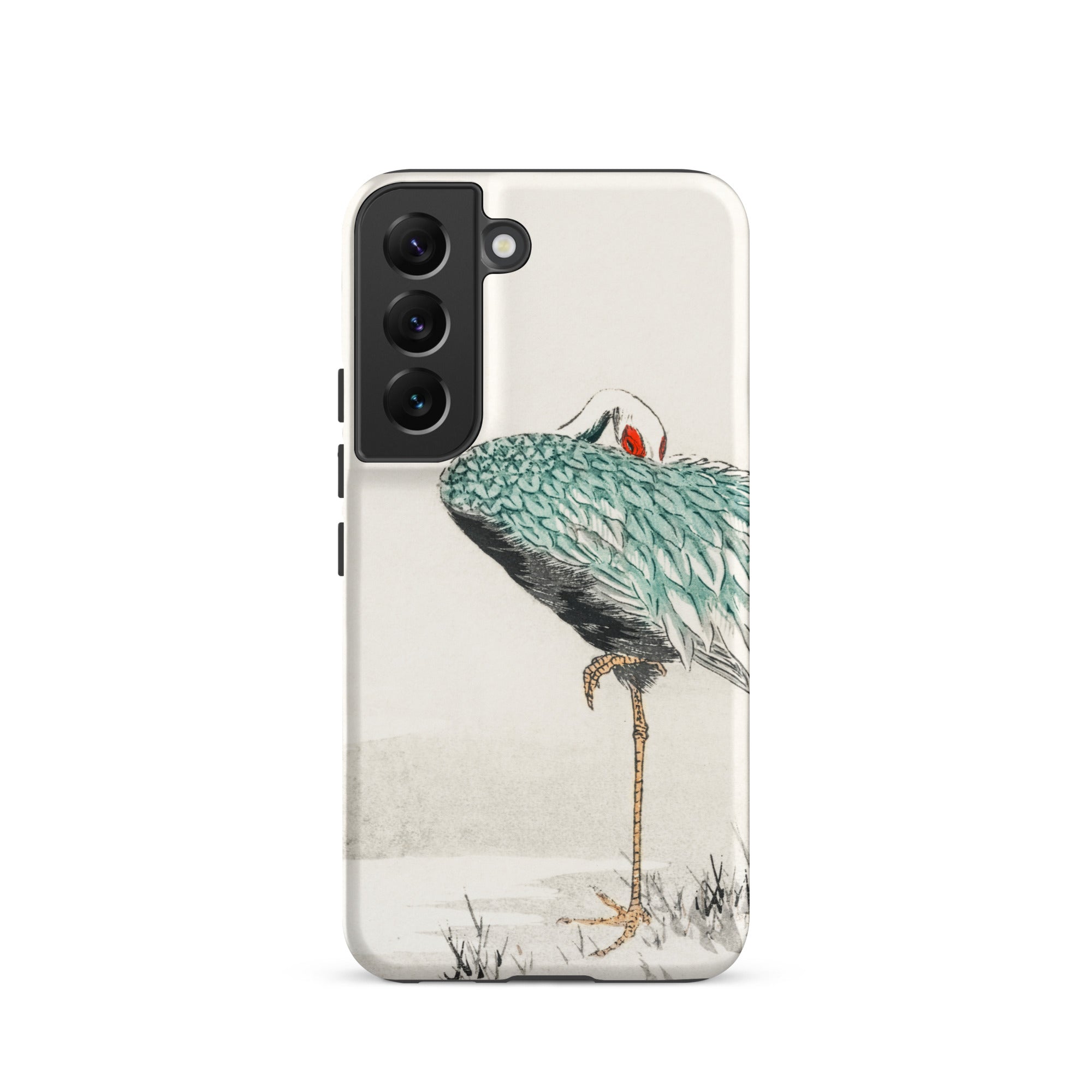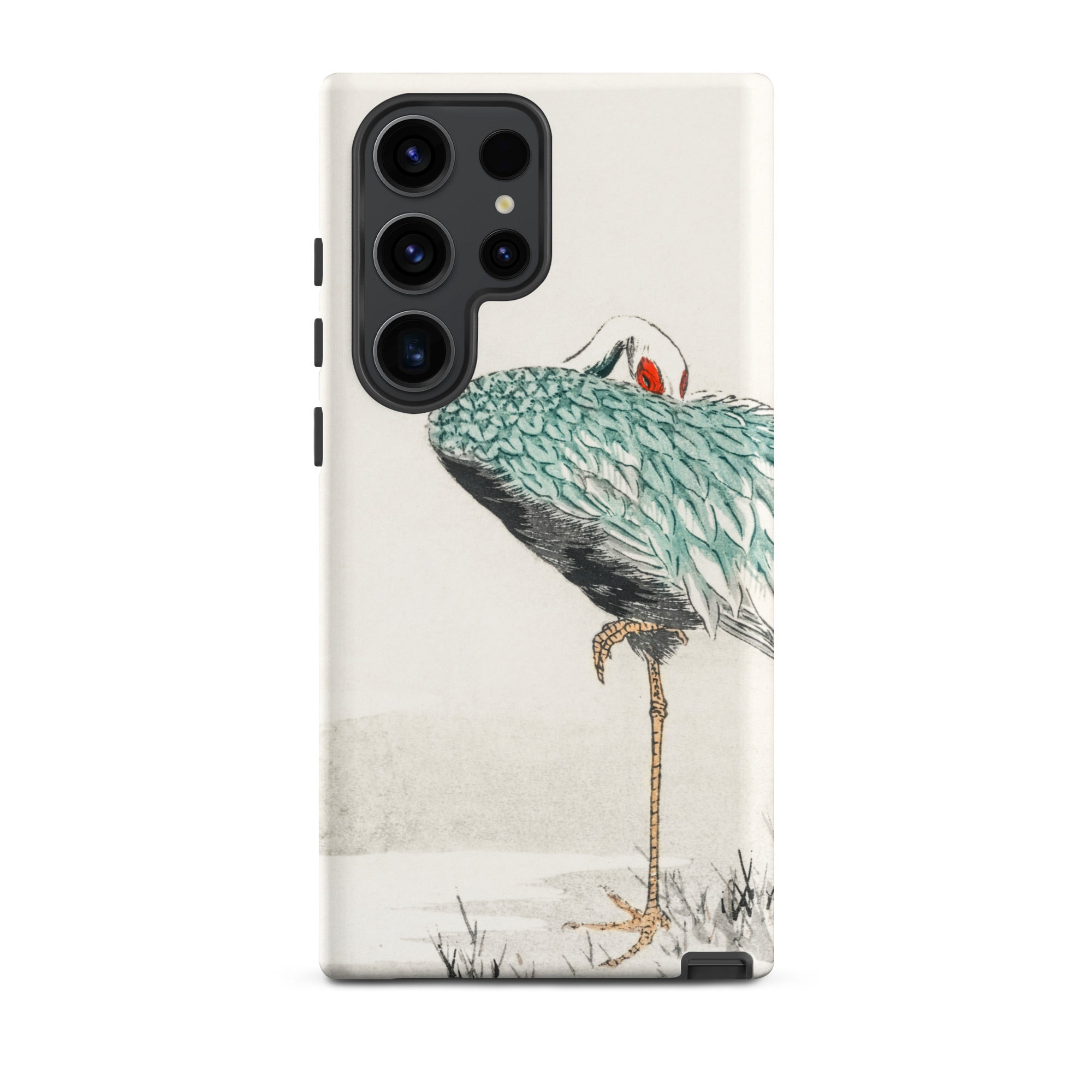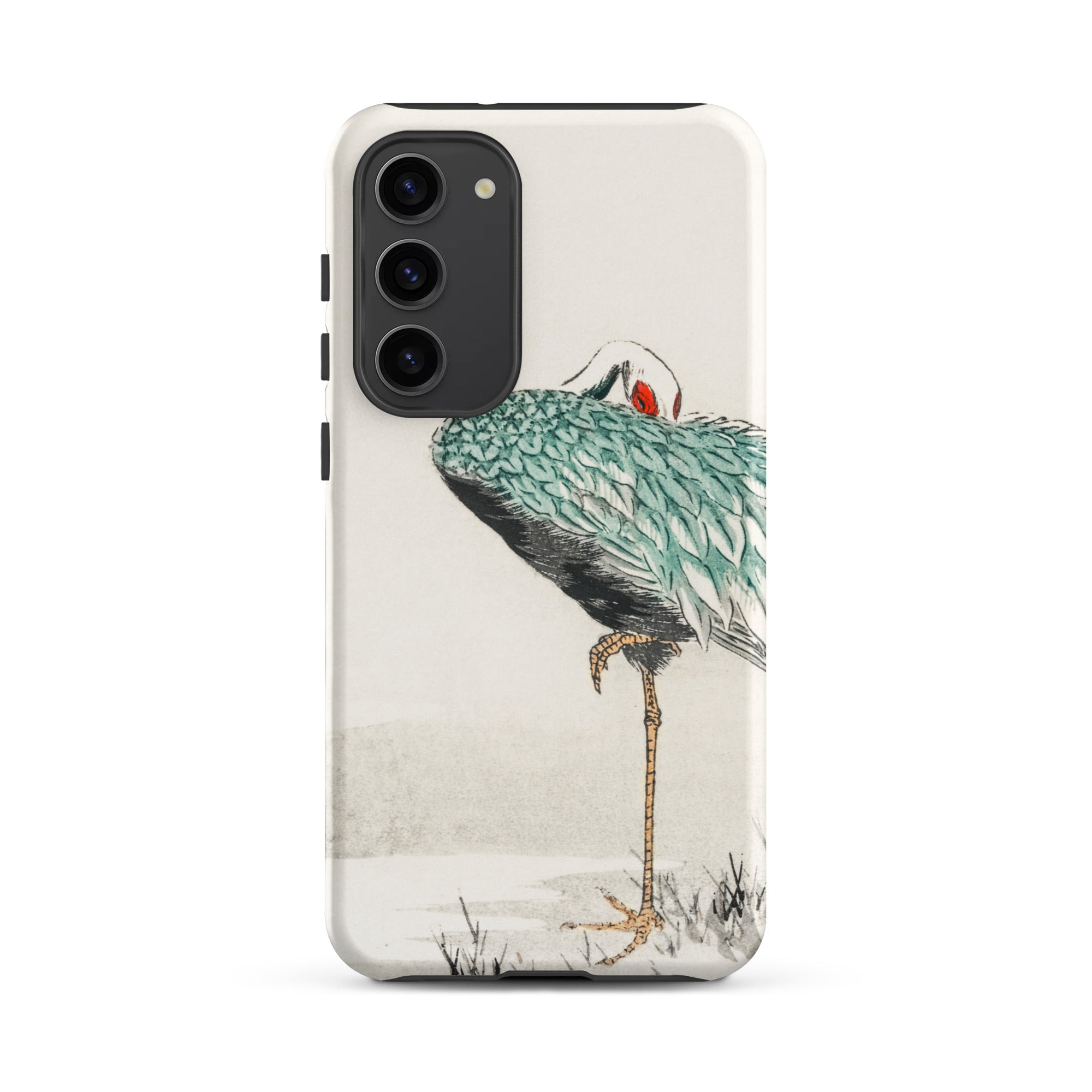 Una solitaria gru dal collo bianco si piega su se stessa, piumaggio smeraldo stratificato come squame laccate su ombre di carbone. La mezzaluna scarlatta al suo occhio brilla contro il pallido silenzio dell'inverno. Tratto dall'album di immagini di vari uccelli di Numata Kashu dell'era Meiji, questo design porta la precisione della stampa kachō-e sulla superficie curva della tua custodia Samsung.
