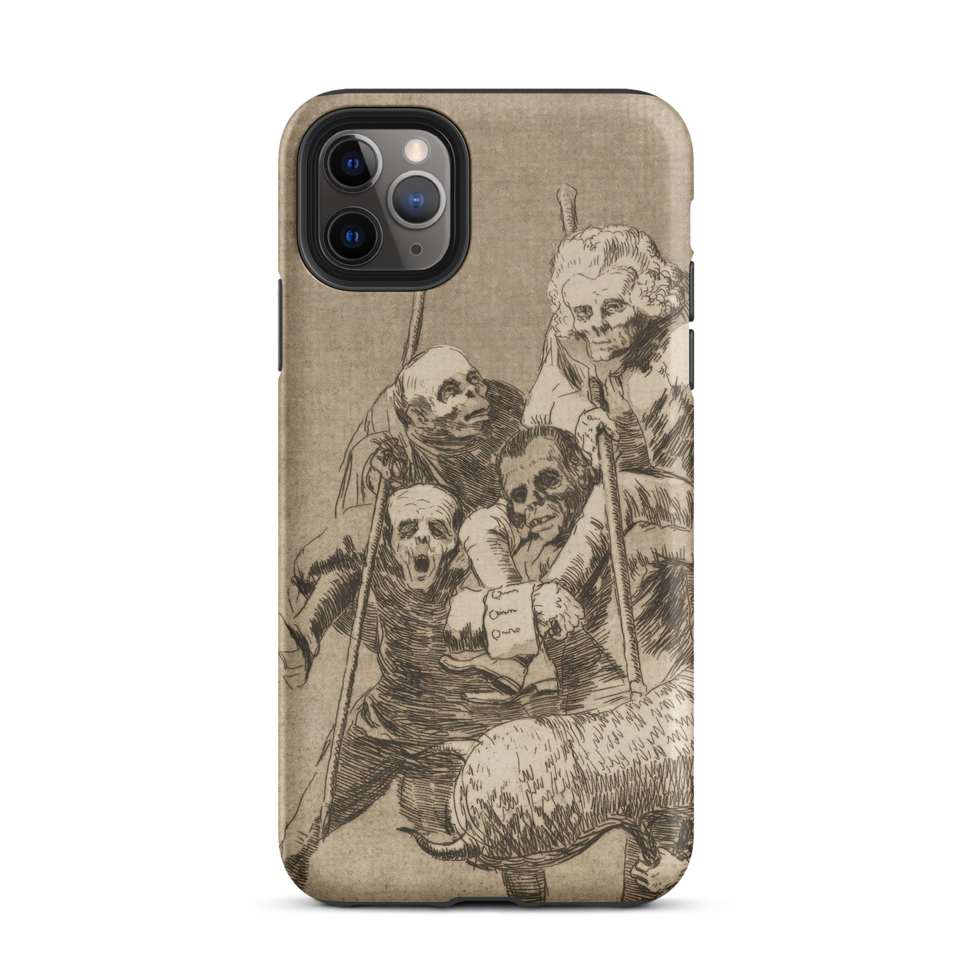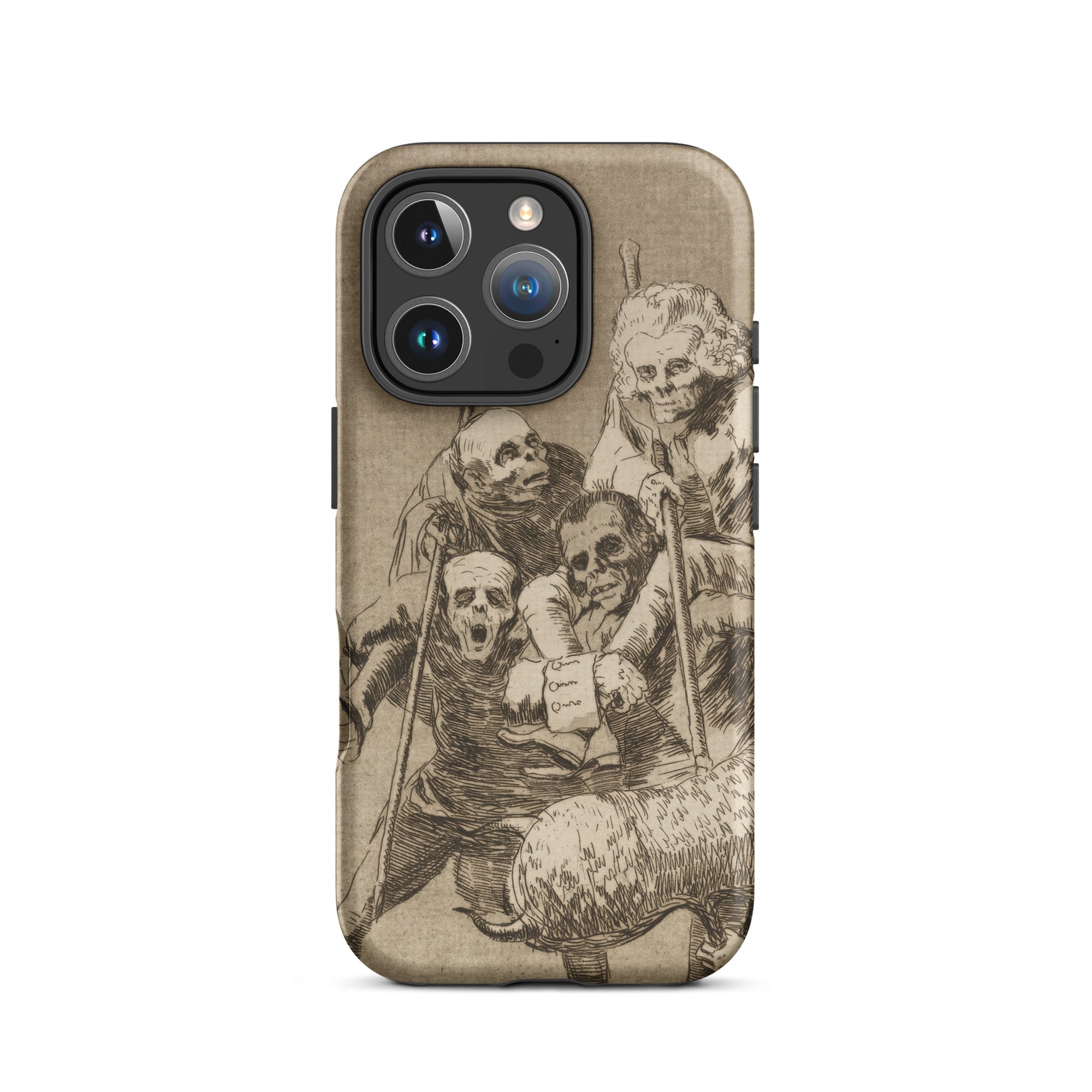 Il "What One Does to Another" di Goya mette in scena una cupa commedia di corpi intrecciati su questa custodia per iPhone. Le figure, magre e mascherate, si accalcano in una solidarietà grottesca, i loro bastoni e le braccia che si stringono le legano insieme in un teatro di sfruttamento.