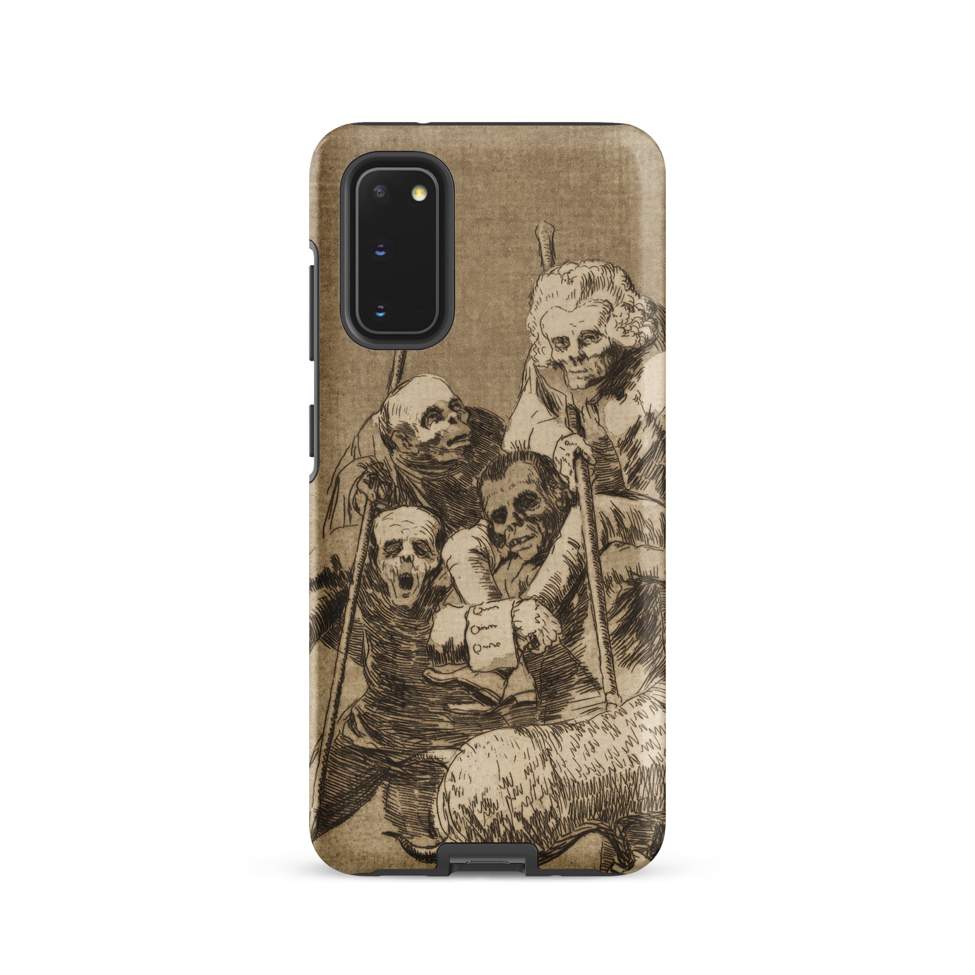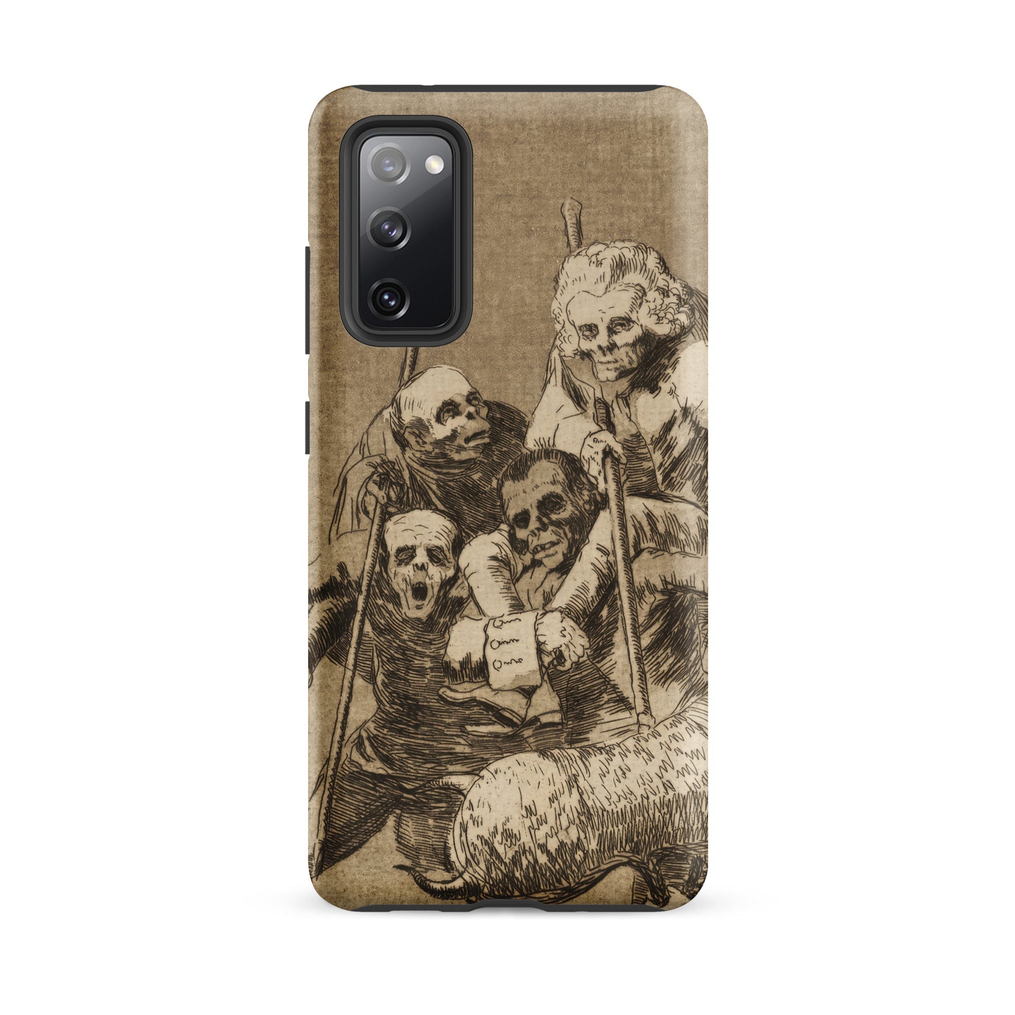 L'incisione di Goya trasforma i vizi umani in caricature mostruose, rivelando come la corruzione e lo sfruttamento prosperino in un abbraccio reciproco. I contrasti tonali netti amplificano sia il ridicolo che la minaccia, un mordente commento del diciottesimo secolo ora incorniciato nella scala intima di una custodia per telefono.