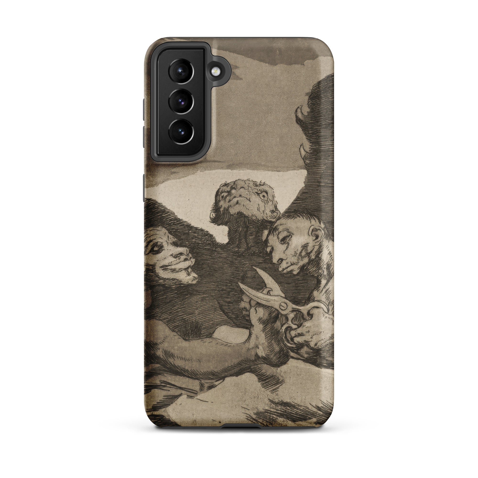 "Si Adornano" di Francisco de Goya emerge su questa custodia Samsung come una grottesca parodia della vanità. Figure con volti distorti si raggruppano insieme, una brandisce le cesoie sul piede artigliato di un'altra, il loro rituale di toelettatura incorniciato nel ridicolo.