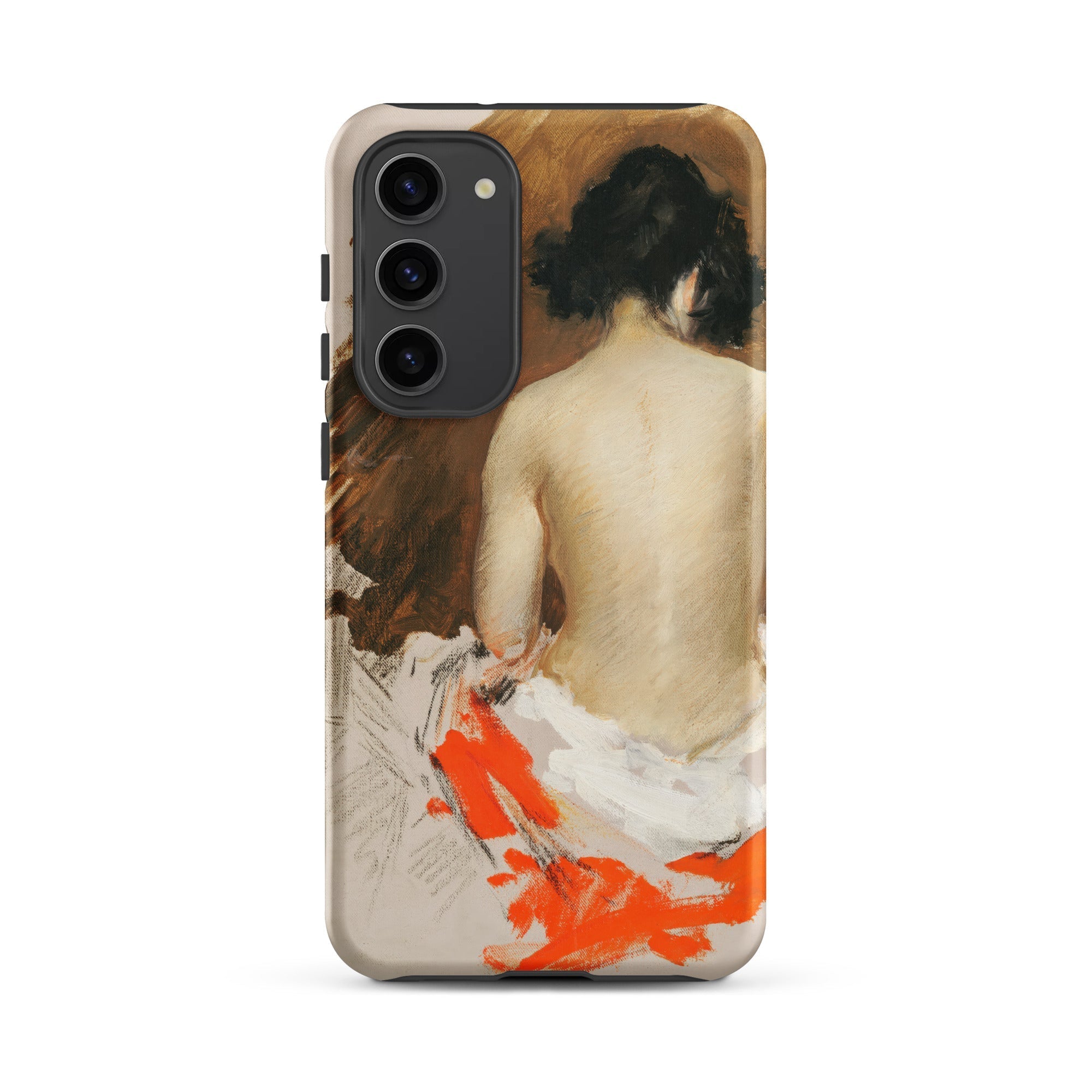Questa custodia Samsung porta con sé l'intimità dello studio dell'artista. Il pigmento a olio si ispessisce dove la luce si aggrappa alla pelle, assottigliandosi dove l'ombra inghiotte i dettagli. La schiena del nudo si curva in un arco silenzioso, le spalle impostate in una postura sia casuale che inconoscibile.