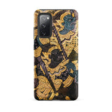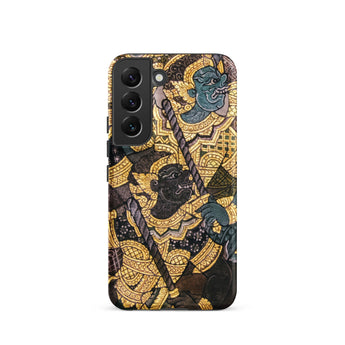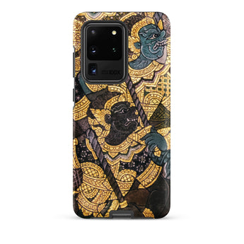 Questa custodia Samsung trasforma un dispositivo tascabile in un santuario in miniatura—risonante con affreschi di Bangkok, memoria della corte di Ayutthaya, lacca dorata, armatura celeste e la presenza protettiva dei yaksha, fieri sentinelle che brillano come guardiani scolpiti in cerimonia perpetua.