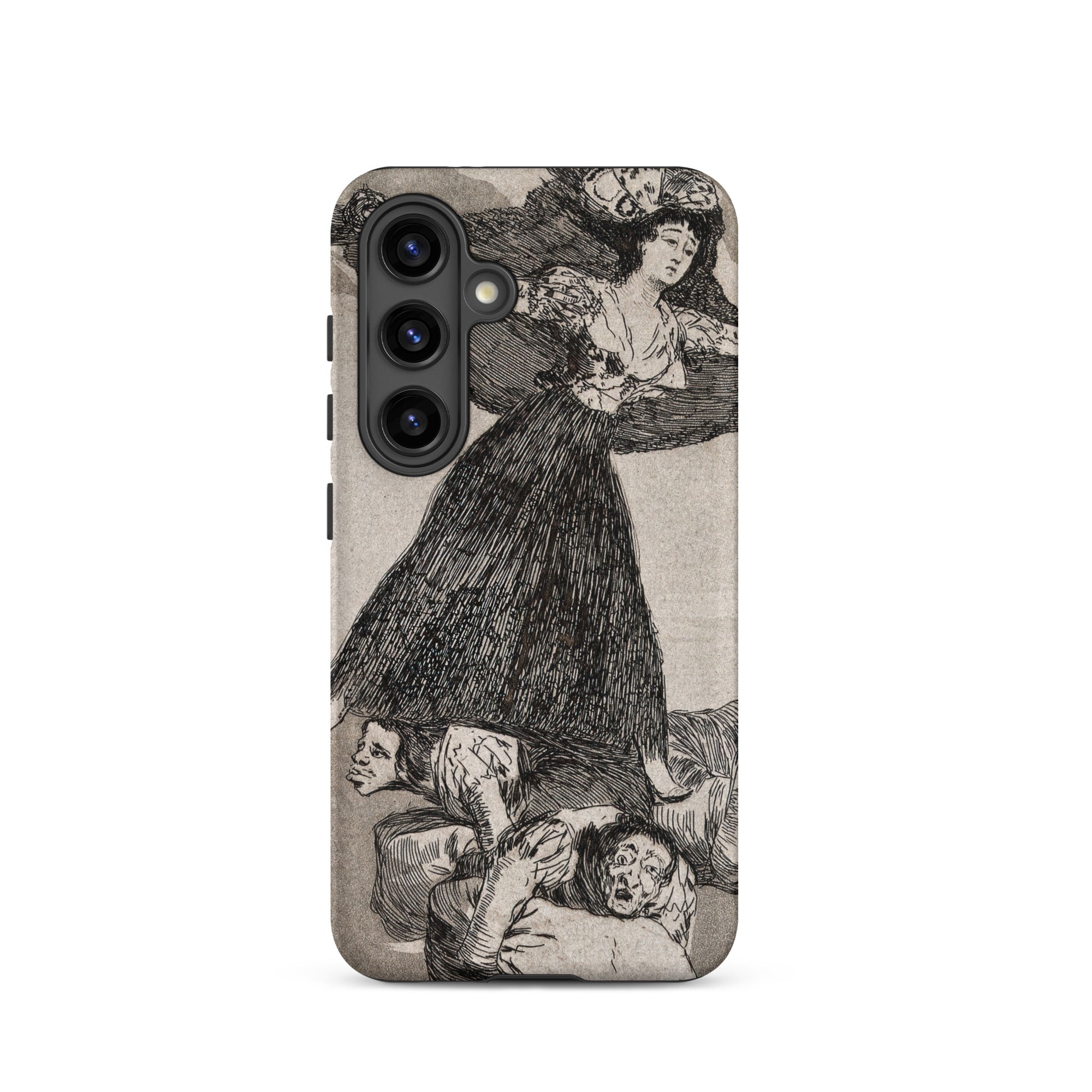 La figura incisa di Goya si alza come uno spirito condannato. La sua gonna avvolge la composizione, i corpi che crollano sotto il suo peso. Questa custodia Samsung preserva le bave incise e le gradazioni tonali dell'acquatinta, ombre che premono contro i punti luce pallidi. Ciò che tieni è sia oggetto che critica: uno sguardo nella Spagna della fine del diciottesimo secolo, dove superstizione, follia e crudeltà venivano sezionate con l'inchiostro.