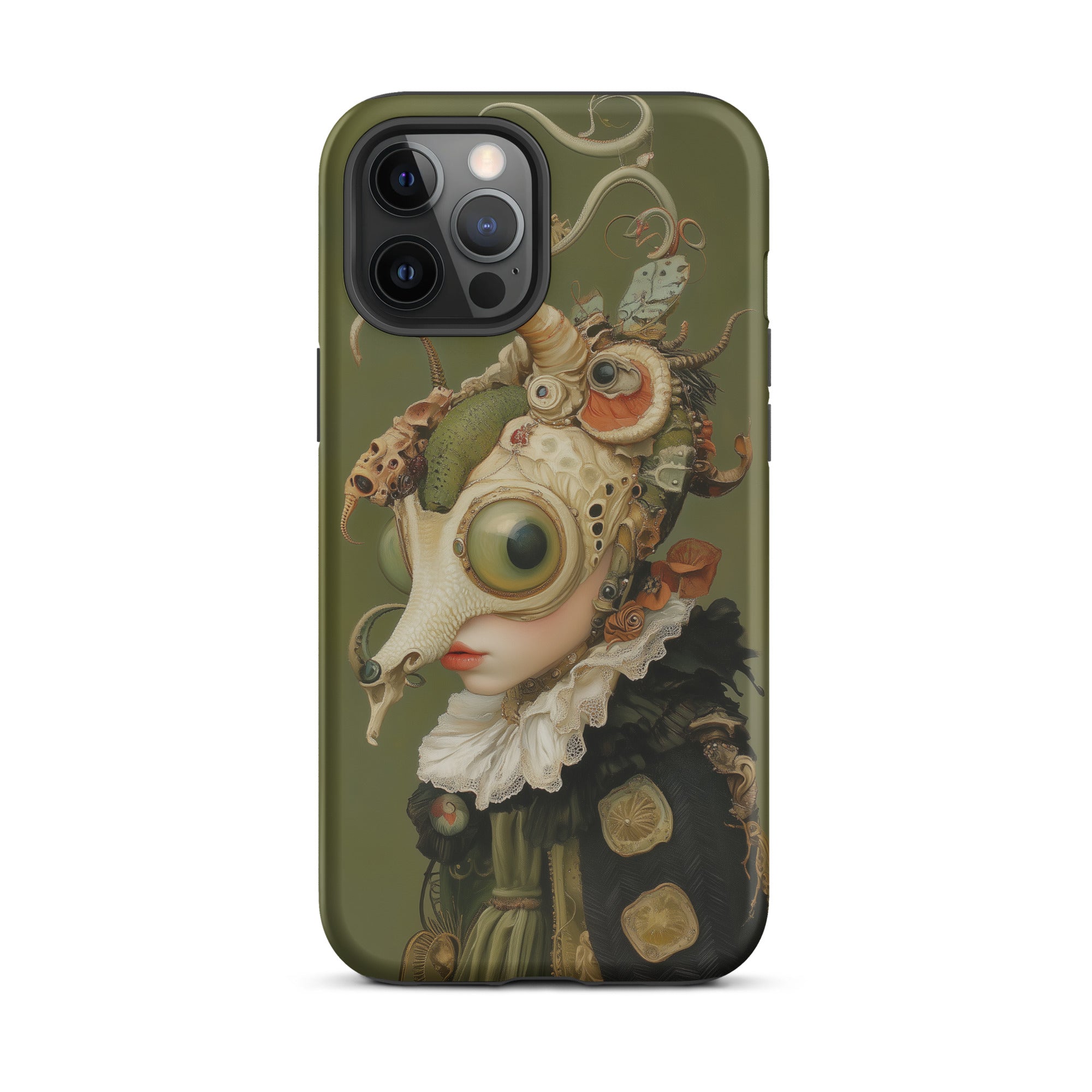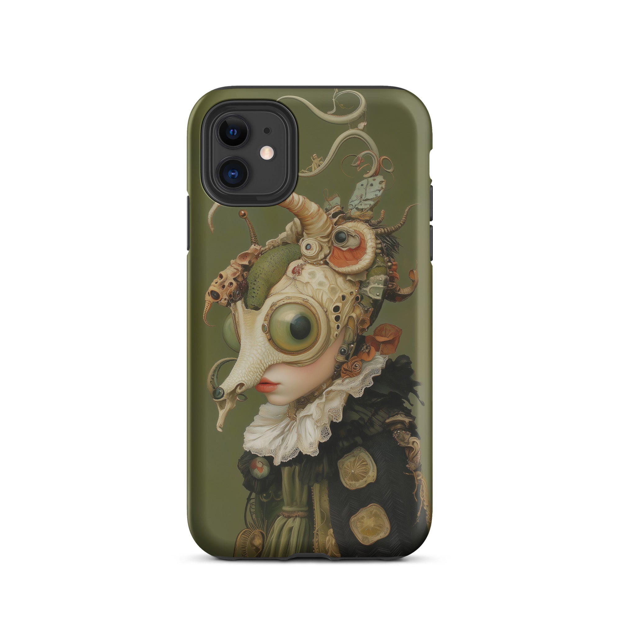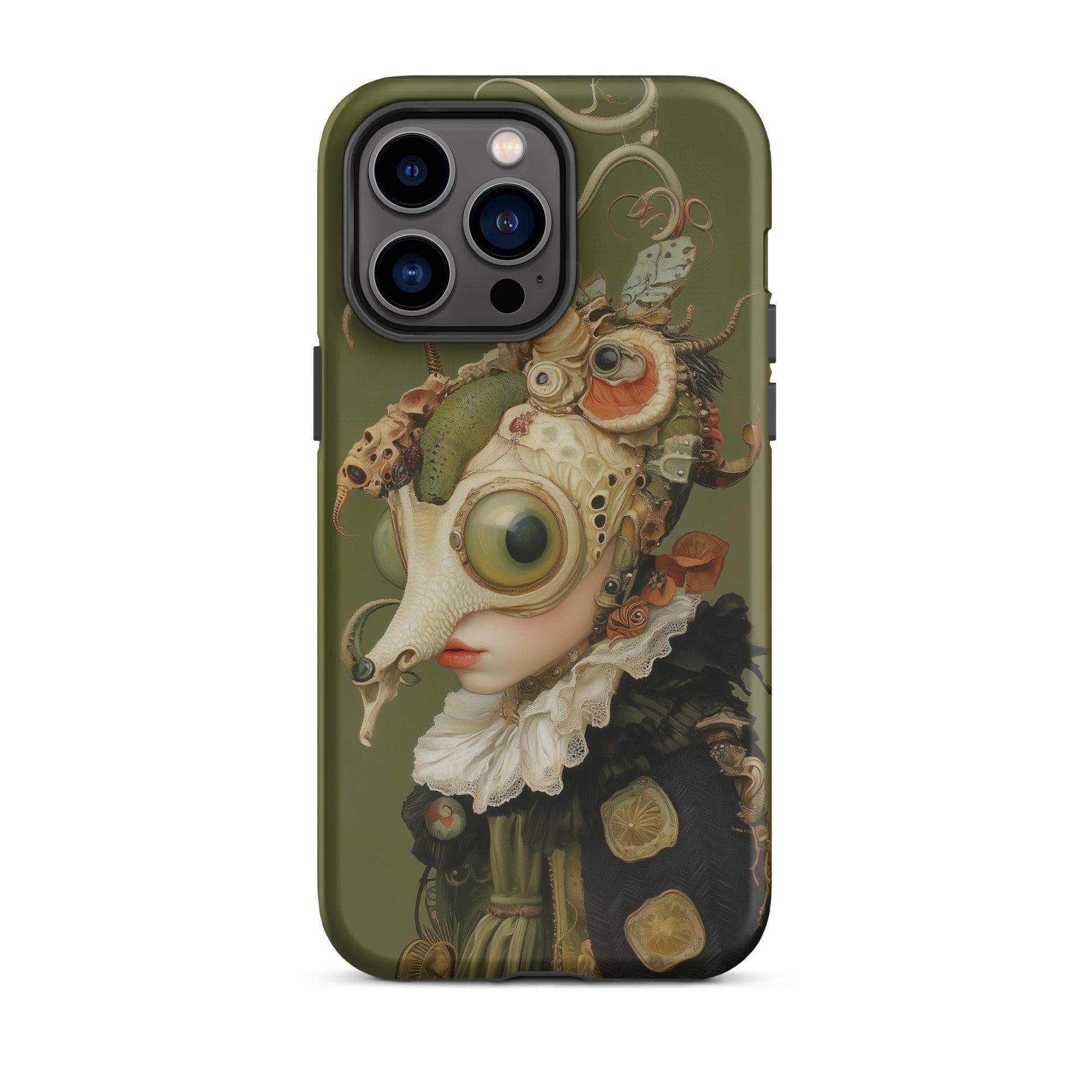 Il tessuto della sua esistenza è cucito dai frammenti di un sogno gotico stravagante, drappeggiato in colletti arruffati e cucito con segreti. Il surrealismo barocco pulsa attraverso la sua forma, tessendo echi di fiabe dimenticate con il tranquillo ronzio di una fantasia cibernetica ultraterrena. Una fusione di orrore etereo e illustrazione naturalistica d'avanguardia, questa custodia trasforma il tuo telefono in una reliquia di impossibile bellezza.