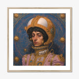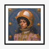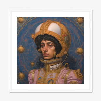 Samir fluttua nell'immensa distesa silenziosa, né perso né in cerca—semplicemente diventando. Un gay astronauta musulmano, avvolto nel peso della storia e nell'assenza di peso dello spazio. La sua tuta cucita con gli echi calligrafici di sogni dimenticati. Evocando iscrizioni che un tempo adornavano le cupole di Damasco, i minareti di Samarcanda. Ogni filo dorato si avvolge come l'orbita di un pianeta errante, ogni linea un verso di poeti silenziati dal tempo ma mai dalla verità.