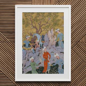 Questa stampa d'arte immortala un ideale persiano—l'arte come disciplina, il paradiso come ordine dipinto, la caccia trasformata in allegoria per il pensiero stesso, il suo splendore articolato attraverso colori così intricati che sembrano tessuti piuttosto che dipinti.