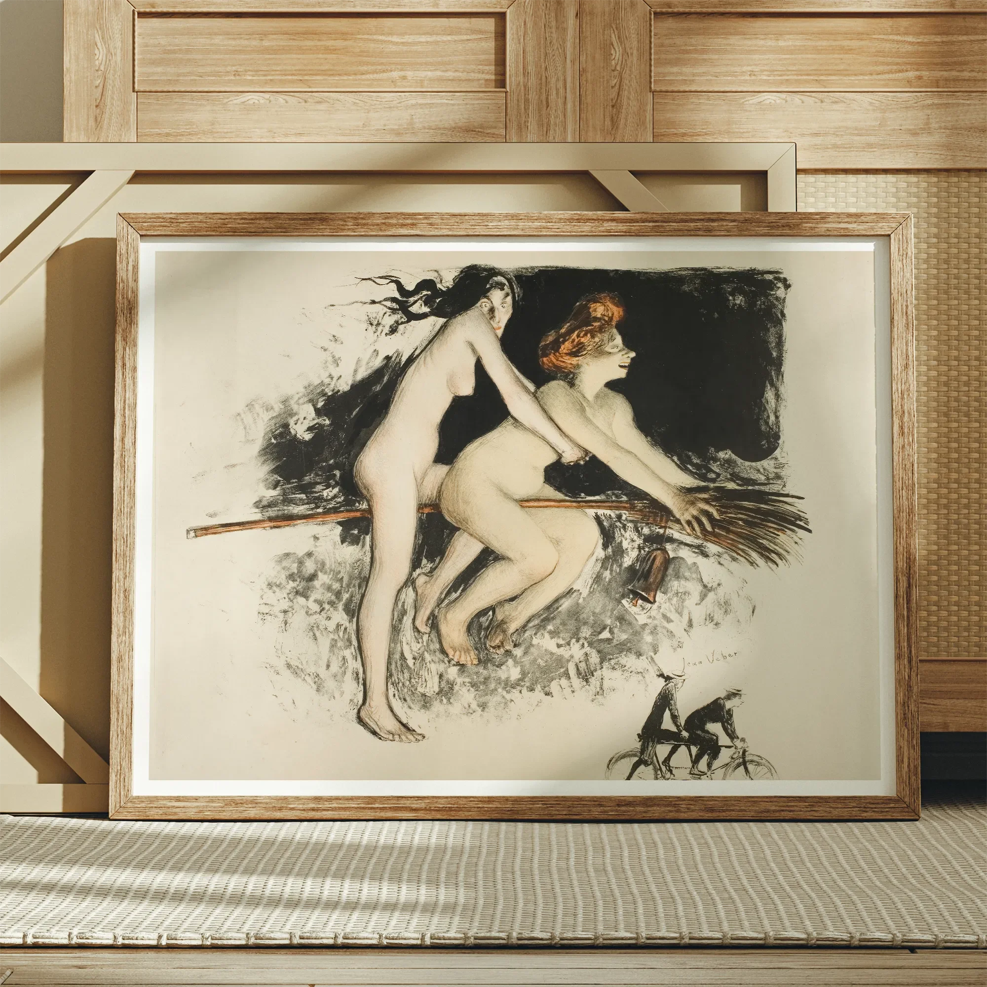 Due streghe si fondono in movimento, un impossibile tandem di carne e scopa, tagliando l'aria ocra densa di fumo e risate. La litografia di Veber trema tra il ridicolo e la rivelazione. Queste donne di magia nera disegnate come caricature della paura degli uomini. La loro velocità illuminata da un giallo sulfureo e il pulsare del caos fin-de-siècle.