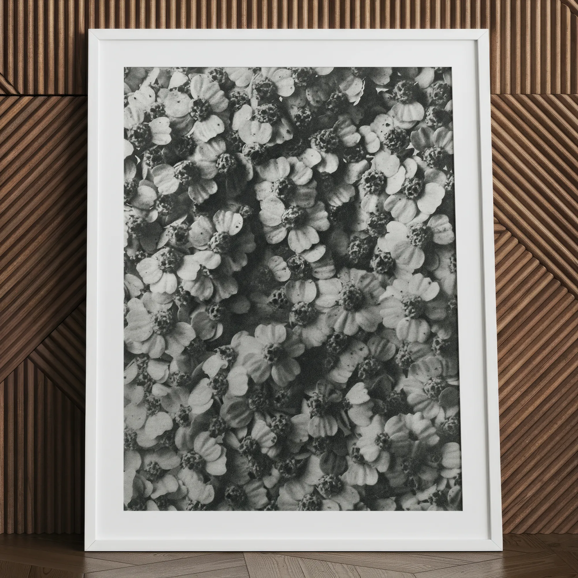 Stai guardando un arazzo monocromatico della intricata bellezza della natura. Karl Blossfeldt sta bene stampa d'arte Cattura la delicata essenza di Achillea Millefolium, comunemente nota come Yarrow. Questa fotografia botanica in bianco e nero trasforma l'umile flusso selvatico in una composizione astratta accattivante.