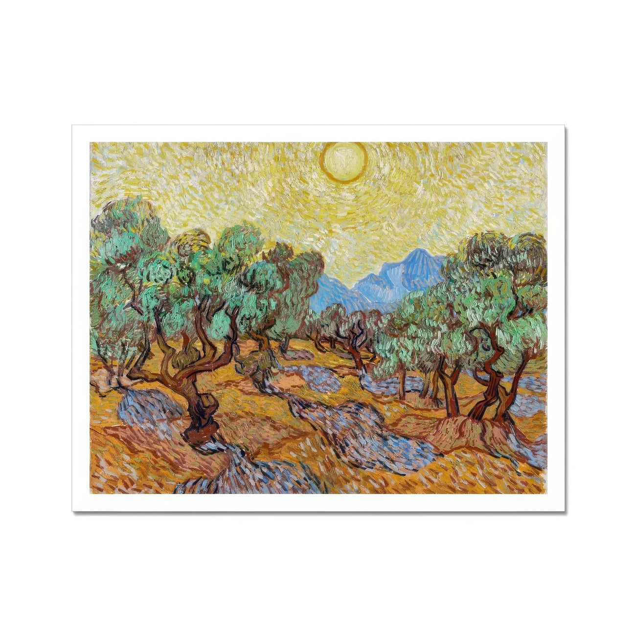 Questa stampa post-impressionista avvolgerà le tue pareti con il genio febbrile di Van Gogh, trasportandoti nei boschetti provenzali baciati dal sole. Tronchi di ulivo contorti si ergono verso il cielo, le loro foglie argentate brillano sotto un orbe giallo pulsante. Ti meraviglierai della tecnica dell'impasto dell'artista, creando un arazzo tattile di ocra ondulate e tonalità verdi.
