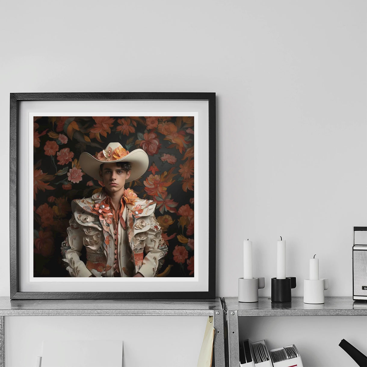 Andrés è un sorprendente vaquero ispanico gay dove l'identità queer converge con le ricche tradizioni equestri dell'eredità cowboy iberica e sudoccidentale. Questa stampa d'arte di qualità museale cattura un momento di bellezza radicale: un vaquero moderno adornato con filigrana ispirata al rococò, in piedi contro uno sfondo di opulenza floreale barocca. Il suo traje de luces, scolpito in pelle avorio e ricamato con delicati fiori d'arancio, è una lettera d'amore sia alle tradizioni dorate della cultura spagnola del vaquero che all'espressione di sé senza compromessi dell'arte gay.