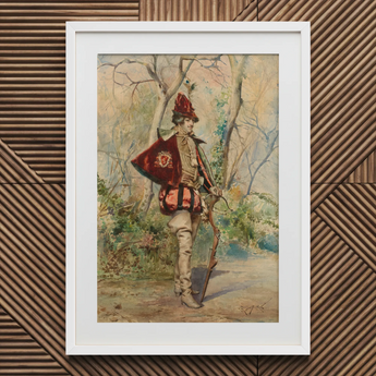 Mantello cremisi bordato di zibellino, fissato con una singola corda d'oro che brilla come se fosse parte dello scherzo. L'arco—non teso, non allacciato—riposa in una mano, floscio come un pettegolezzo. Ma il vero spettacolo inizia al cappello: feltro di carbone, tesa ampia e sfacciata, che erompe in una singola piuma di pavone così appuntita che rasenta la civetteria.