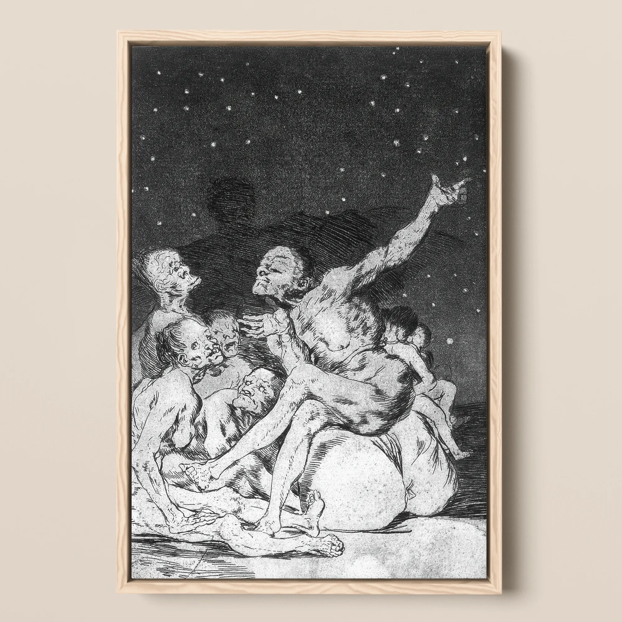 Under a cold firmament, superstition scatters like startled vermin. Goya unveils the absurdity of nocturnal faiths—witches clawing toward darkness as reason’s faint light begins to rise.