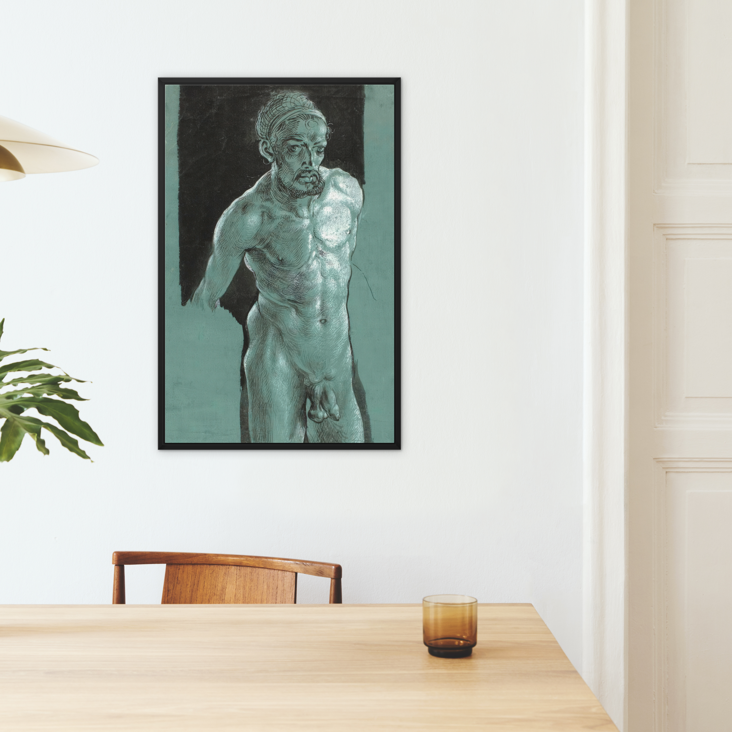 Un giovane Albrecht Dürer entra nella luce dello studio, ogni contorno scolpito dall'occhio di un incisore. Il fondo color teal raffredda la carne mentre un campo nero spinge in avanti il torso. La linea incrociata stringe il petto, si allenta lungo l'addome, poi si raccoglie all'anca come un respiro trattenuto troppo a lungo. L'altezza bianca si accende sul pettorale e sulla coscia.