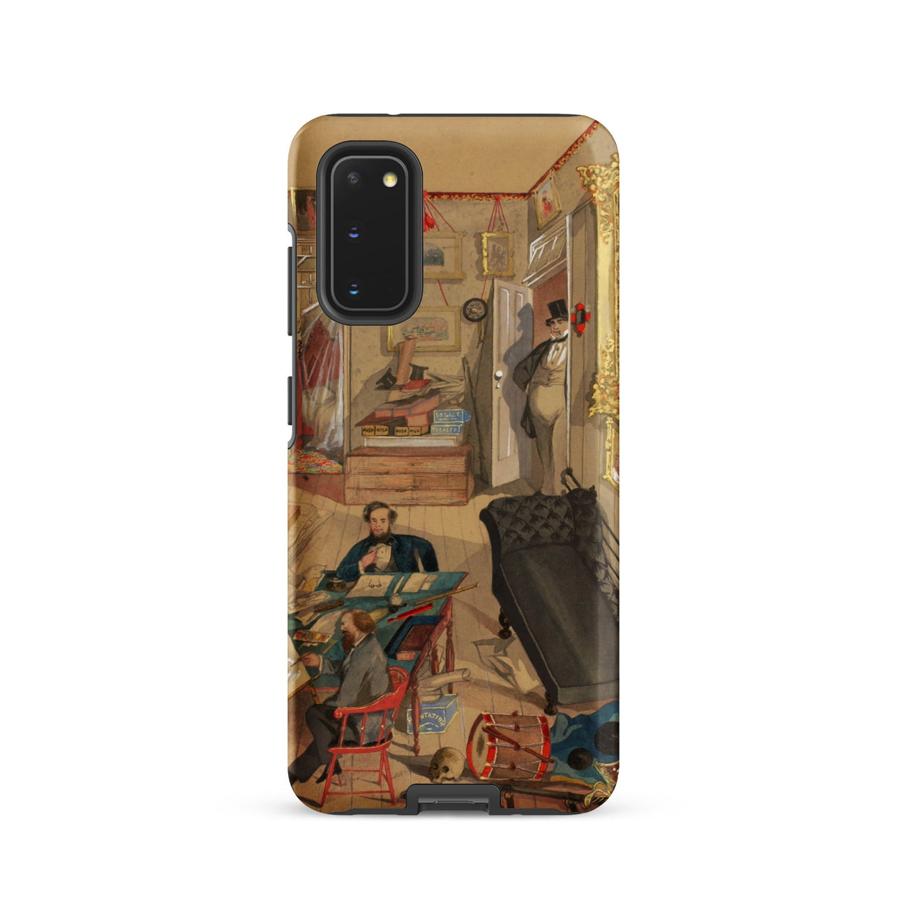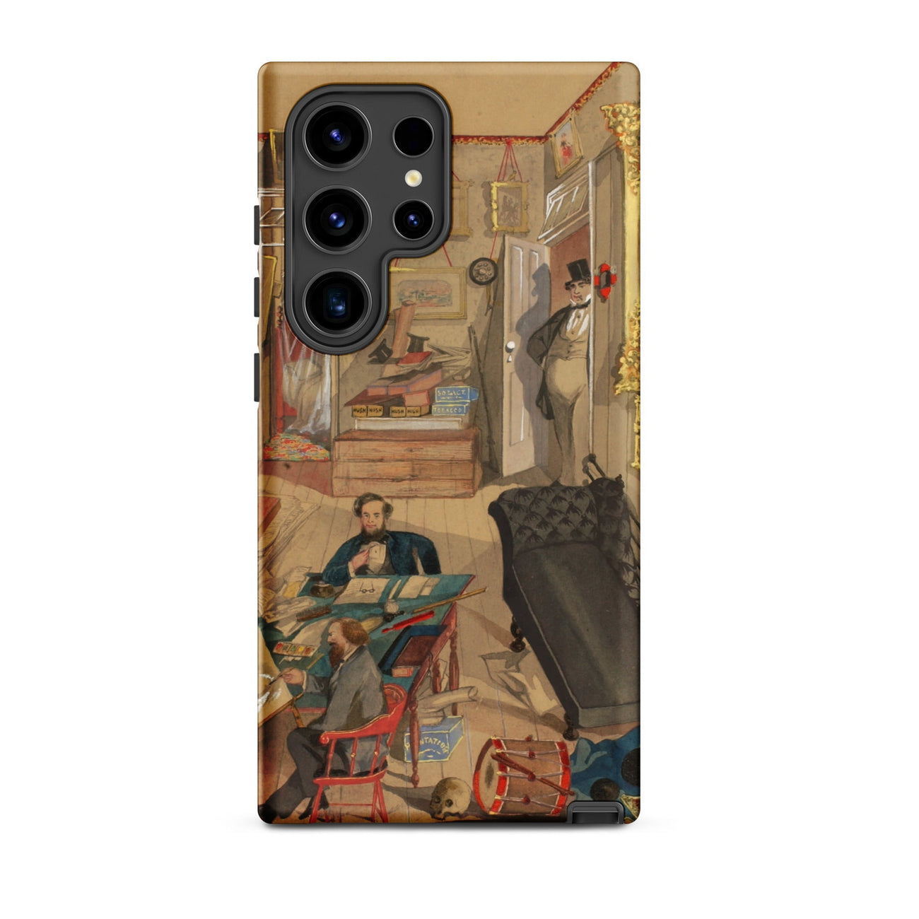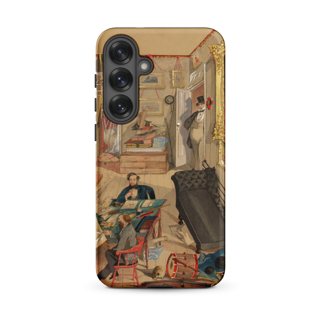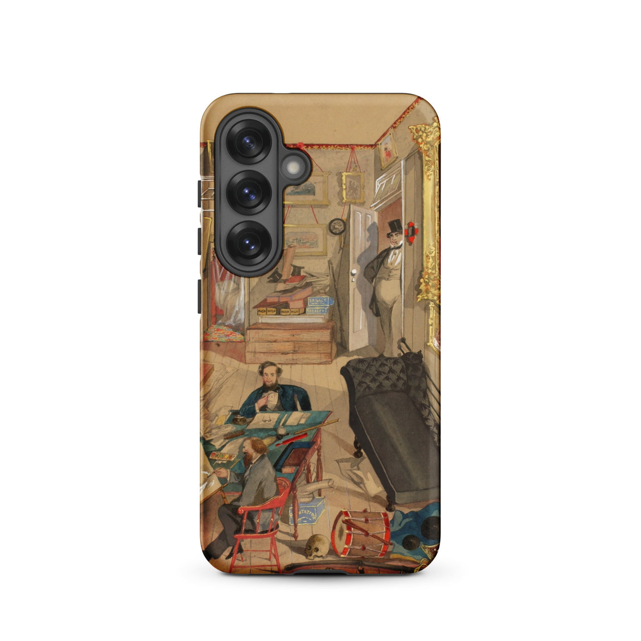La custodia Samsung avvolge il tuo dispositivo in questa reverie del XIX secolo, dove dita macchiate d'inchiostro tracciano nuovi mondi sotto la luce del gas e un elegante visitatore indugia sulla soglia. Le tavole di legno del pavimento ondeggiano con tessuti caduti e pagine sparse, mentre il divanetto nero invita a conversazioni clandestine.