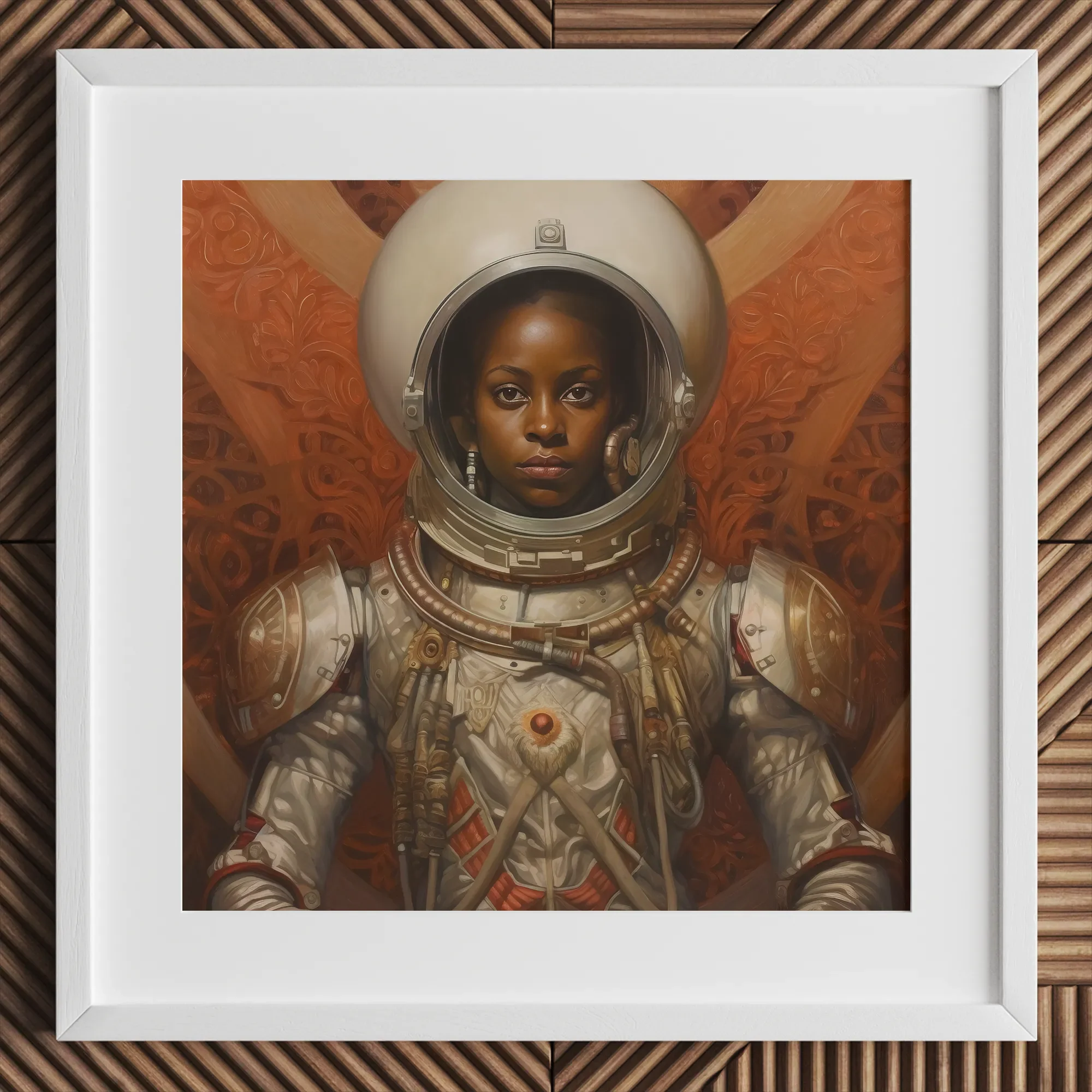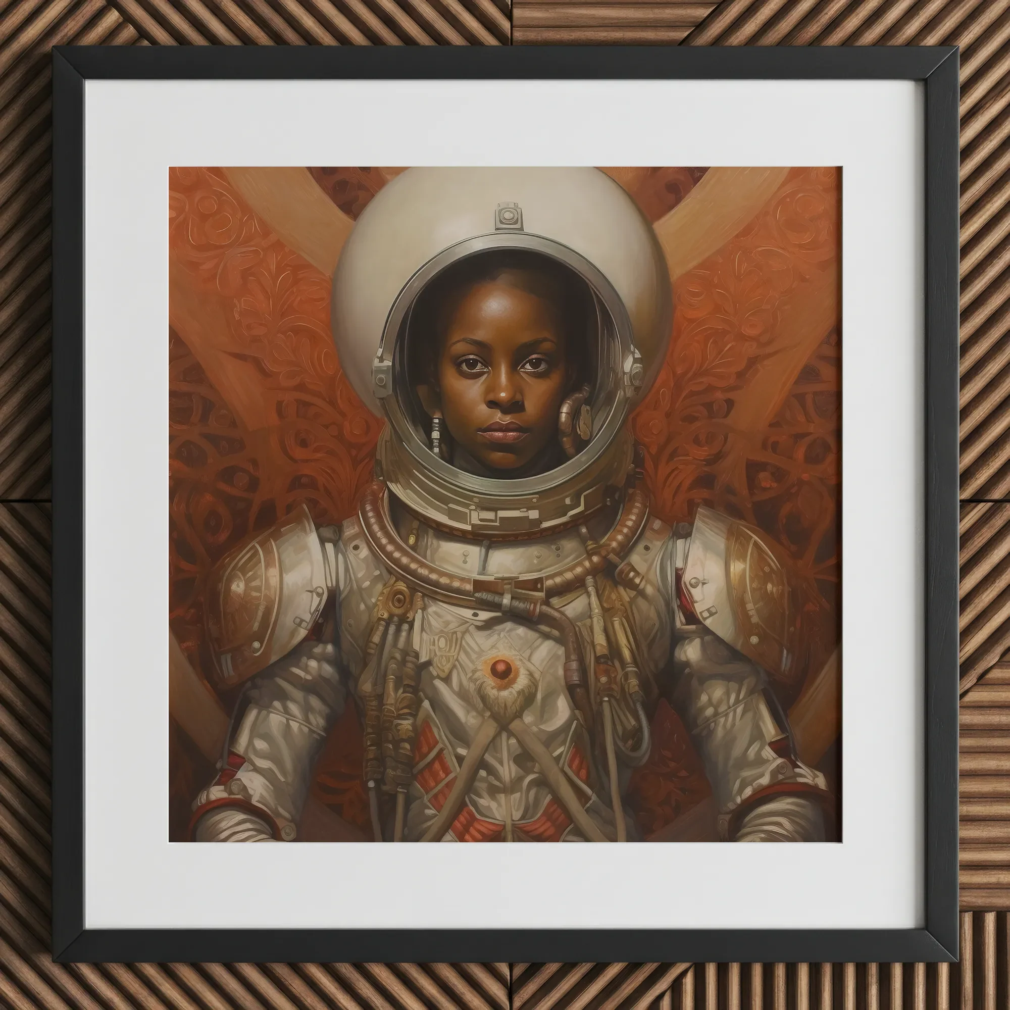 Ava si trova sulla soglia della polvere di stelle, in posa come una guardiana delle possibilità. L'afrofuturismo e la liberazione queer si intrecciano nella sua odissea celestiale, dove la gravità della storia si piega per far spazio alla sua traiettoria. Il suo casco brilla sotto le fiammate solari, riflettendo giustizia cosmica in un universo a lungo dominato dall'esclusione. È una fenice di sfida interstellare, un'astronauta lesbica nera che traccia percorsi attraverso le nebulose di narrazioni cancellate. Ogni pennellata è una testimonianza dell'iconografia fantascientifica nera, dove la resilienza ancestrale e l'astro-misticismo si scontrano.