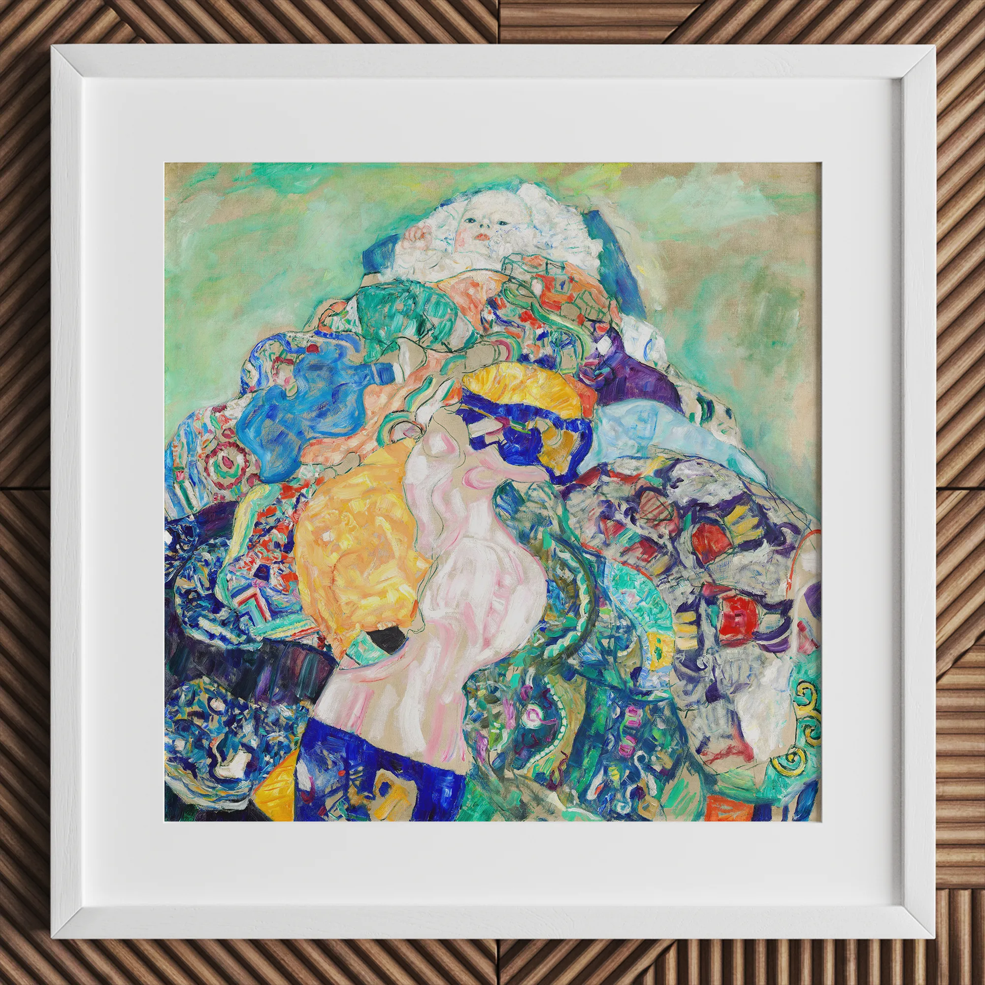 La tela esplode con una sinfonia cromatica: blu ceruleo, gialli allo zafferano e rossi vermilion turbinano attorno a un bambino cherubico, bozzolati in un labirinto di tessuti modellati. La meticolosa pennellata di Klimt crea un arazzo tattile, ogni colpo che pulsa con la vita. Il fascino dell'artista per i mosaici bizantini si manifesta in accenti dorati luccicanti, infondendo la composizione con una luminosità ultraterrena.