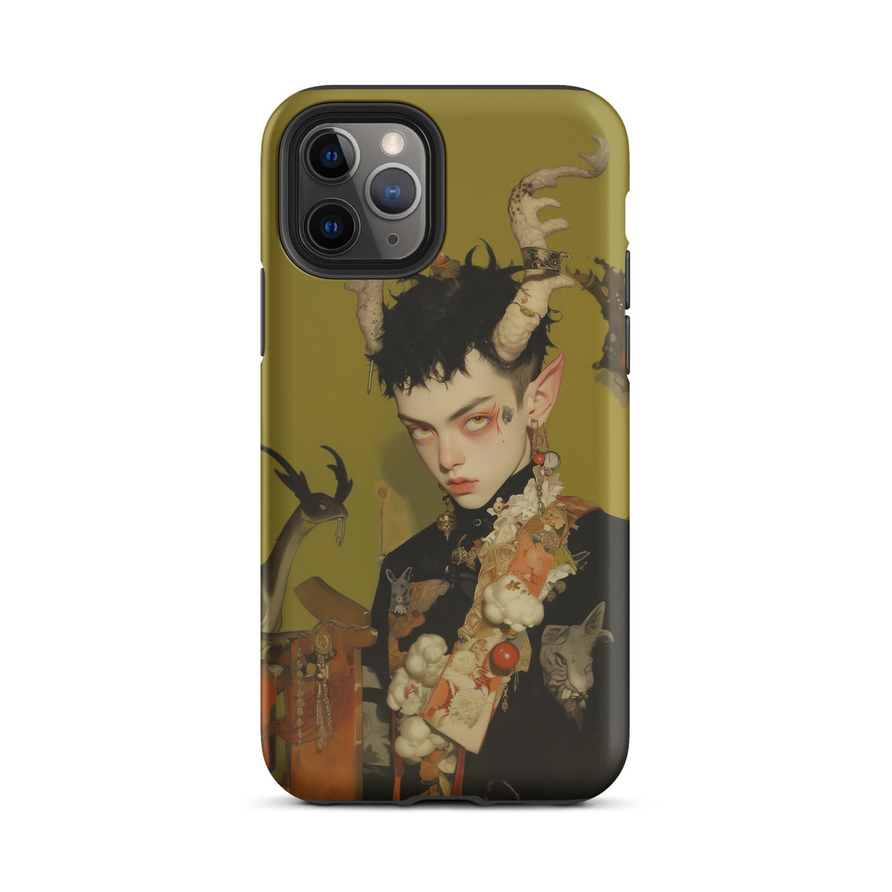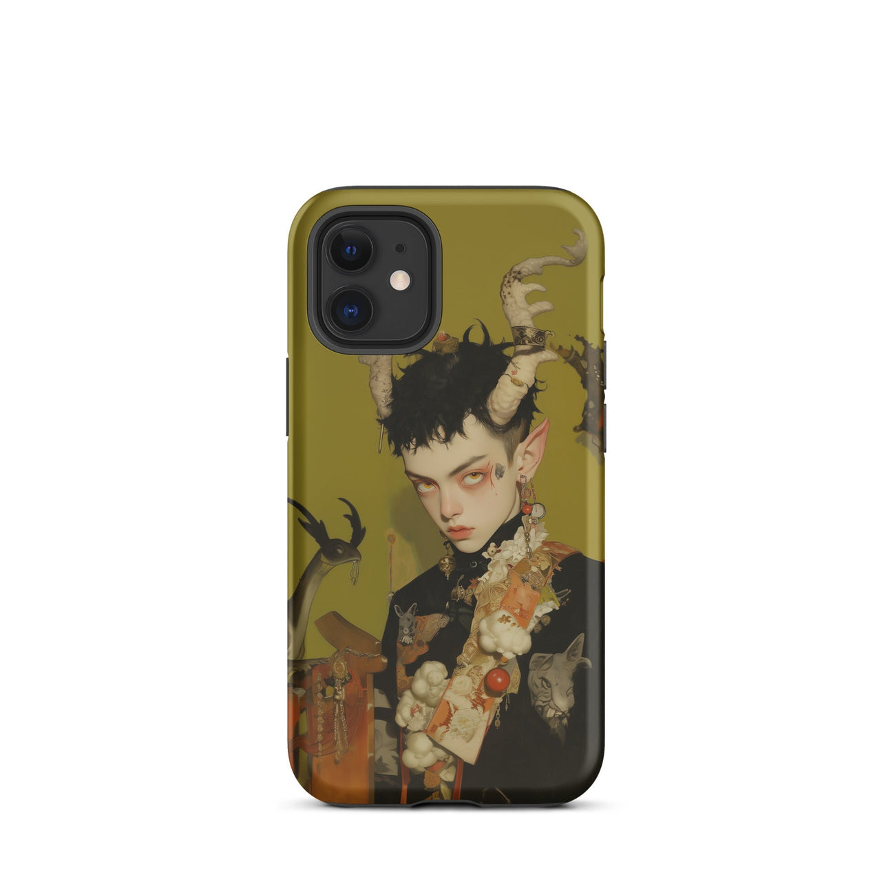 Quando tieni questa custodia per iPhone nel palmo della mano, si dispiega un mondo inquietante—un regno etereo dove la progenie di Bafometto regna suprema. Questo empio bambino demoniaco gay, catturato in dettagli meticolosi, scruta attraverso l'abisso. La sua sinistra silhouette avvolta in colori gotici scuri e smorzati che echeggiano antichi riti occulti.